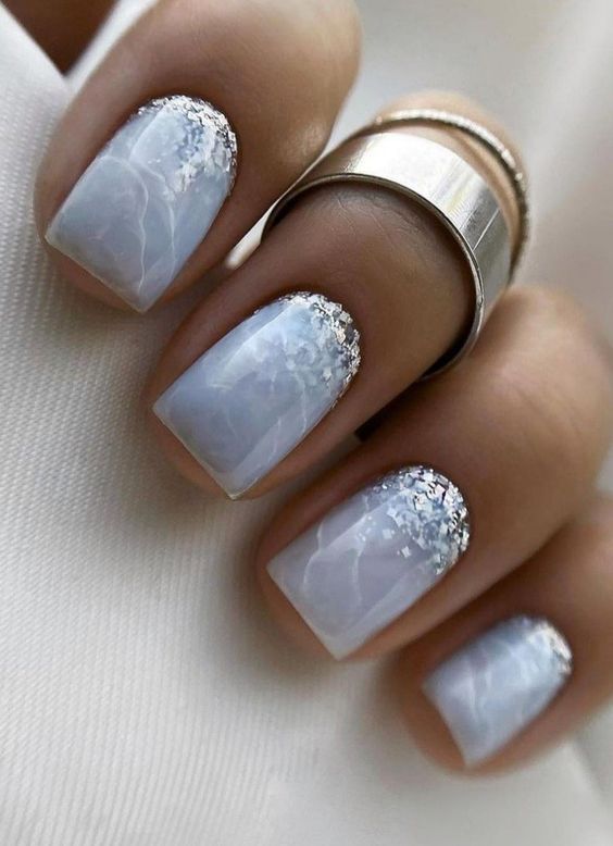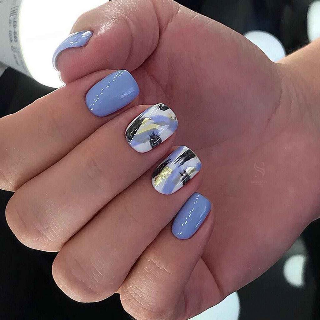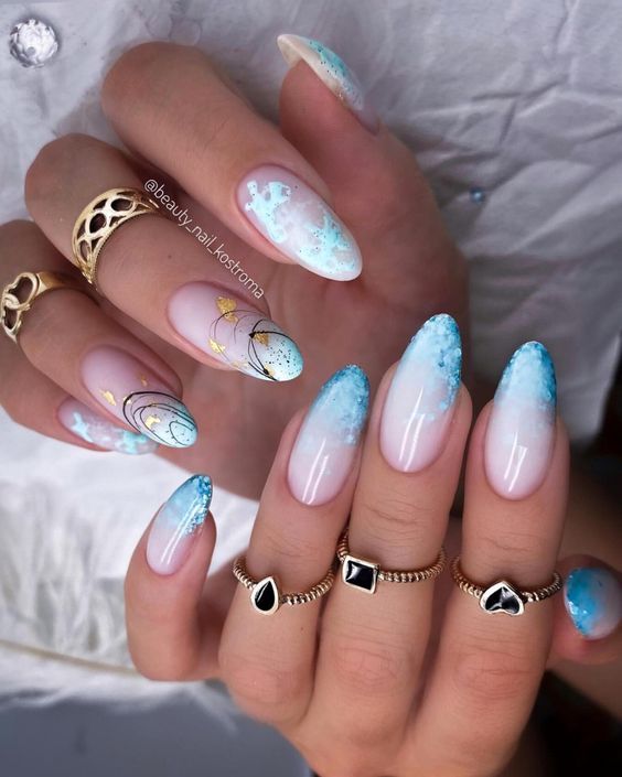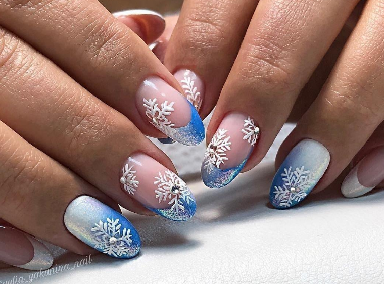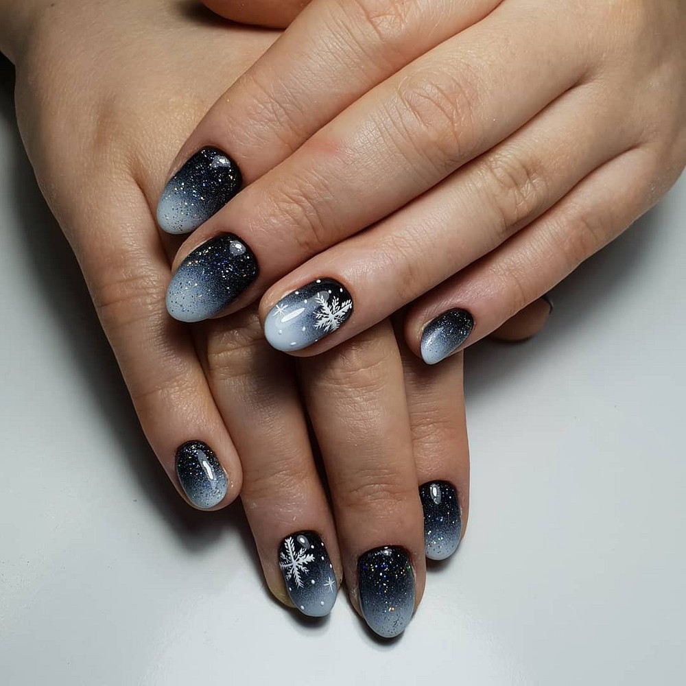 Традиционный дизайн омбре трансформируется в мазки краски. В январе это некий микс. Мастера предлагают повторить на ногтях январскую метель и пургу. И это не значит, что нужно использовать только белые и голубые цвета. Холодной ночью метель играет тысячами красок. При этом она сверкает и переливается.