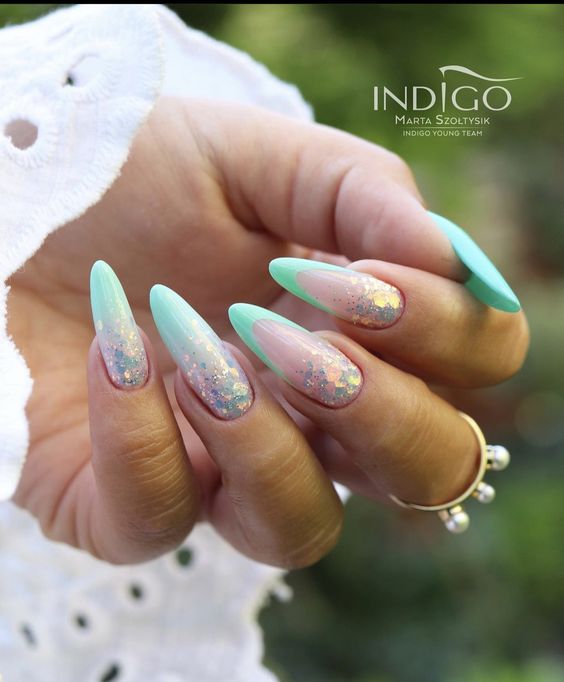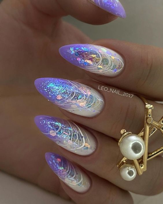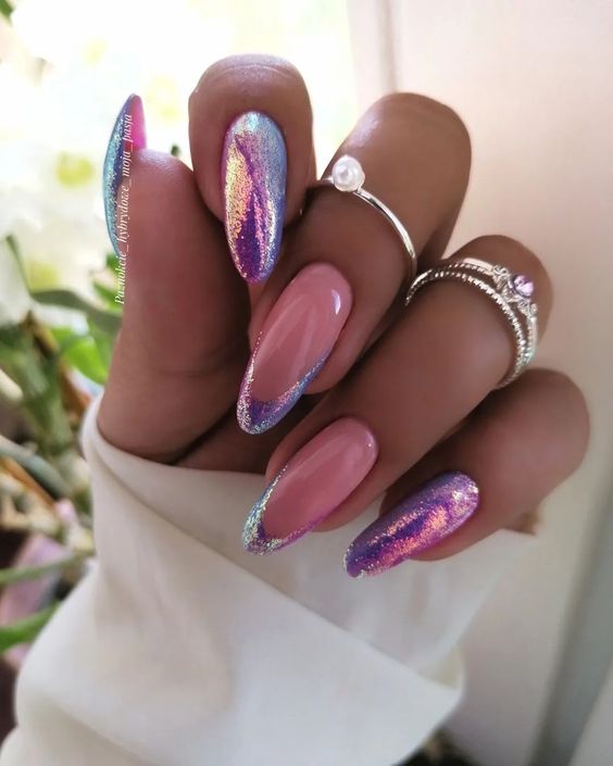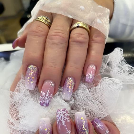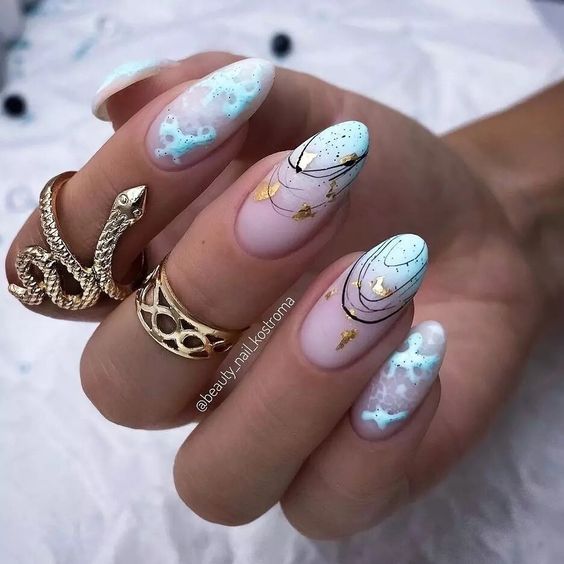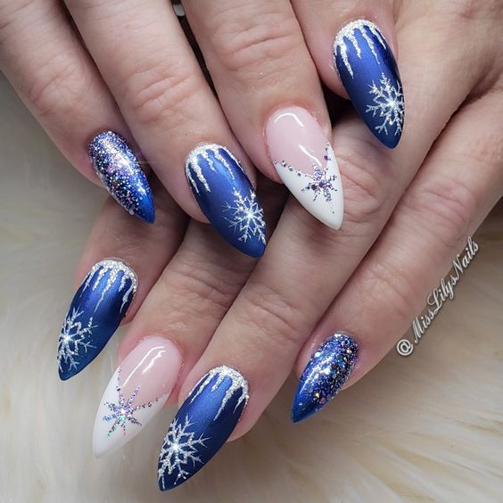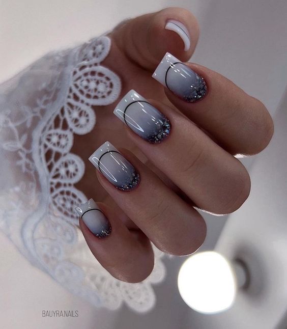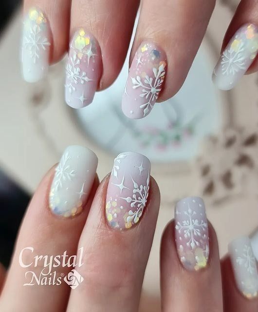 Традиционный дизайн омбре трансформируется в мазки краски. В январе это некий микс. Мастера предлагают повторить на ногтях январскую метель и пургу. И это не значит, что нужно использовать только белые и голубые цвета. Холодной ночью метель играет тысячами красок. При этом она сверкает и переливается.