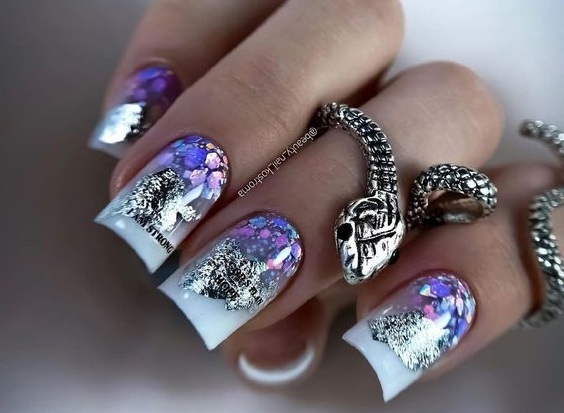 В январе френч, конечно же, актуален, но не находится в лидерах. В этот период рекомендуется делать цветной или блестящий френч. Интересная идея — металлический французский маникюр. Его можно дополнять рисунками, узорами, звездами, наклейками и любым другим видом декора.