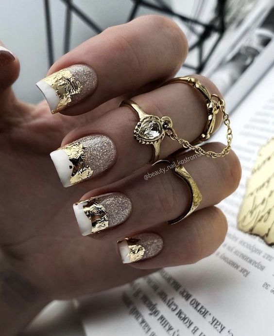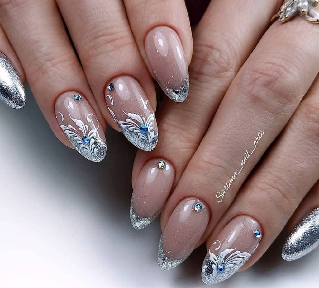Те, кому немного надоел французский дизайн, могут обратить внимание на обратный френч — с оформлением лунок. Январский дизайн должен быть необычным. Откажитесь от оформления лунки по ее природной линии. Придумайте необычный дизайн вместе с мастером, используя металлические оттенки.