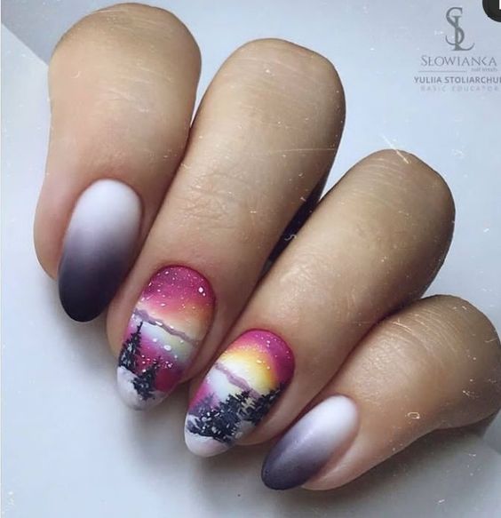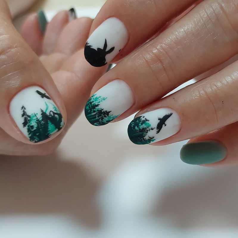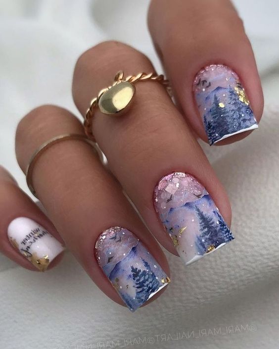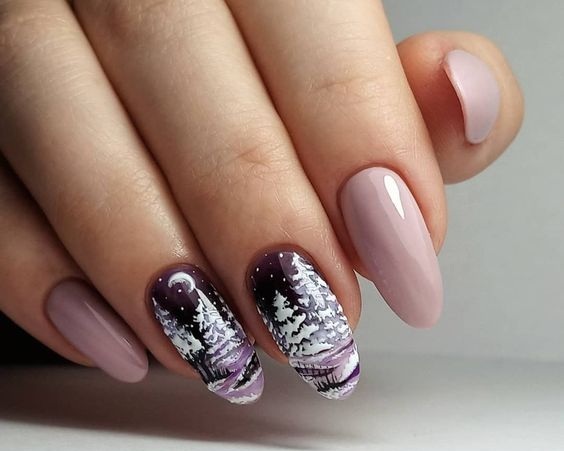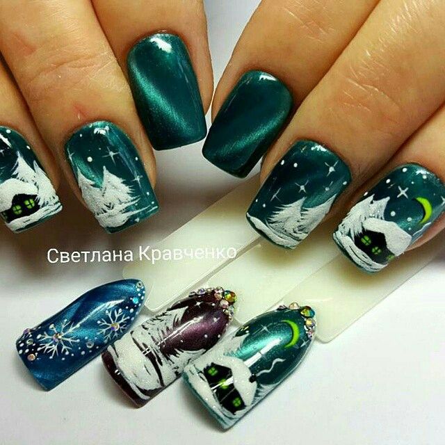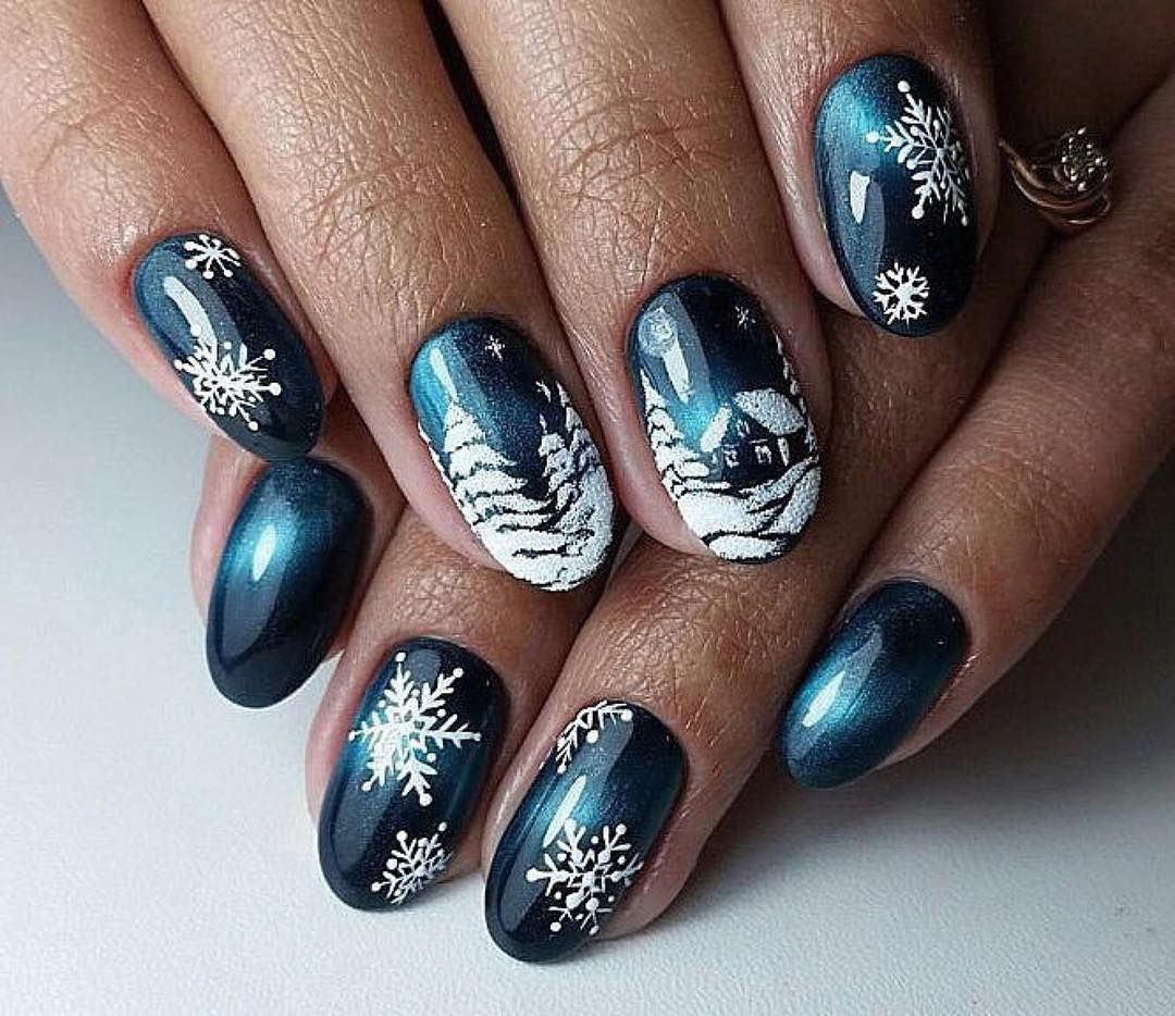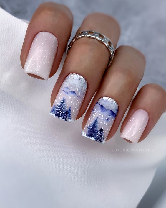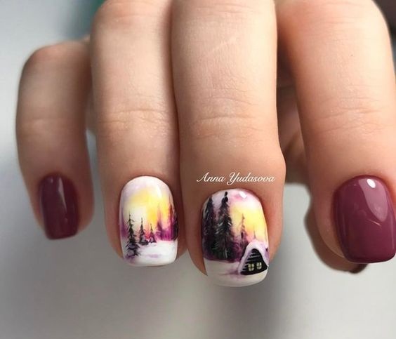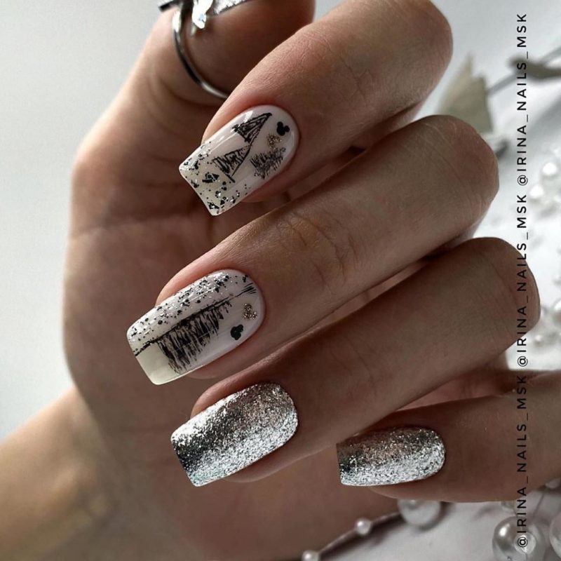 Планируете делать маникюр с елочкой самостоятельно? Выбирайте наклейки. Такой маникюр может быть очень разнообразным — от дизайна в стиле минимализм до красивых зимних пейзажей, которые напоминают картины.