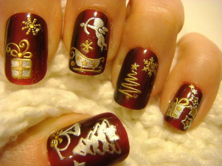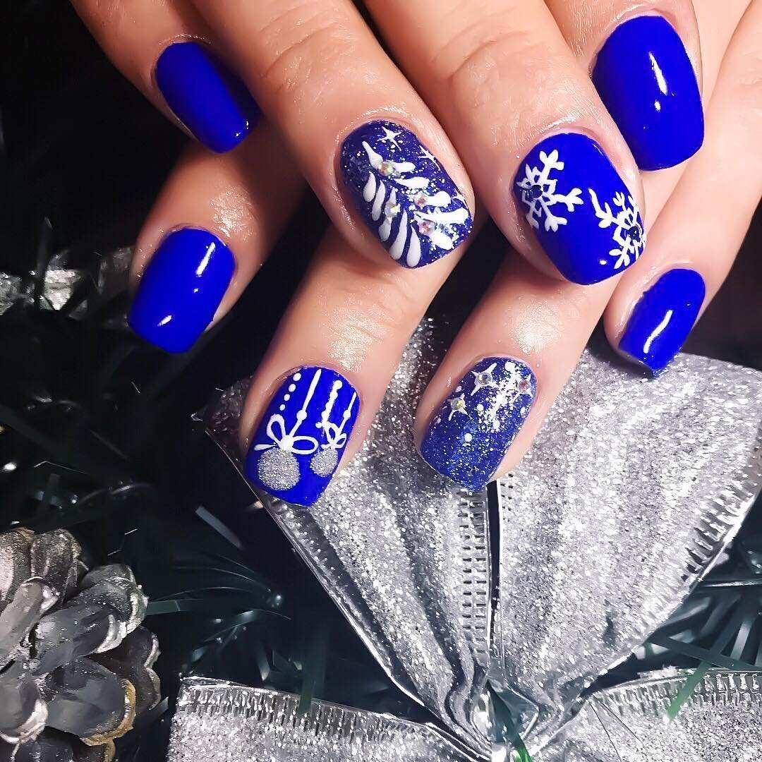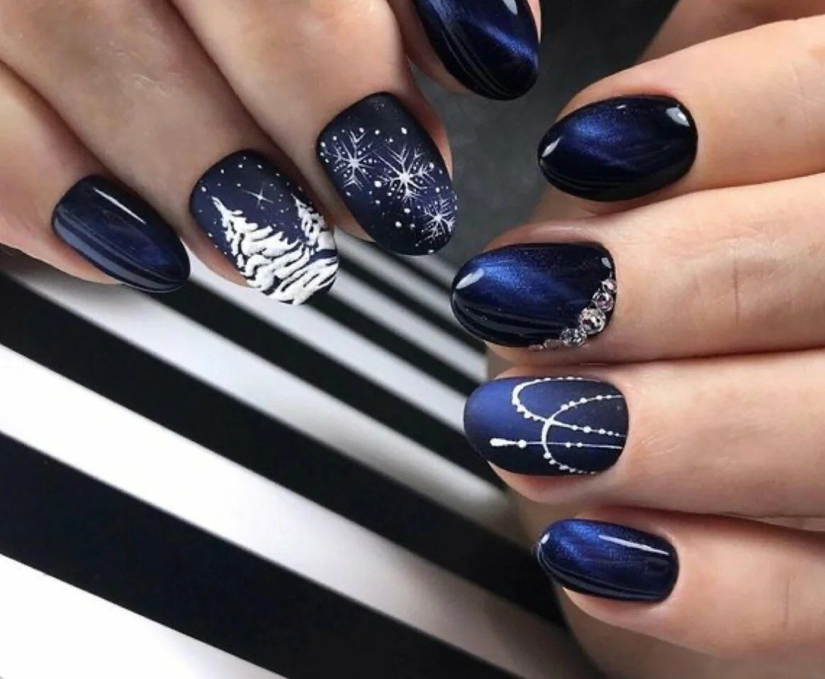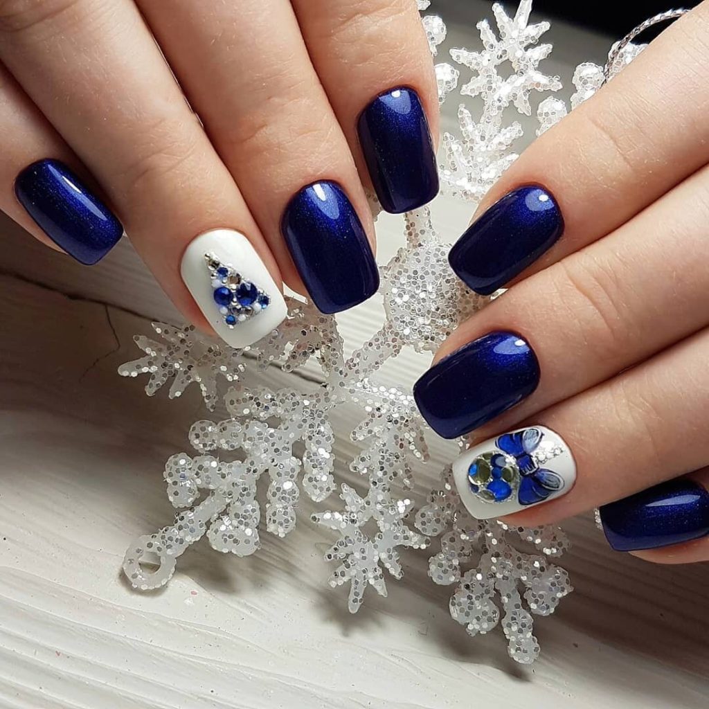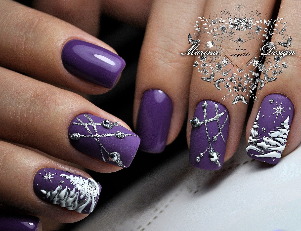 Те, кто предпочитает строгие формы и современный дизайн, стоит обратить внимание на вариант с использованием специального стемпа. Такой маникюр делается быстро и просто. Главное здесь — актуальные цветовые сочетания. Например, матовый черный маникюр с золотистыми елочками и другими атрибутами праздника. Актуален и синий маникюр с серебристыми деталями. Решать вам, главное — маникюр должен вписываться в ваш повседневный и праздничный образ.