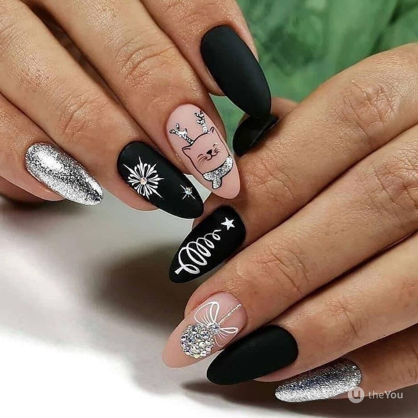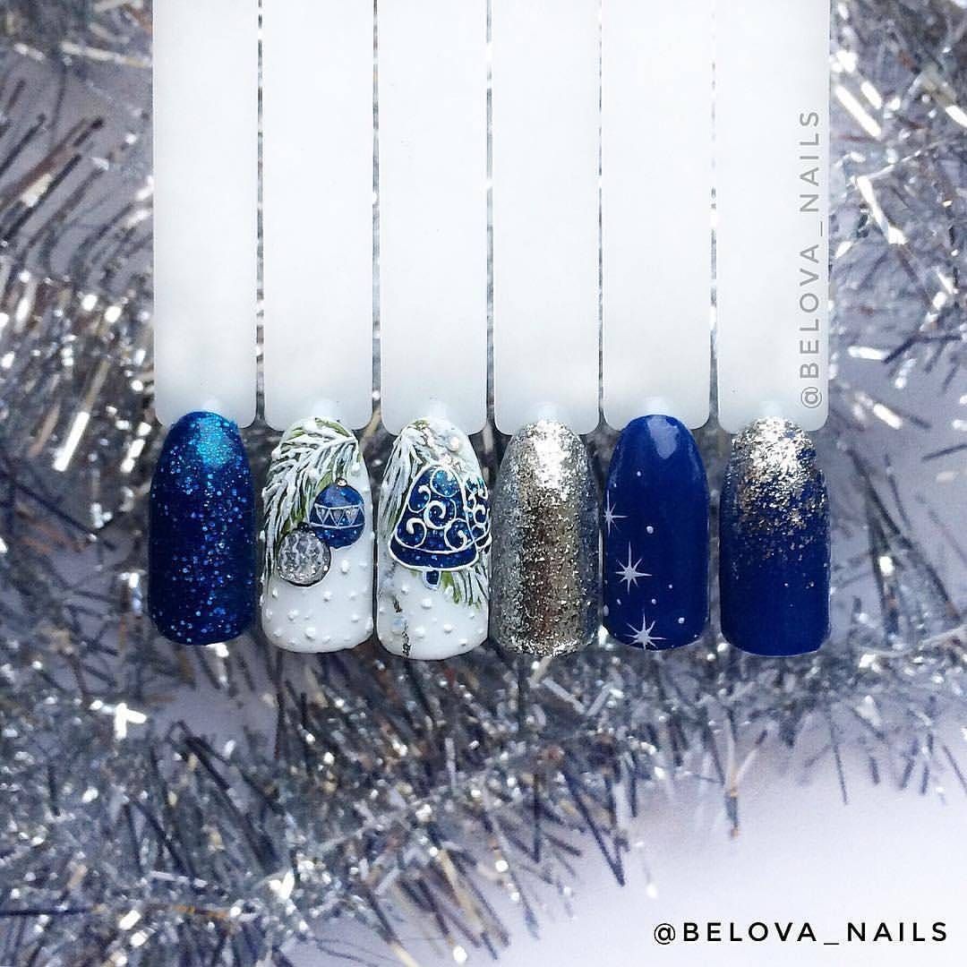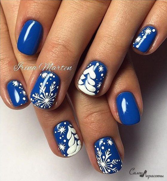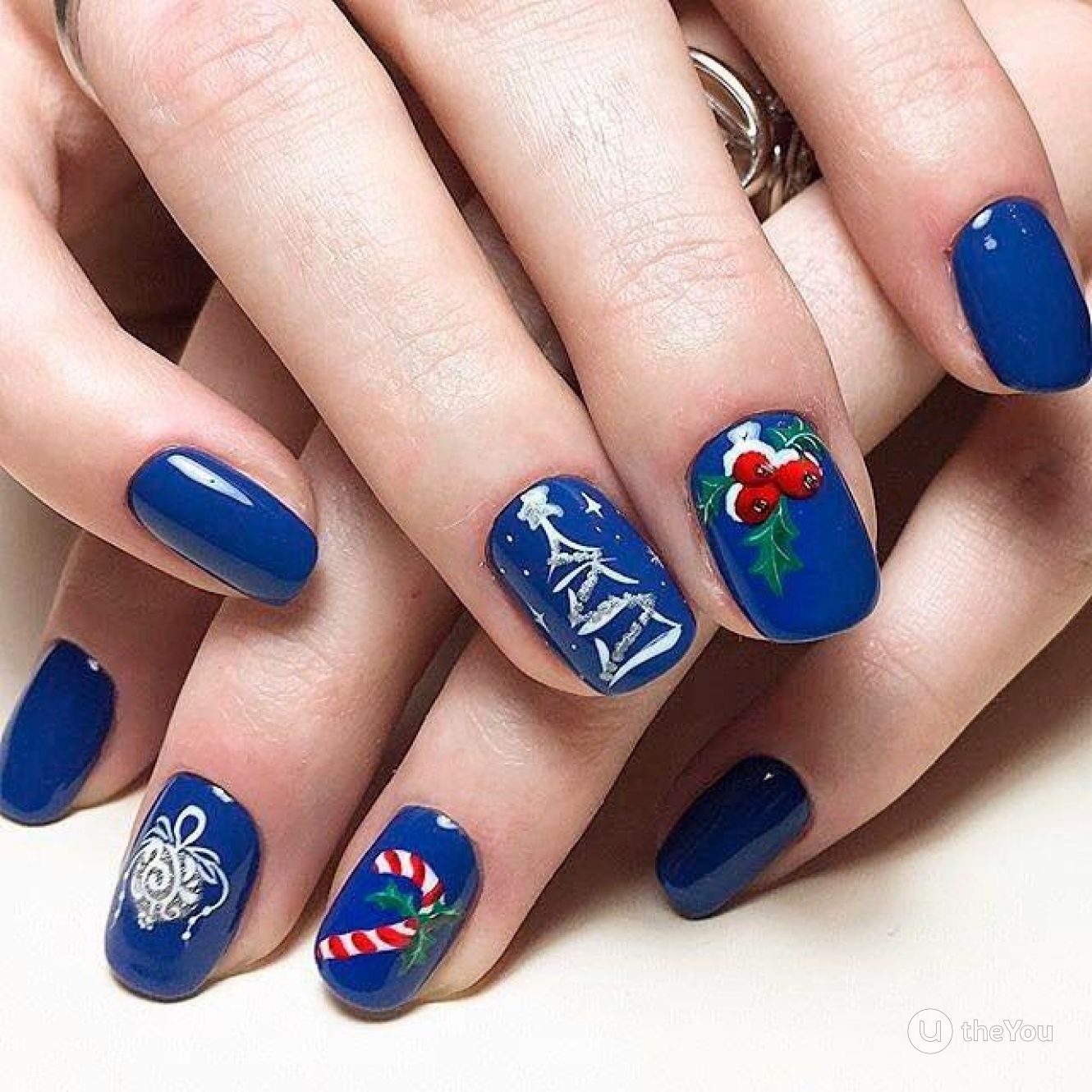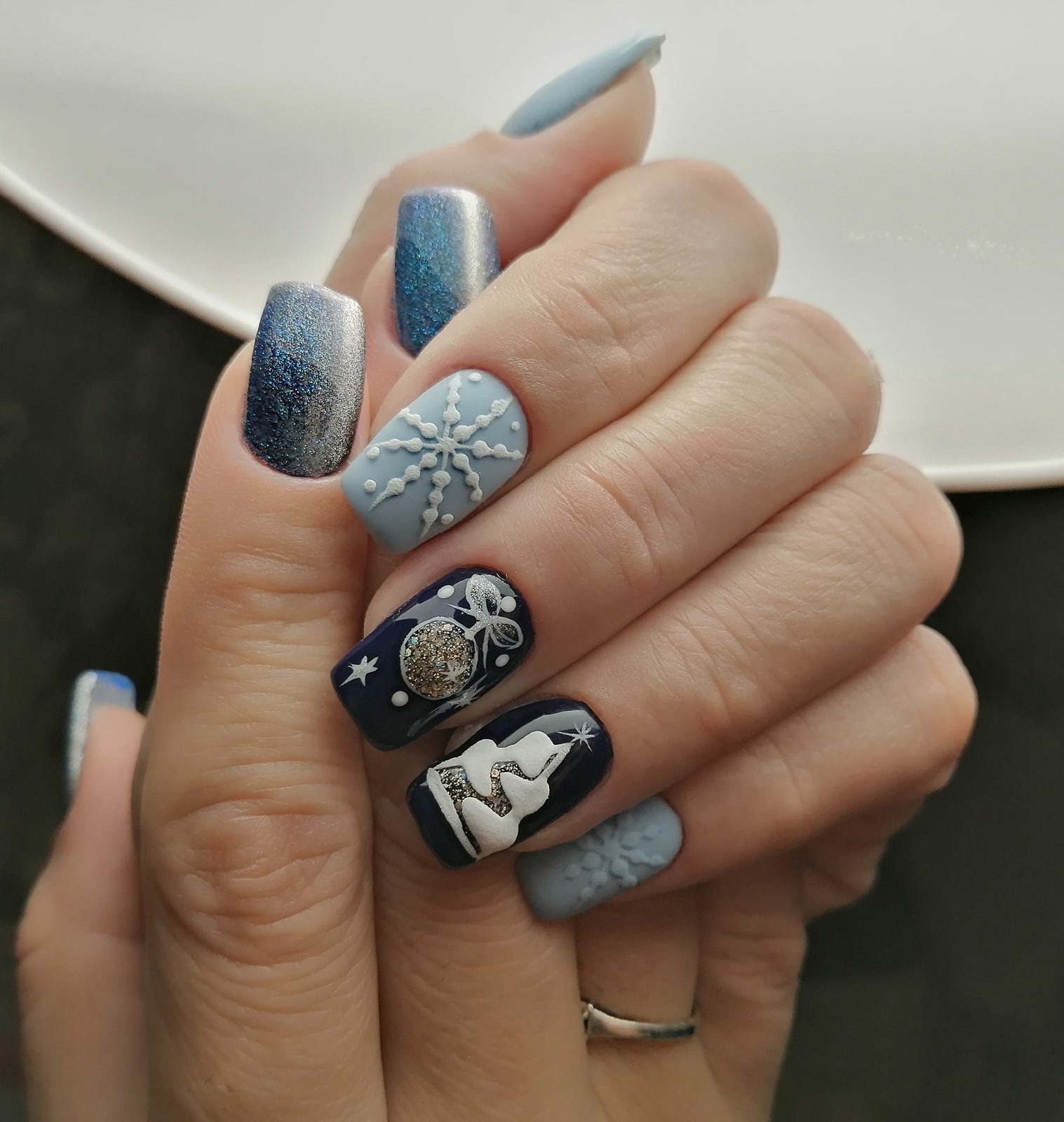Те, кто предпочитает строгие формы и современный дизайн, стоит обратить внимание на вариант с использованием специального стемпа. Такой маникюр делается быстро и просто. Главное здесь — актуальные цветовые сочетания. Например, матовый черный маникюр с золотистыми елочками и другими атрибутами праздника. Актуален и синий маникюр с серебристыми деталями. Решать вам, главное — маникюр должен вписываться в ваш повседневный и праздничный образ.