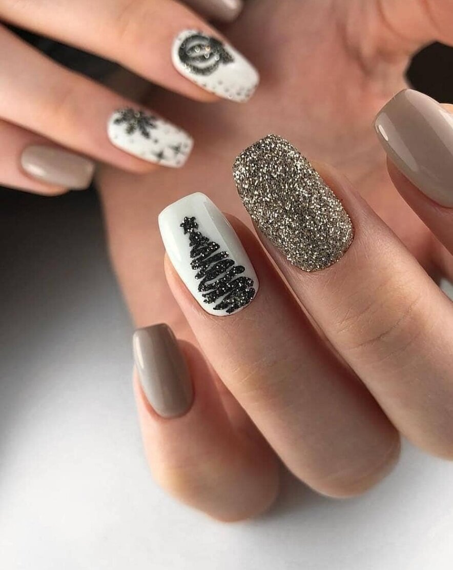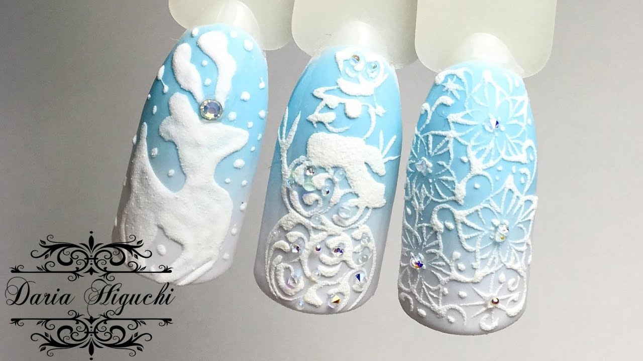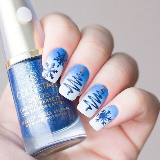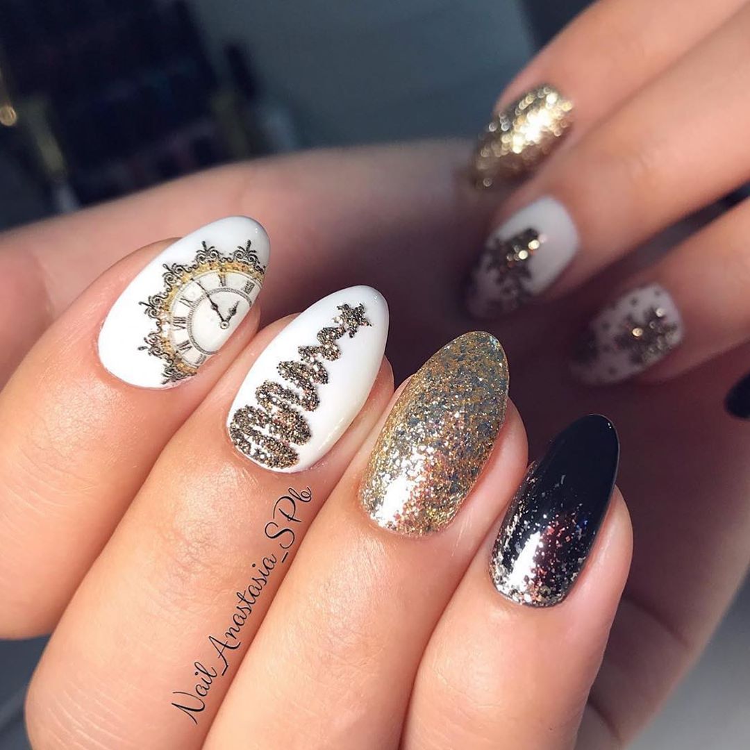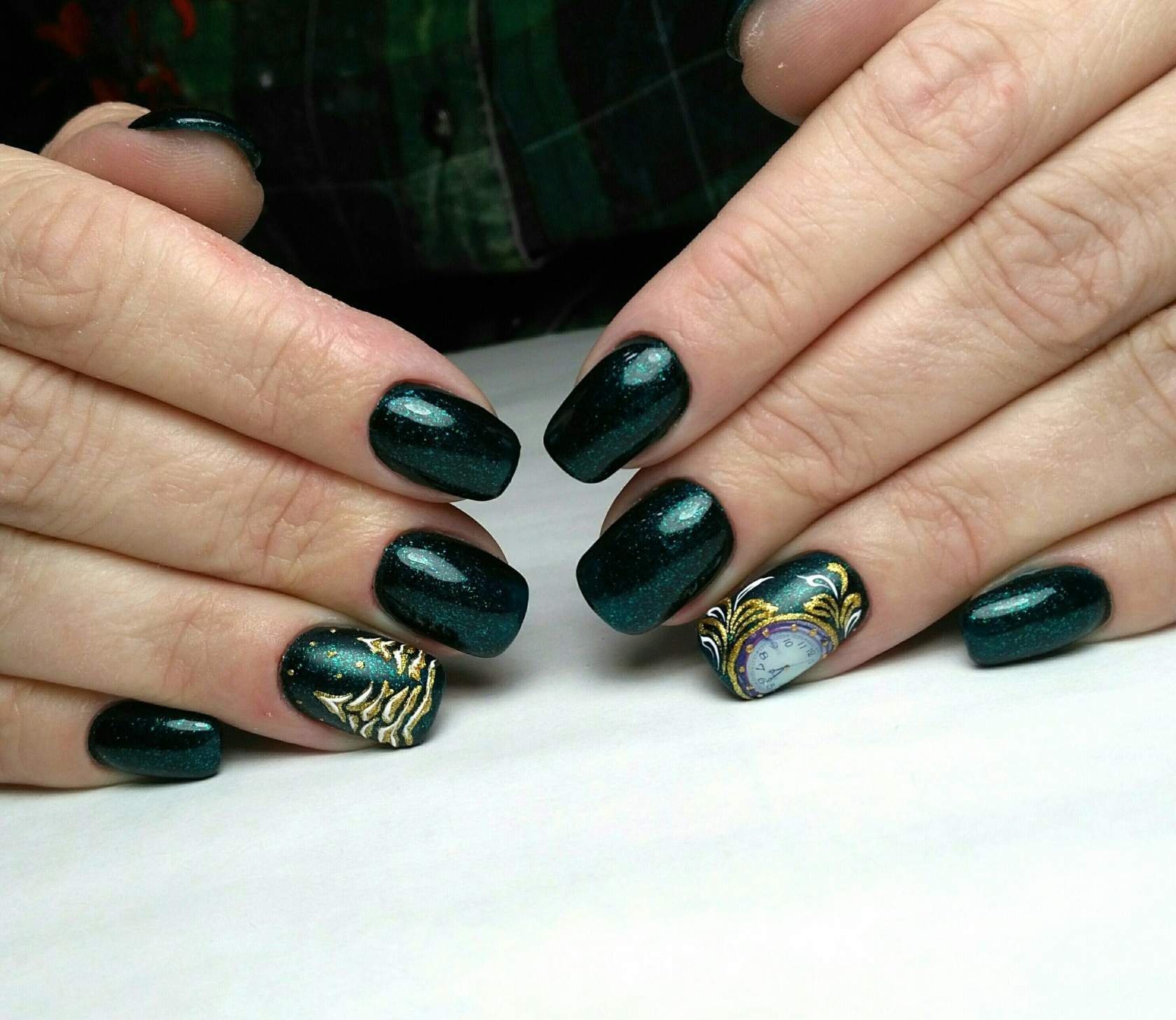Те, кто предпочитает строгие формы и современный дизайн, стоит обратить внимание на вариант с использованием специального стемпа. Такой маникюр делается быстро и просто. Главное здесь — актуальные цветовые сочетания. Например, матовый черный маникюр с золотистыми елочками и другими атрибутами праздника. Актуален и синий маникюр с серебристыми деталями. Решать вам, главное — маникюр должен вписываться в ваш повседневный и праздничный образ.