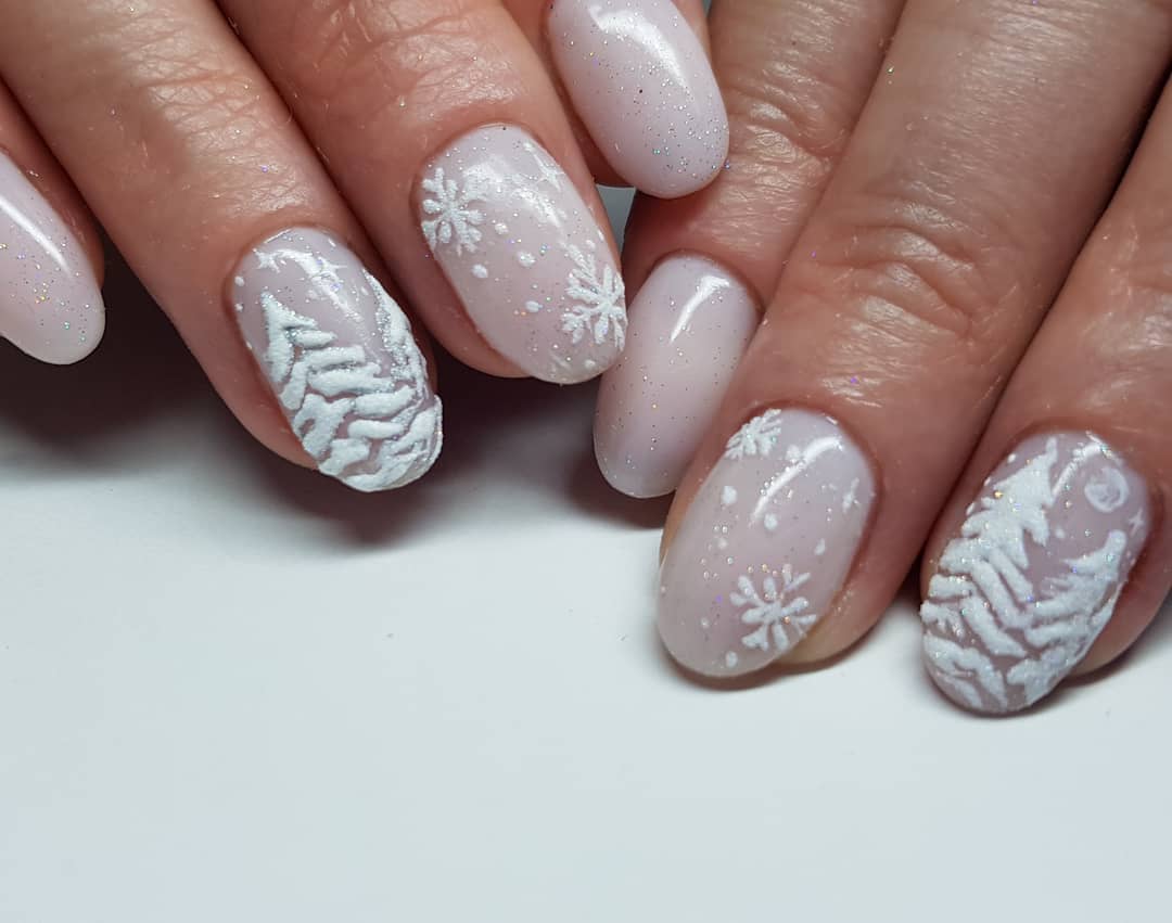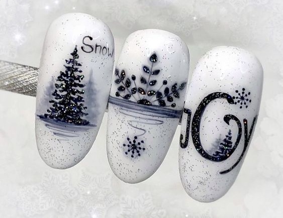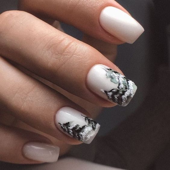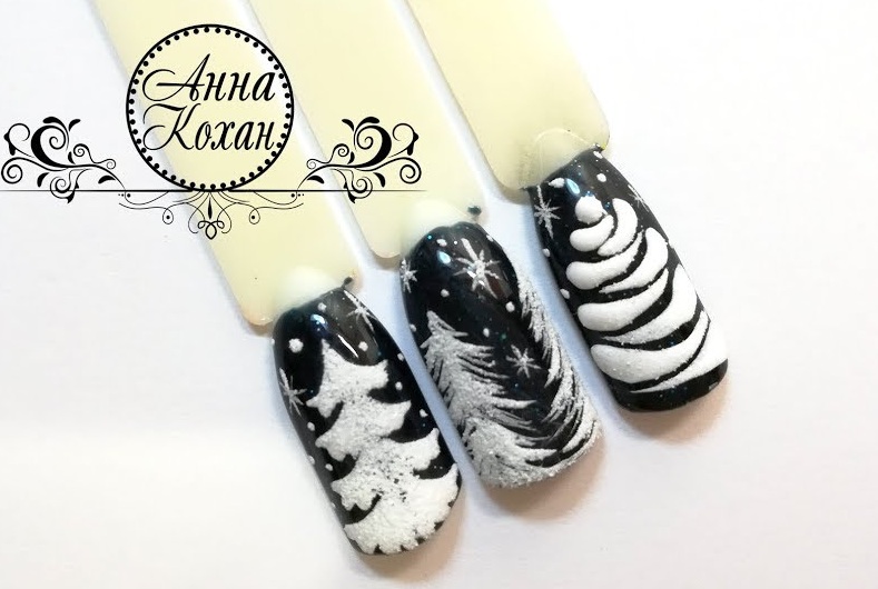 Мы уже отмечали, что рисовать елочку на ногтях можно разными цветами. Но не только оттенок, а еще и текстура елки может быть разной. Почему бы не сделать ее белой и снежной? Так у вас получится создать эффект новогоднего леса, где стоят эти заснеженные пушистые красавицы. Для фона лучше выбрать темный оттенок лака, а вот елочки акриловой пудрой или песком лучше рисовать контрастными.