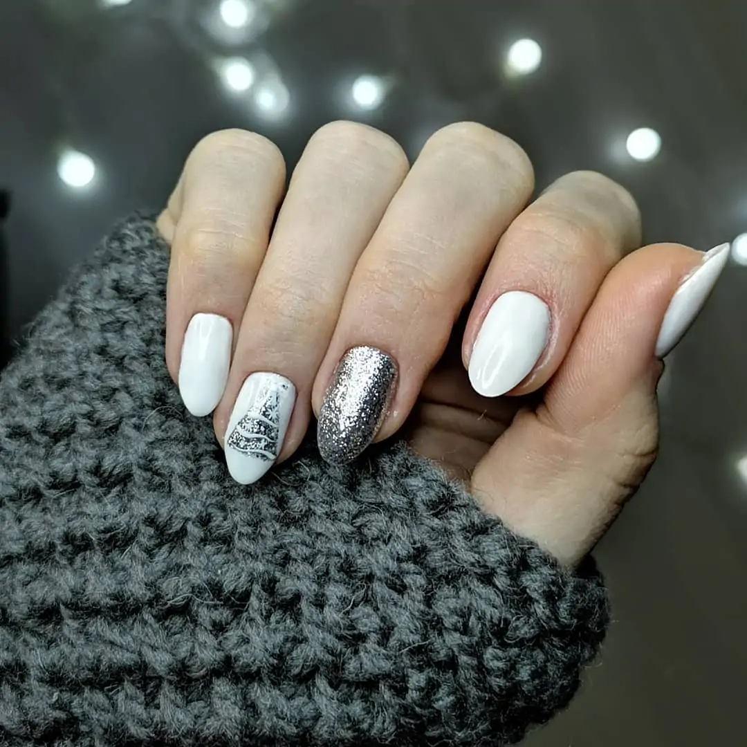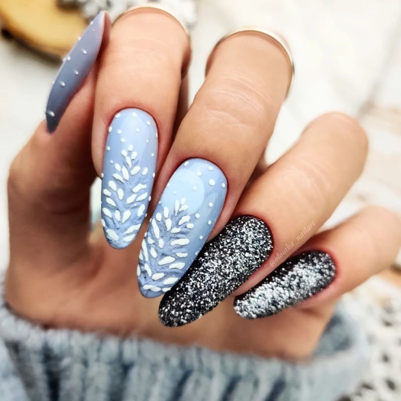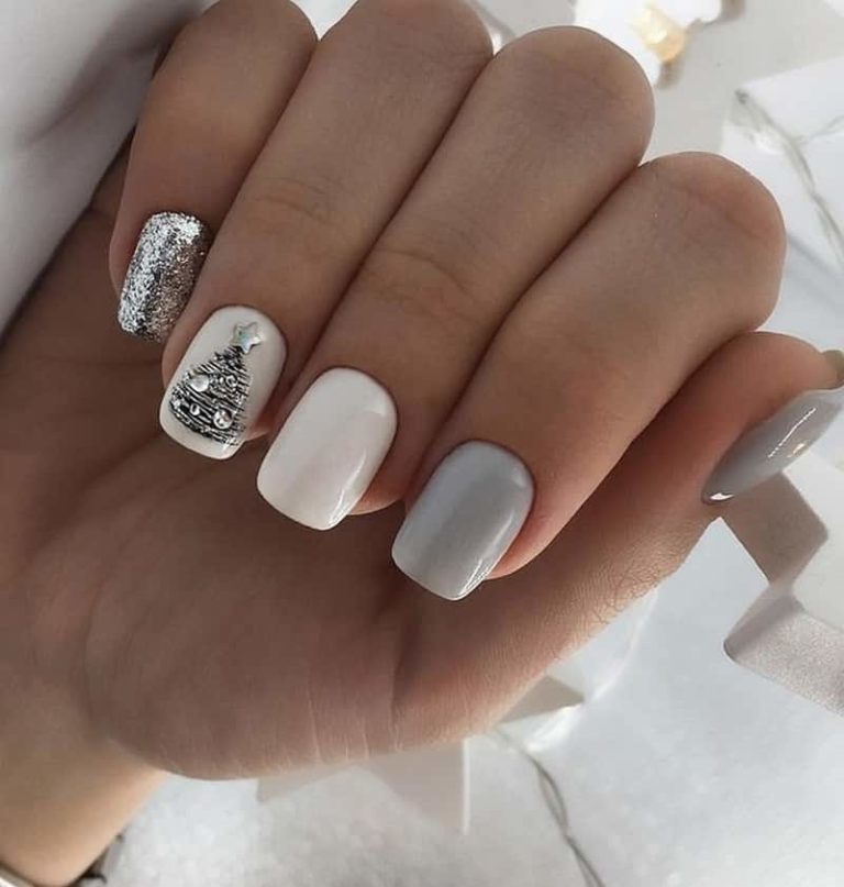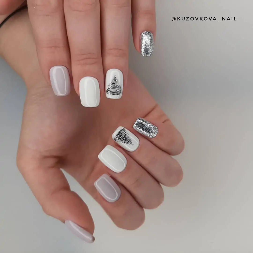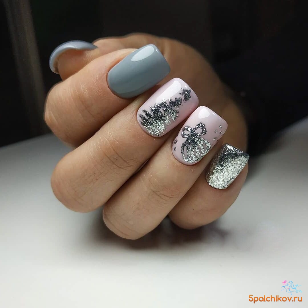 Холодный серебристый цвет, создающий впечатление снежинок и добавляющий маникюру стойкую элегантность.