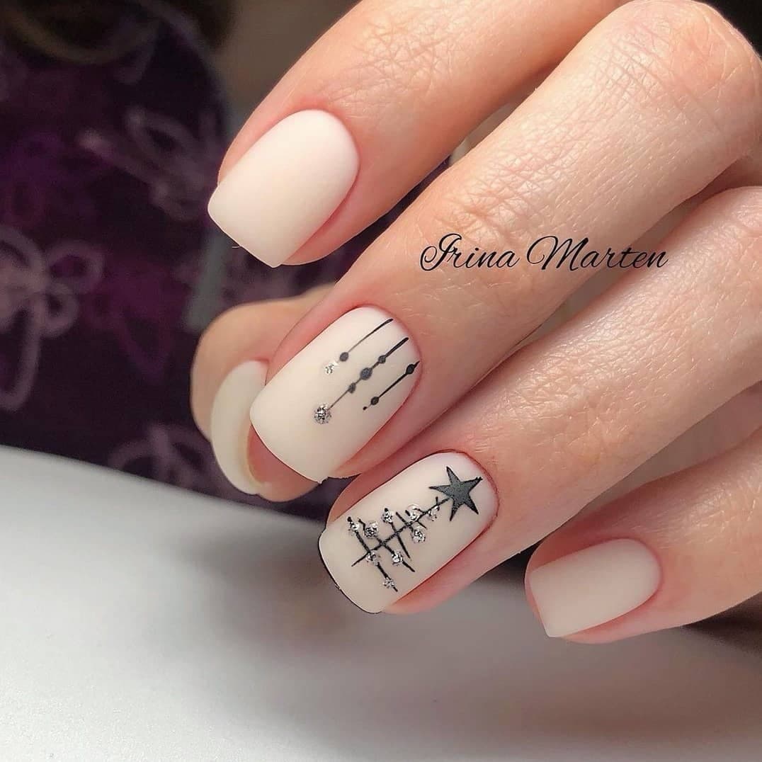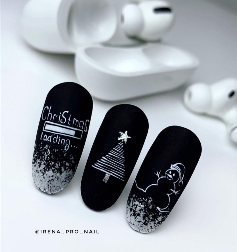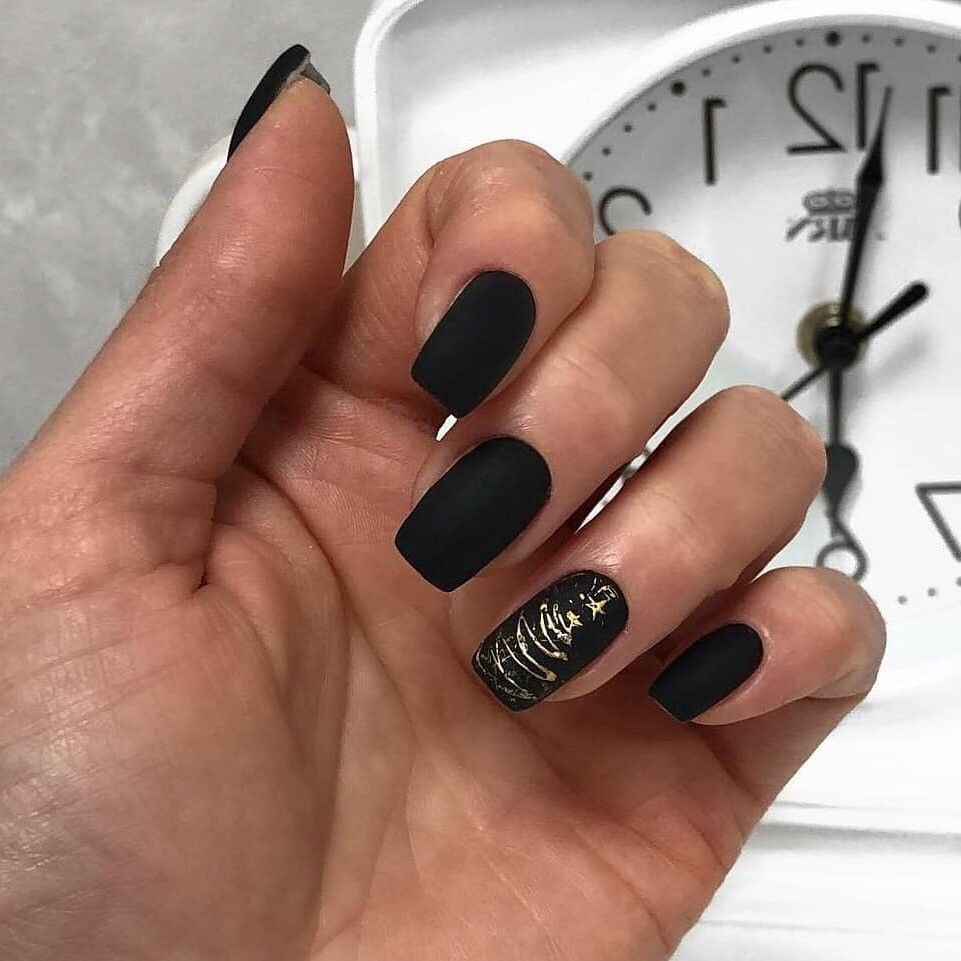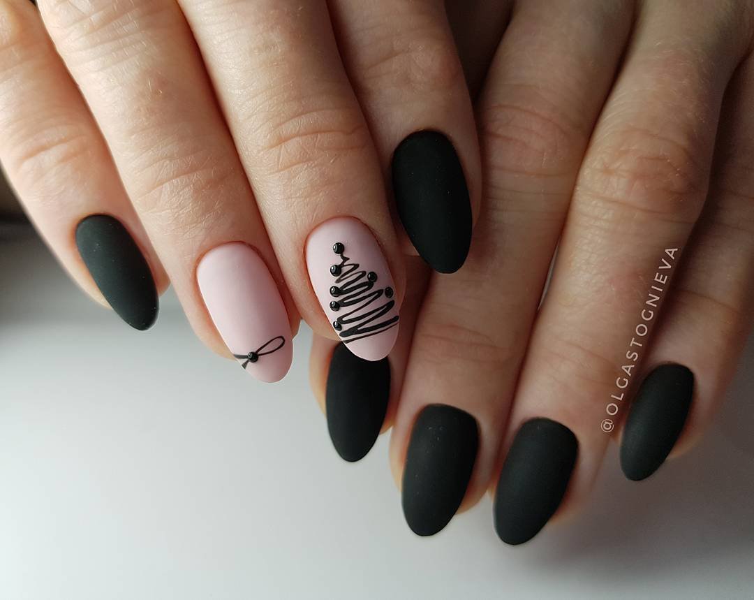 Многие считают этот оттенок слишком мрачным для новогоднего дизайна ногтей, но уверяем вас — очень стильно смотрится черное матовое покрытие, на котором золотом нарисована красивая елочка.
