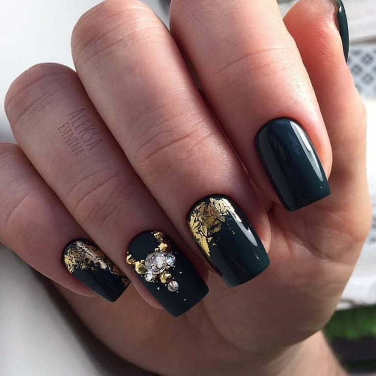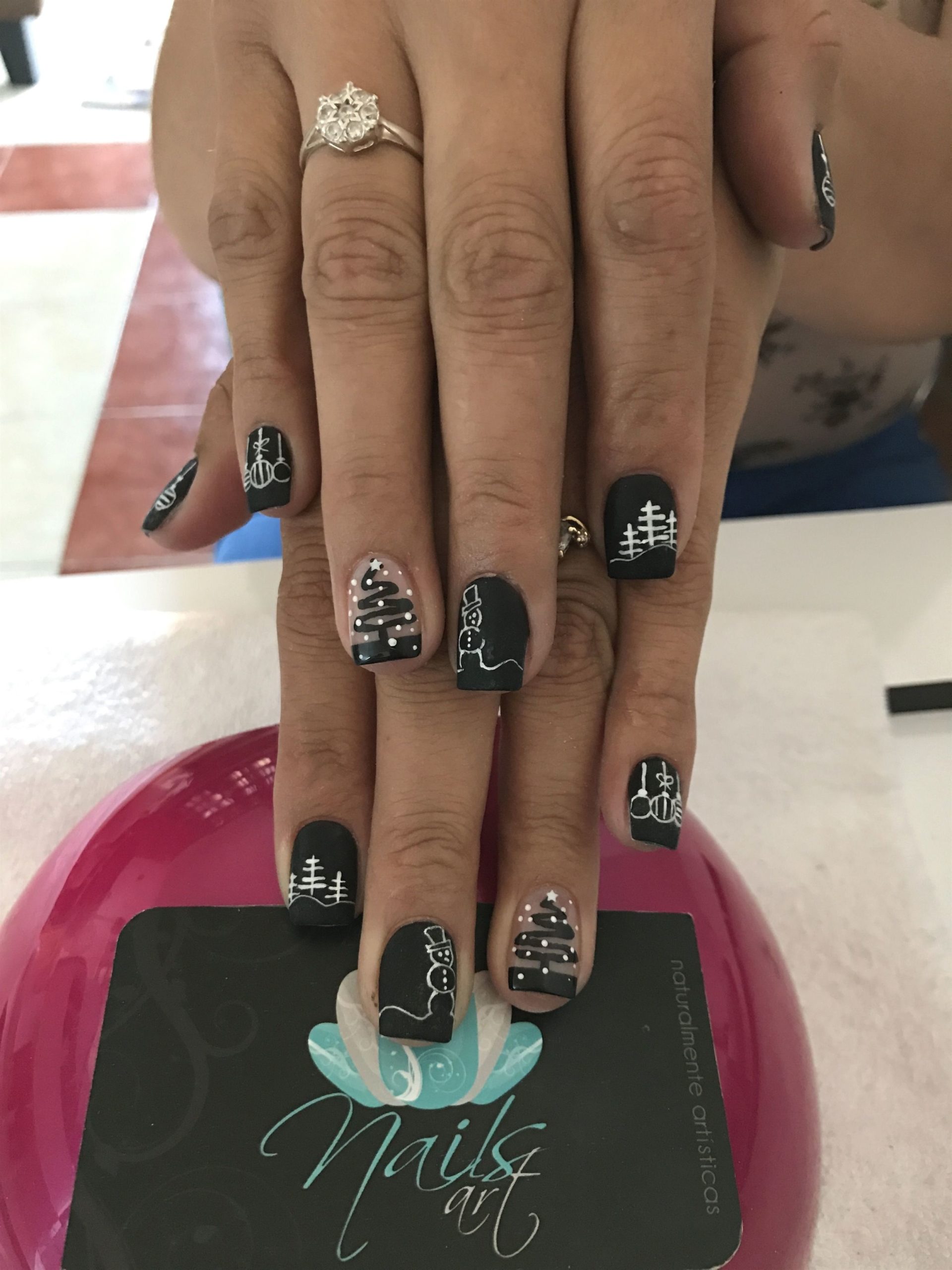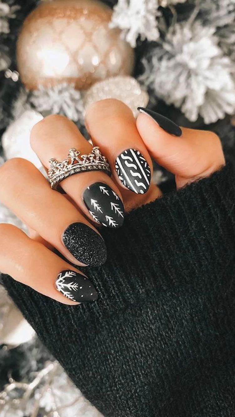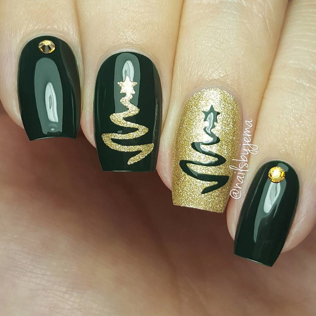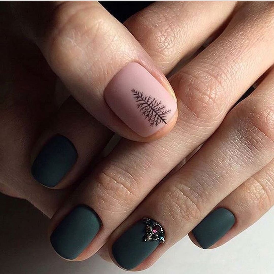 Многие считают этот оттенок слишком мрачным для новогоднего дизайна ногтей, но уверяем вас — очень стильно смотрится черное матовое покрытие, на котором золотом нарисована красивая елочка.