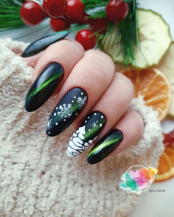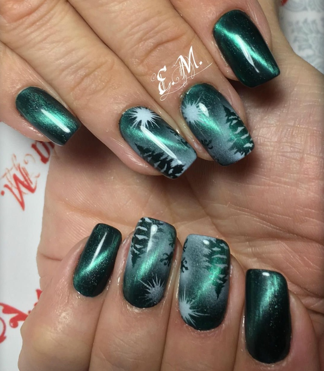 Маникюр кошачий глаз отлично подходит к Новому году. Он загадочный, стильный и необычный. Если хотите дополнить и усилить эффект, нарисуйте елочку на одном акцентном ногте с помощью кисти или маркера, иголочки.