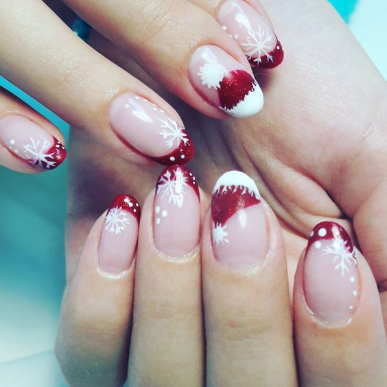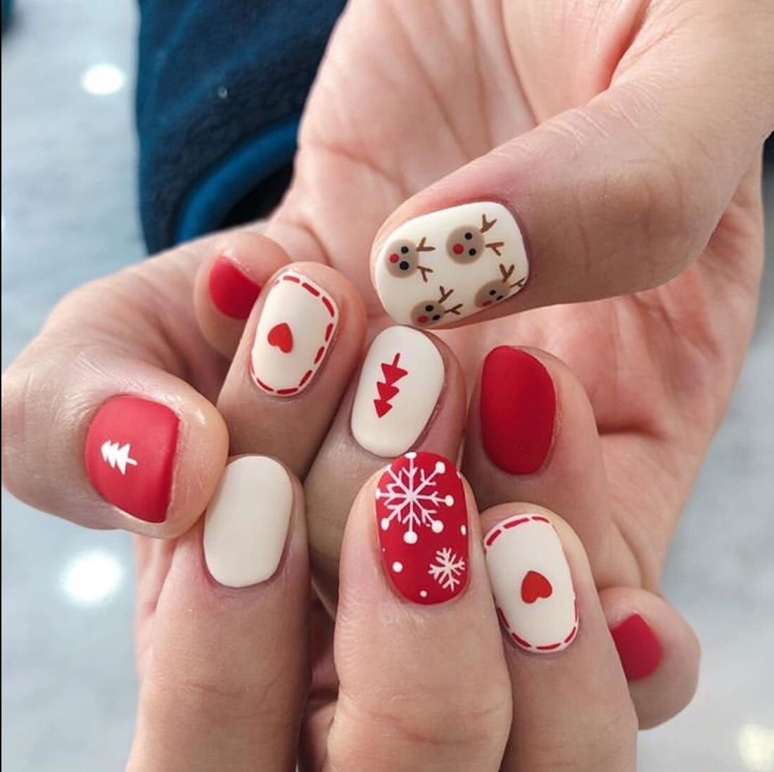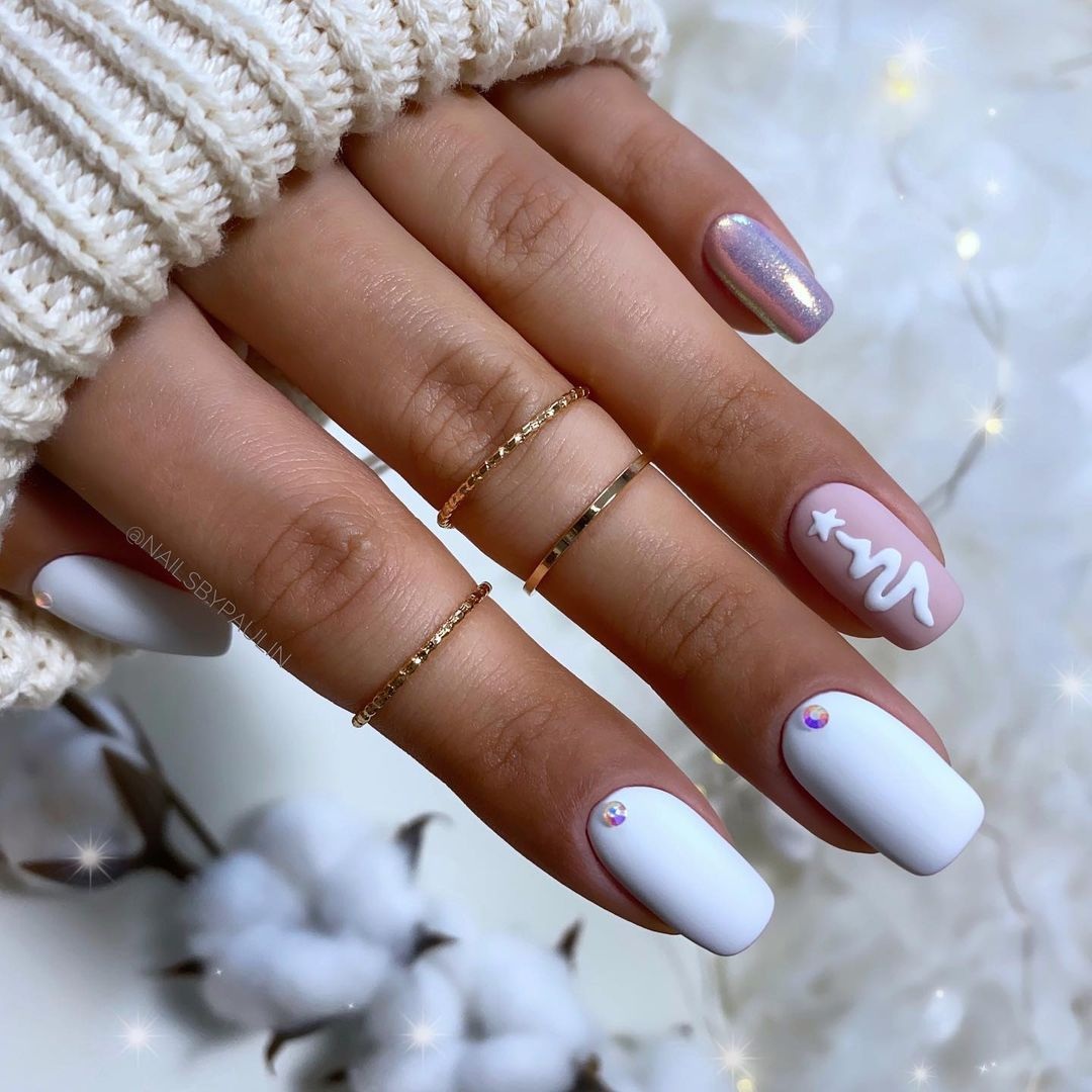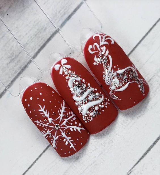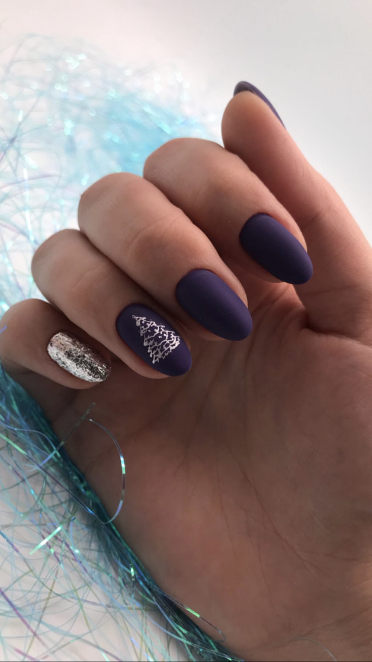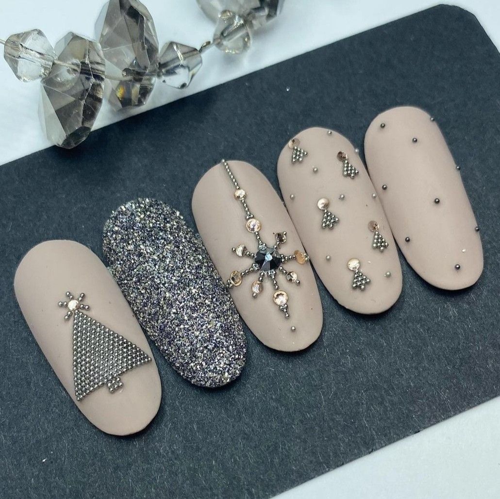 Новогодний маникюр — это блестки, стразы, камифубуки. Все они отлично смотрятся на глянцевой поверхности, но иногда бывает слишком много блеска. Если вы хотите немного облагородить дизайн, сделайте фон матовым. В этом случае можно будет не ограничивать себя с использованием блеска.