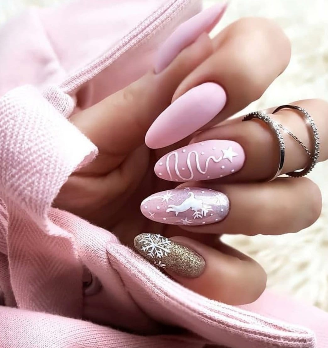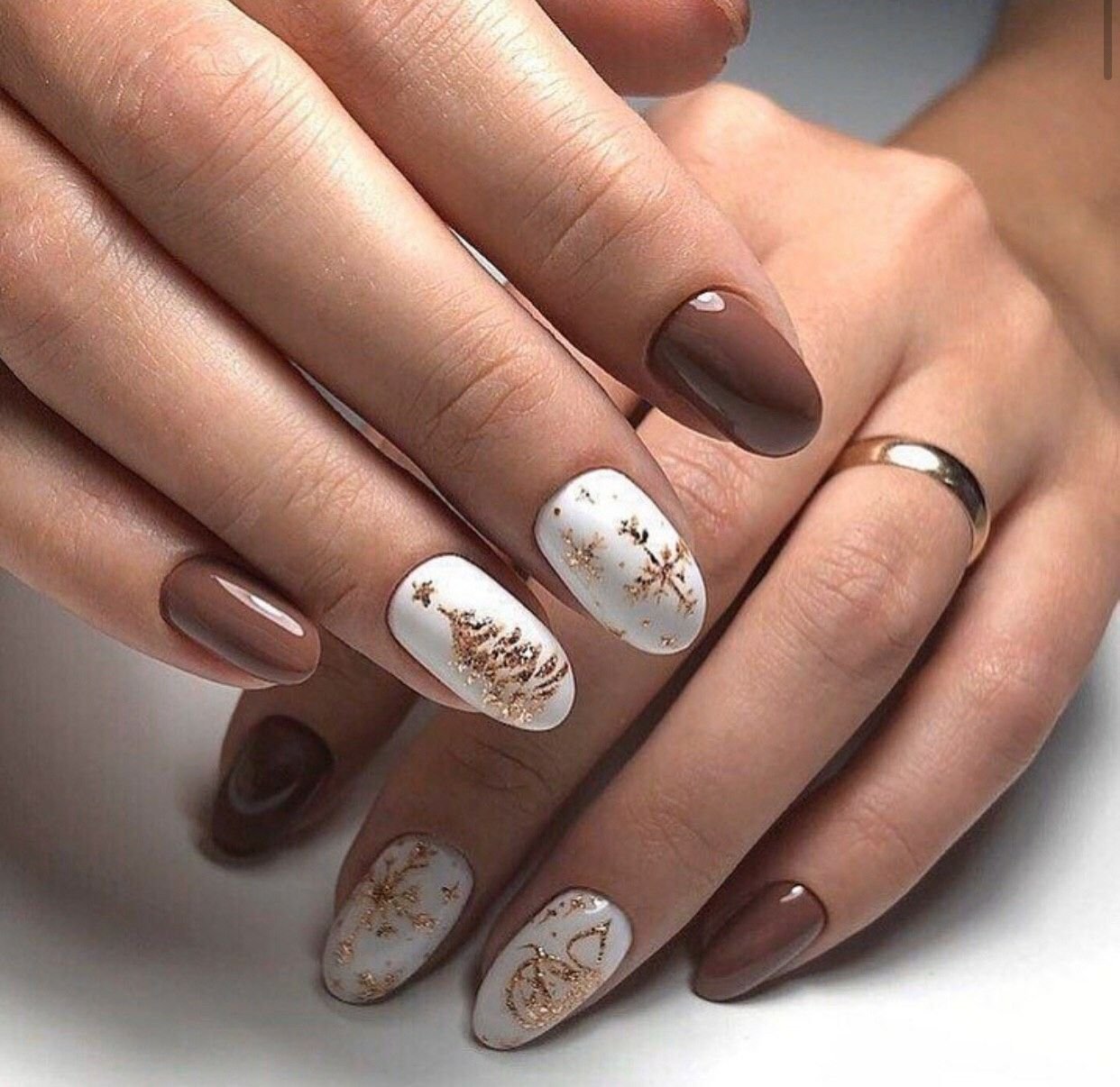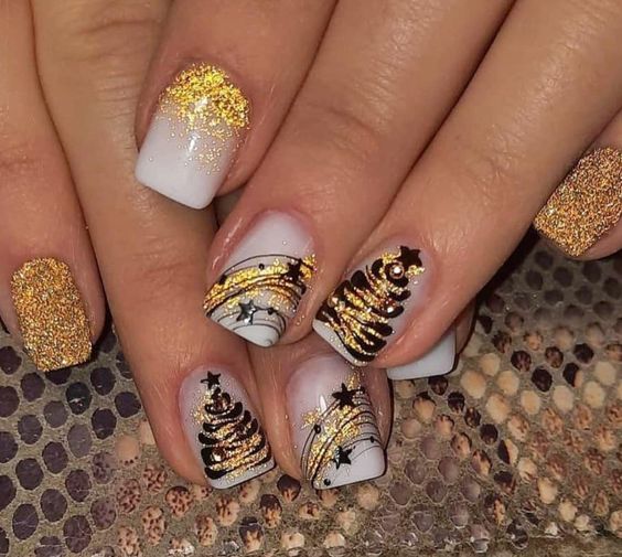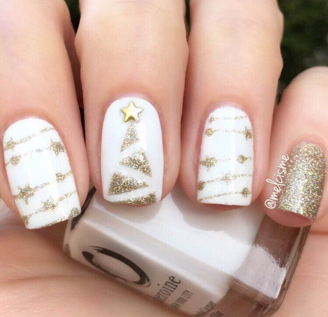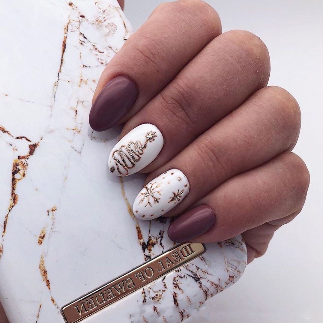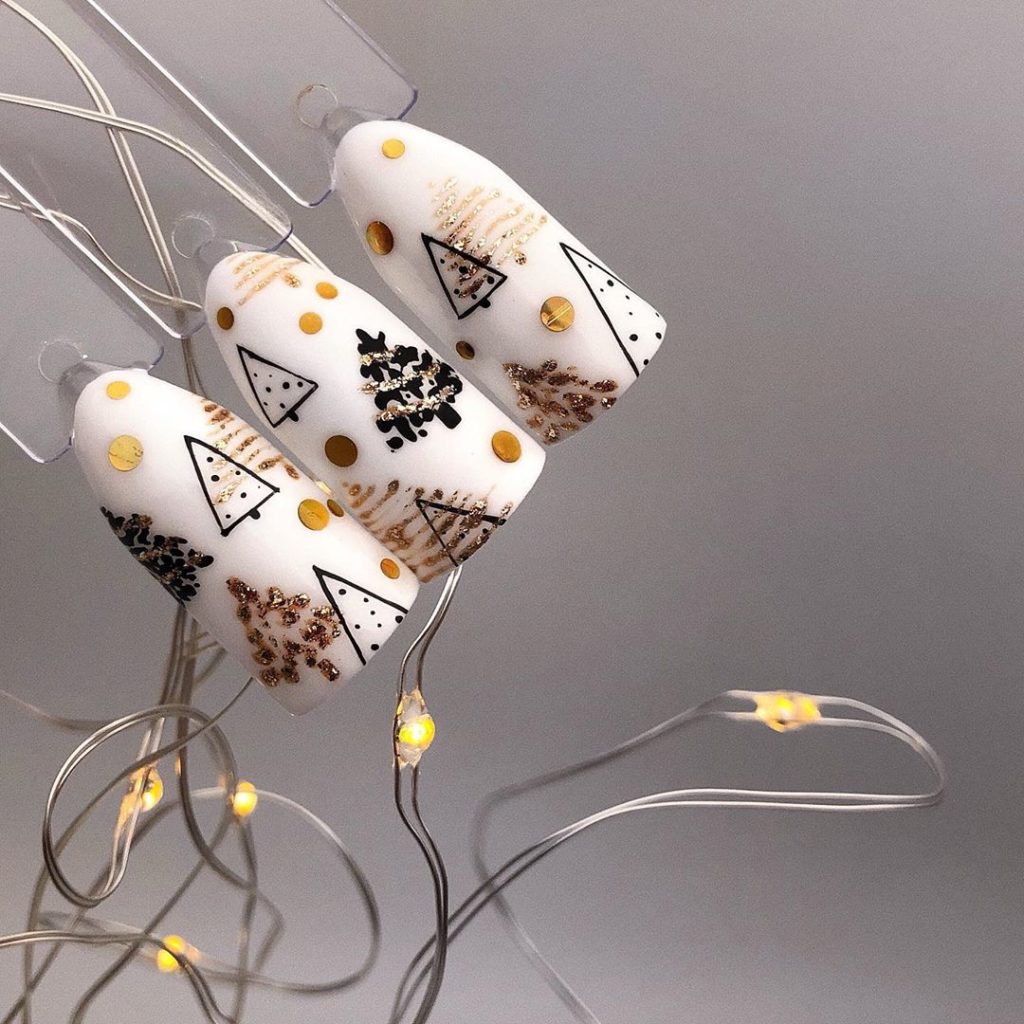 Это вариант для тех, кто хочет непременно сделать маникюр с елочкой, но его возможности ограничены требованиями дресс кода. Схематичное изображение елочки золотистым оттенком на нюдовом фоне — отличный выбор для предновогодних будней. Такой маникюр, кстати, отлично впишется даже в самый активный праздничный образ.