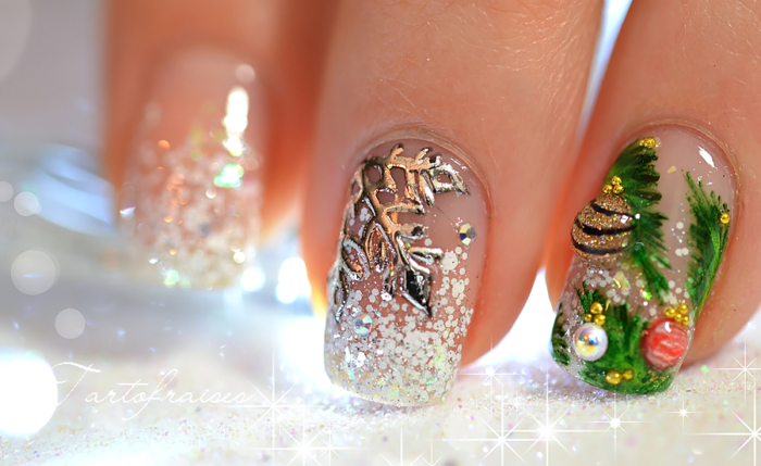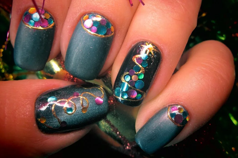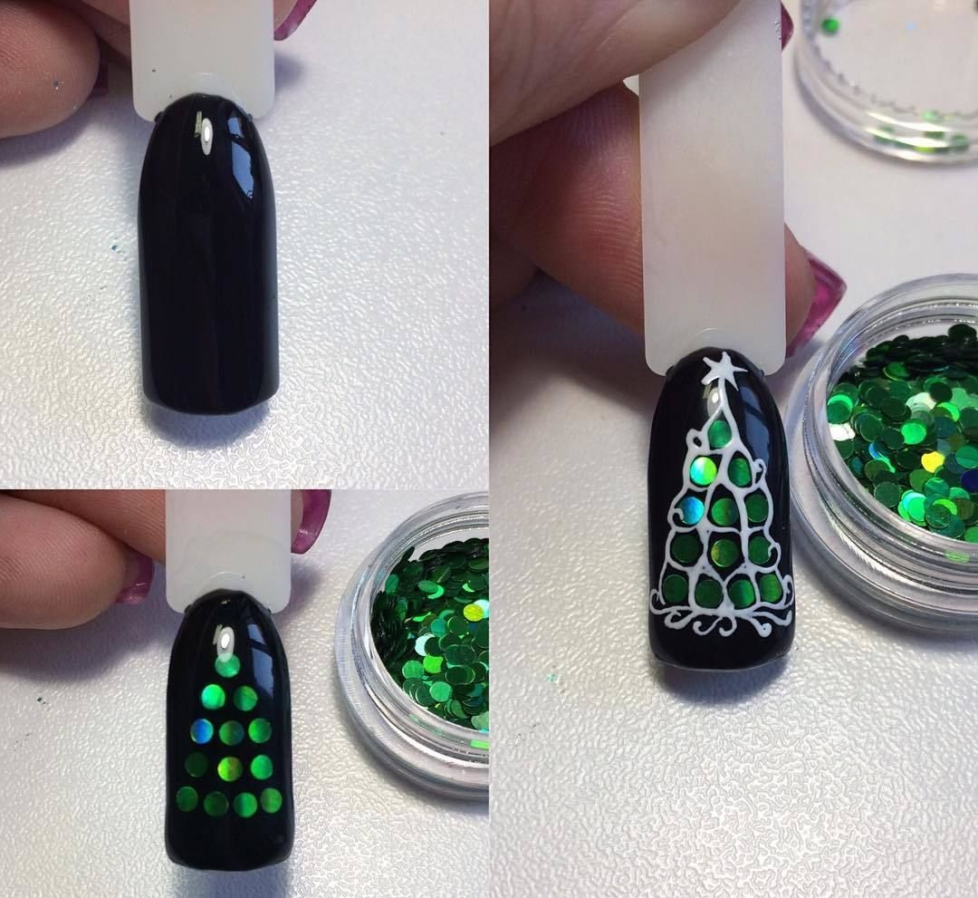 Довольно необычный вариант рисование елочки на ногтях. Но он уверенно набирает популярность среди модниц. Используйте фольгированные конфетти разных оттенков и размеров, чтобы выложить елочку. Здесь все просто, новогоднее дерево можно выложить в виде треугольника. Более крупные камифубуки могут играть роль шариков или гирлянды.