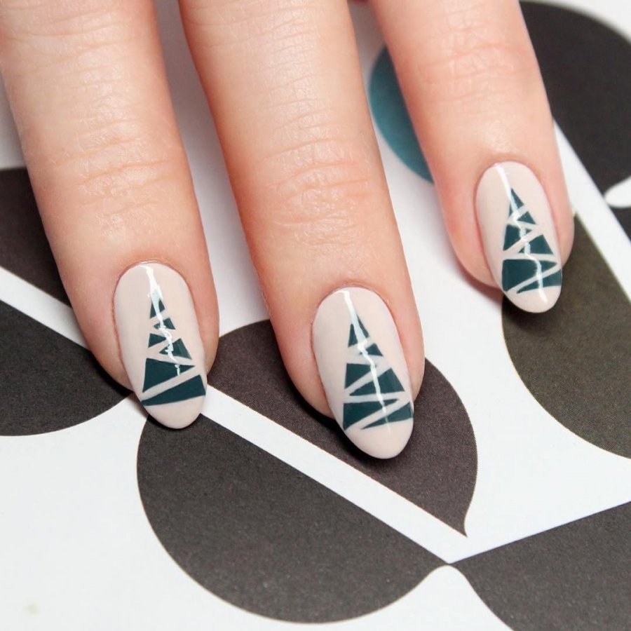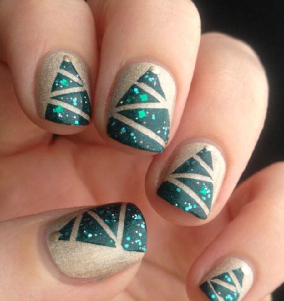 Елочку проще всего нарисовать именно в геометрическом варианте — треугольник. Но часто ее изображают и как фигуру, состоящую из нескольких треугольников. Если хотите сделать маникюр более затейливым и необычным, используйте фольгированные полоски или скотч, которые выполнят роль разделителя.