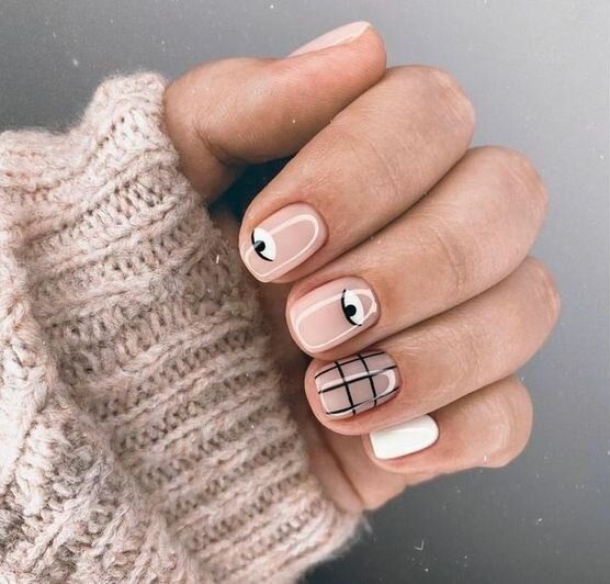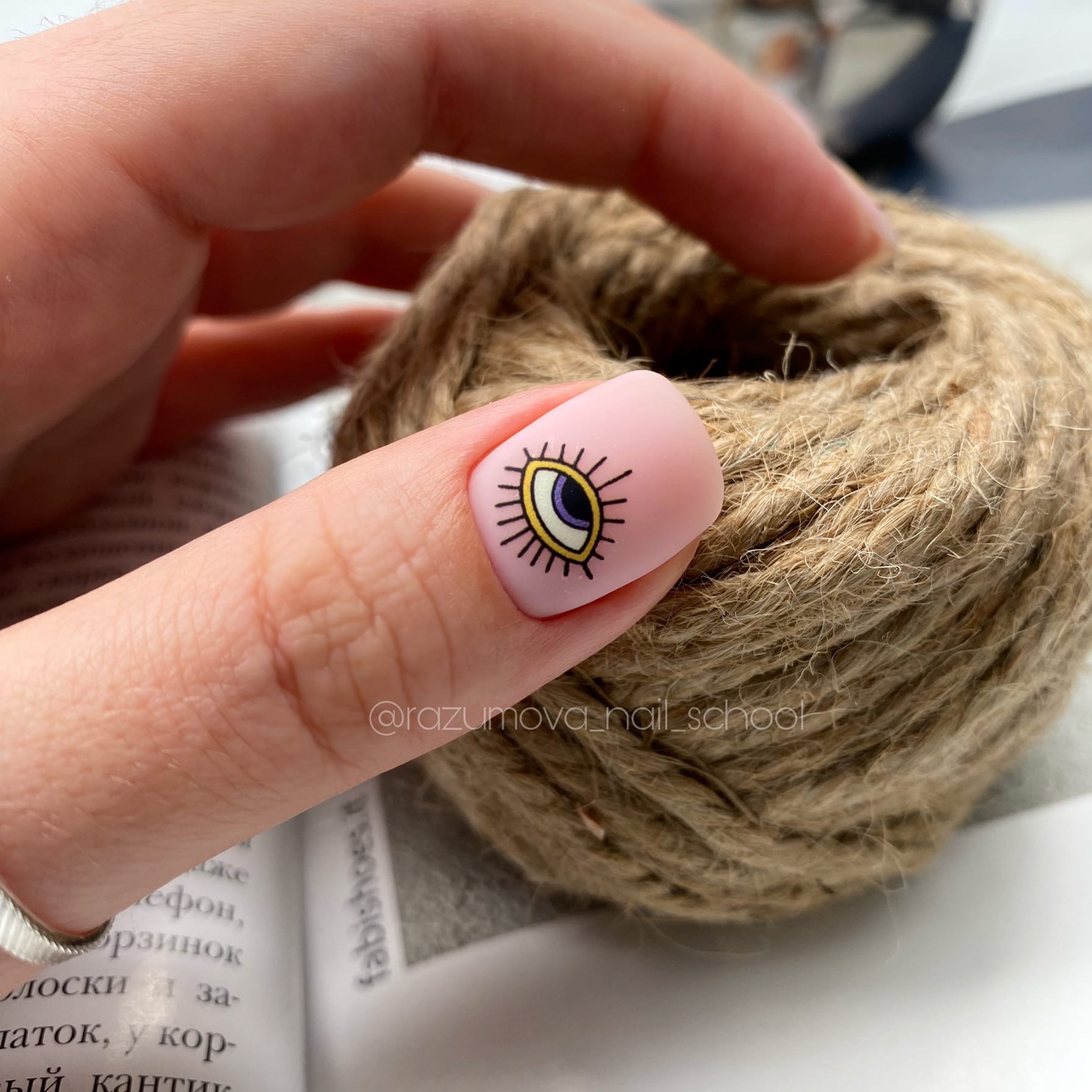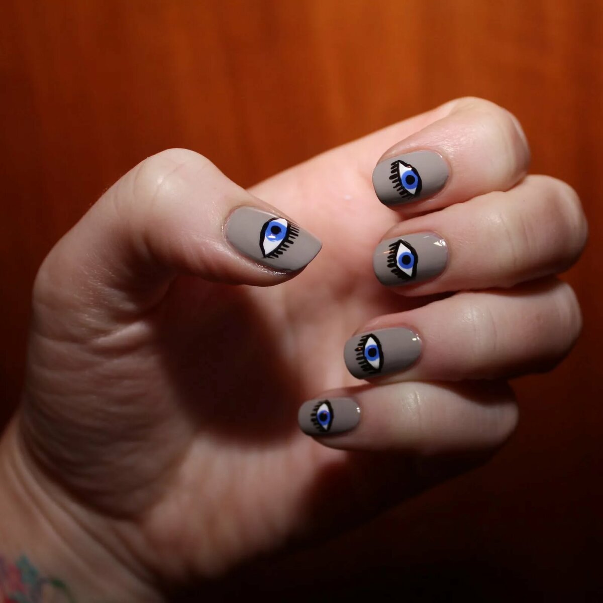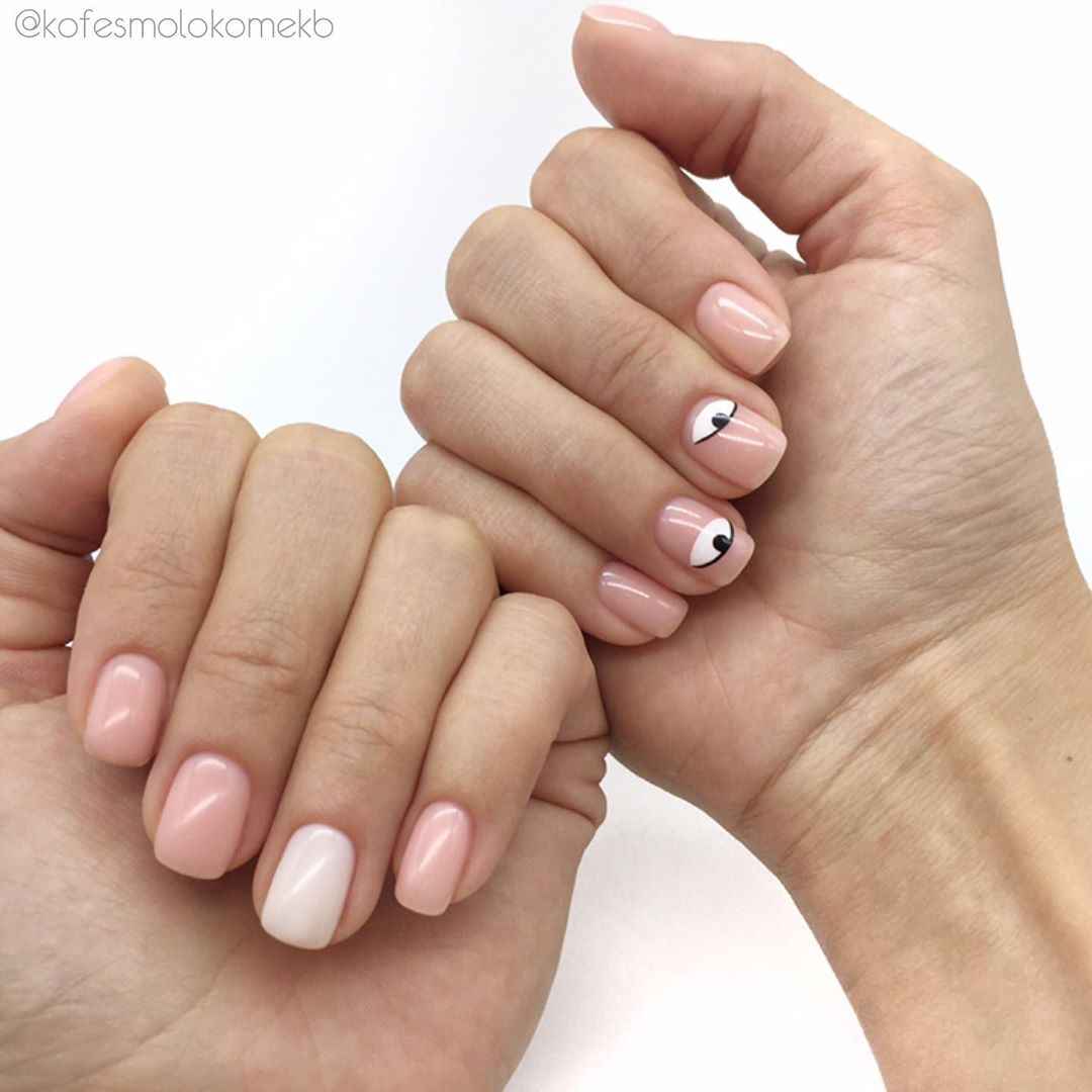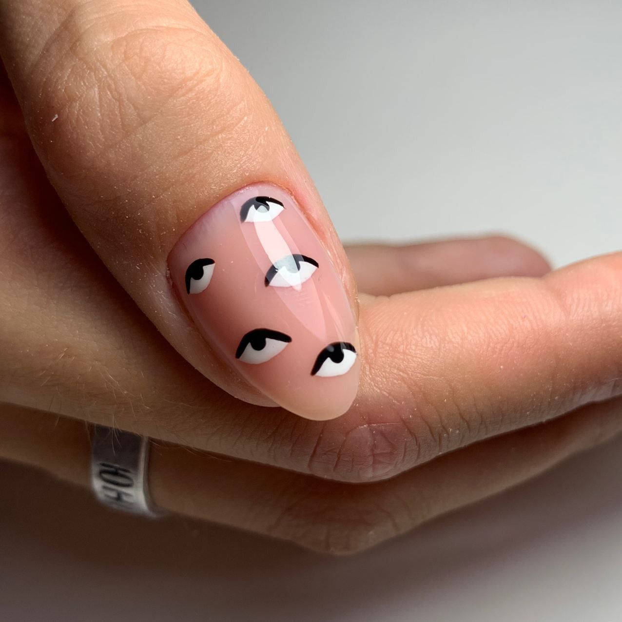 Однотонный маникюр с глазами — отличное решение для тех, кто пока только пробует новый тренд «на вкус». Главное здесь не рисунок, а базовый оттенок лака, который вы выберите. Он должен быть модным и обязательно вписываться в ваш образ. Например, для офисного можно выбрать белый, серый, голубой или нюд. А рисунок глаз нанести контрастным или, наоборот, близким по тону оттенком.