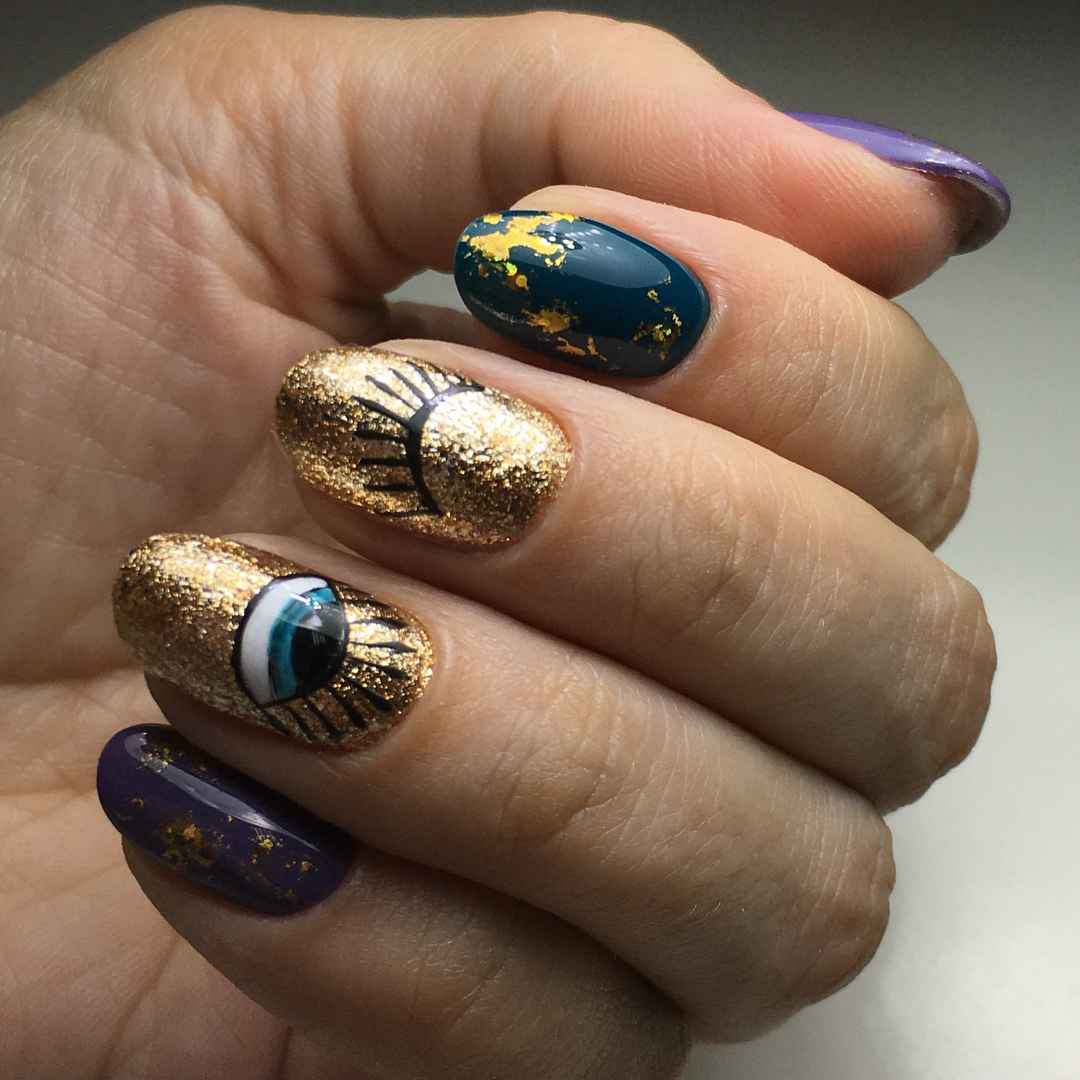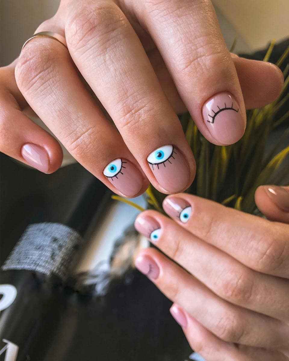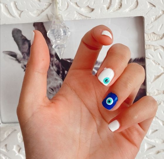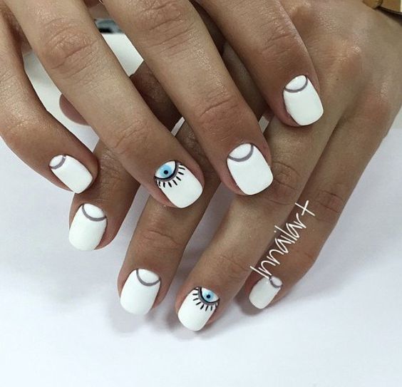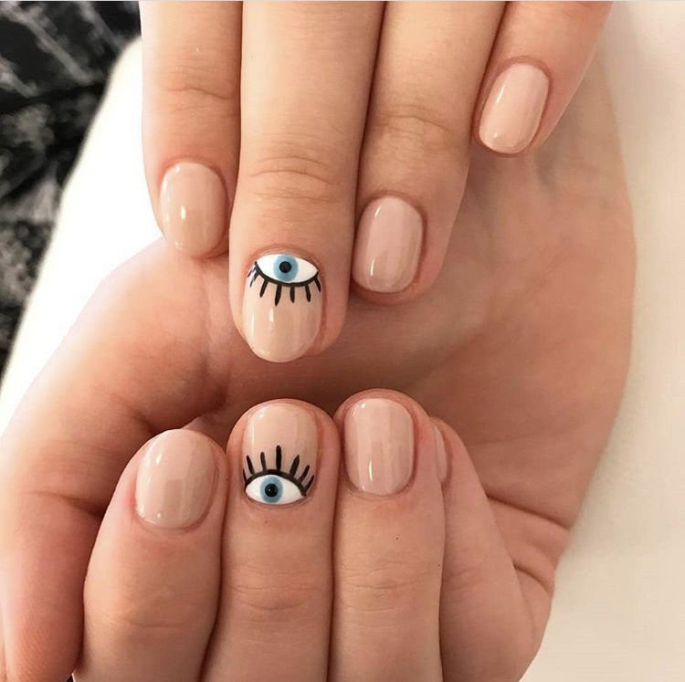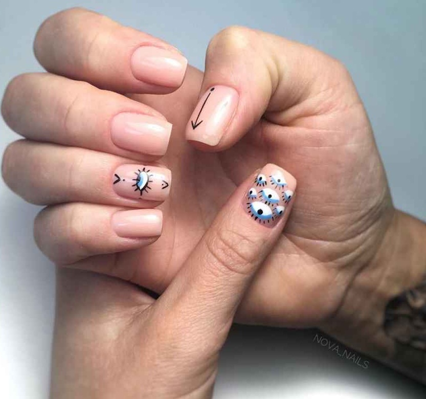 Отдельно стоит сказать об особом исполнении маникюра с глазами. Если вы верите в возможность привлечение удачи и везения с помощью амулетов и оберегов, изобразите на одном или сразу нескольких пальчиках так называемый турецкий глаз или назар. Очень стильно смотрится сочетание такого дизайна с нюдовой базой, френчем или золотыми блестками.