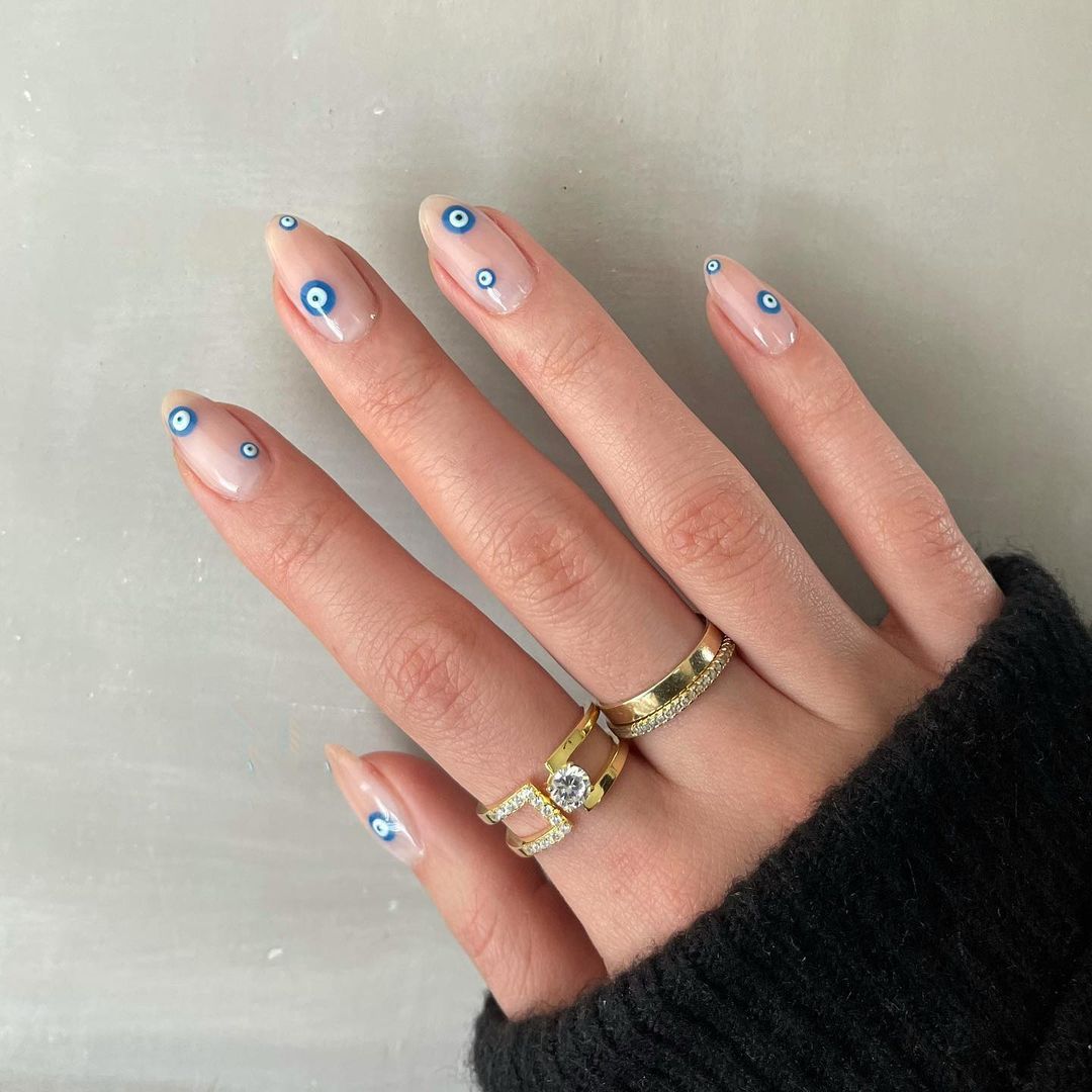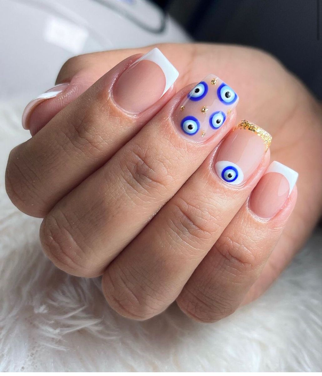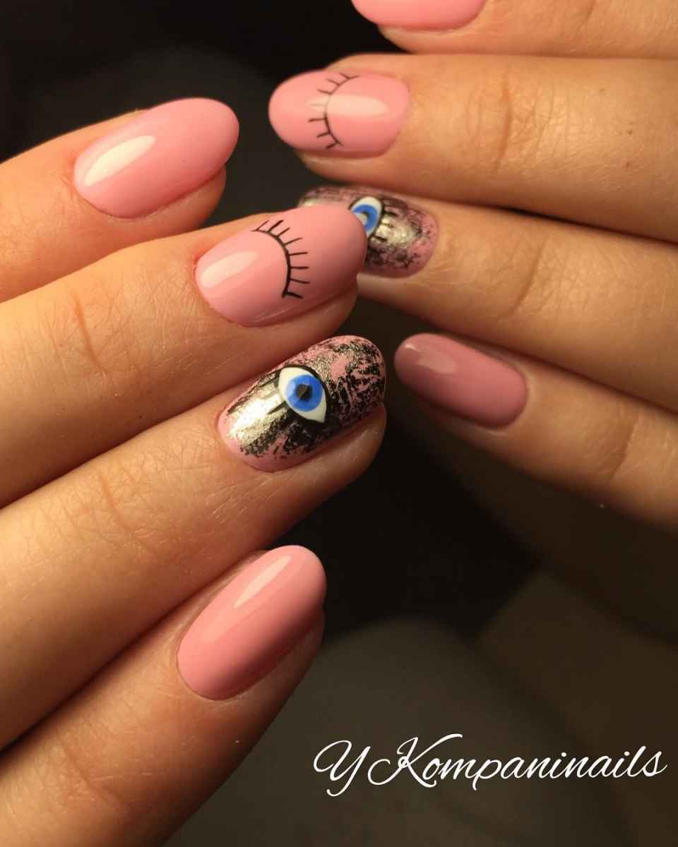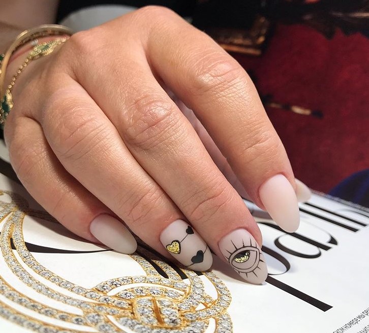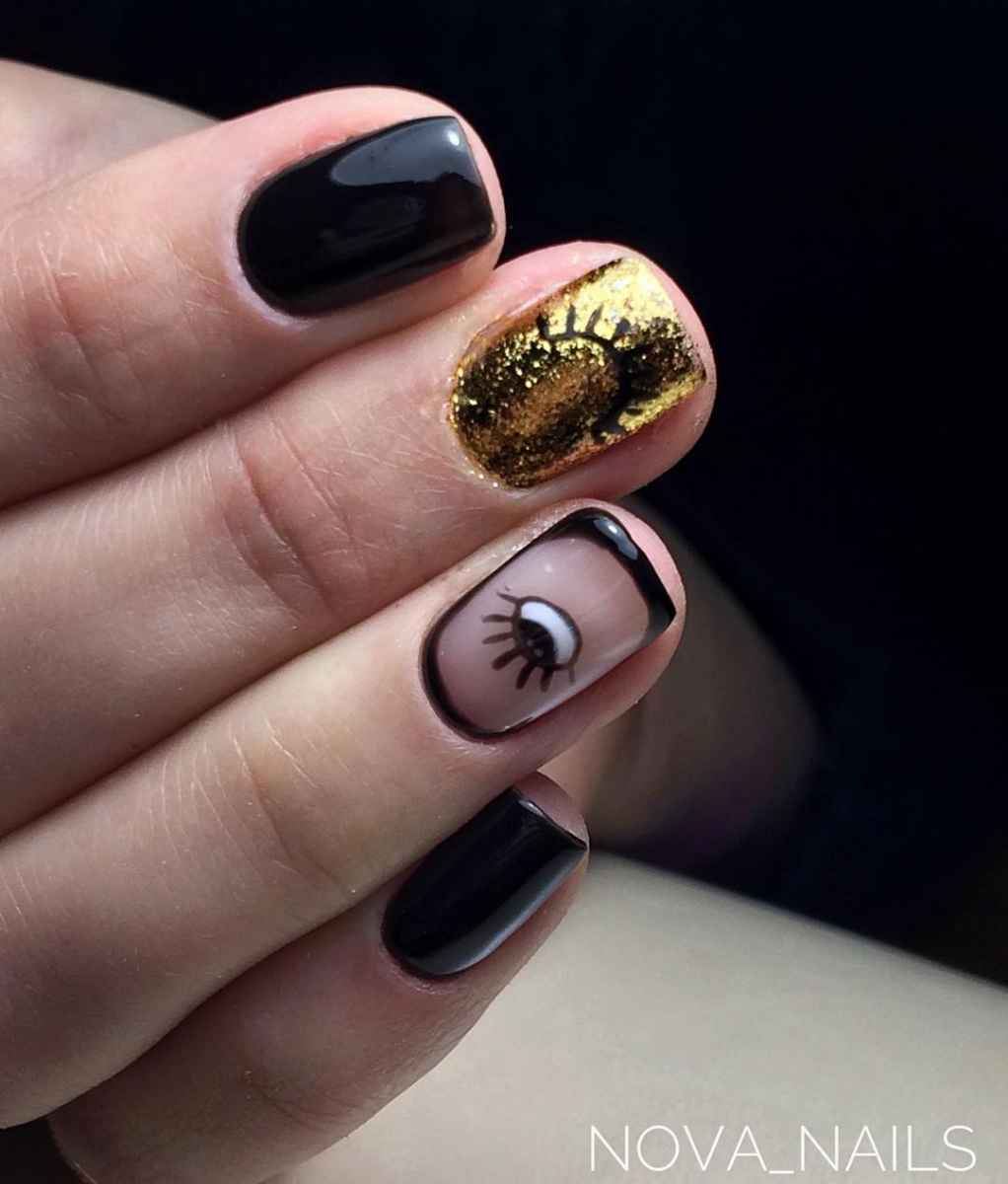 Отдельно стоит сказать об особом исполнении маникюра с глазами. Если вы верите в возможность привлечение удачи и везения с помощью амулетов и оберегов, изобразите на одном или сразу нескольких пальчиках так называемый турецкий глаз или назар. Очень стильно смотрится сочетание такого дизайна с нюдовой базой, френчем или золотыми блестками.