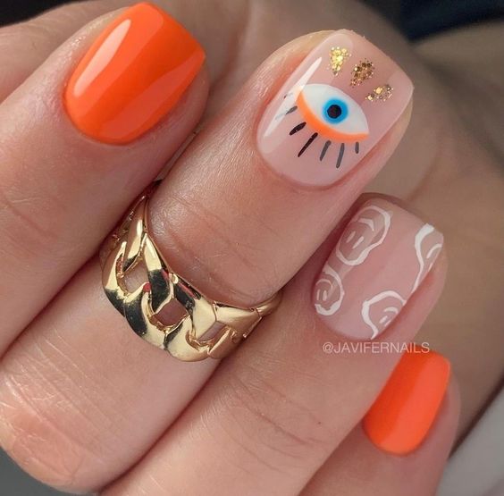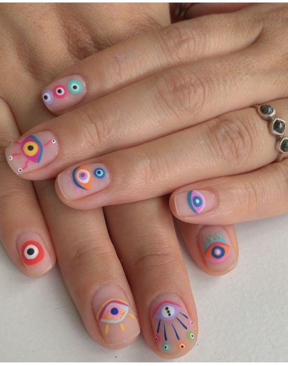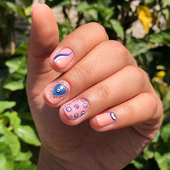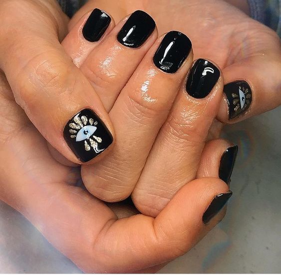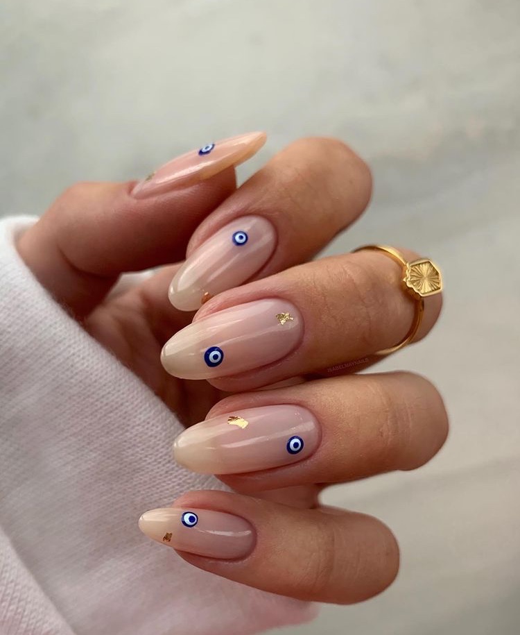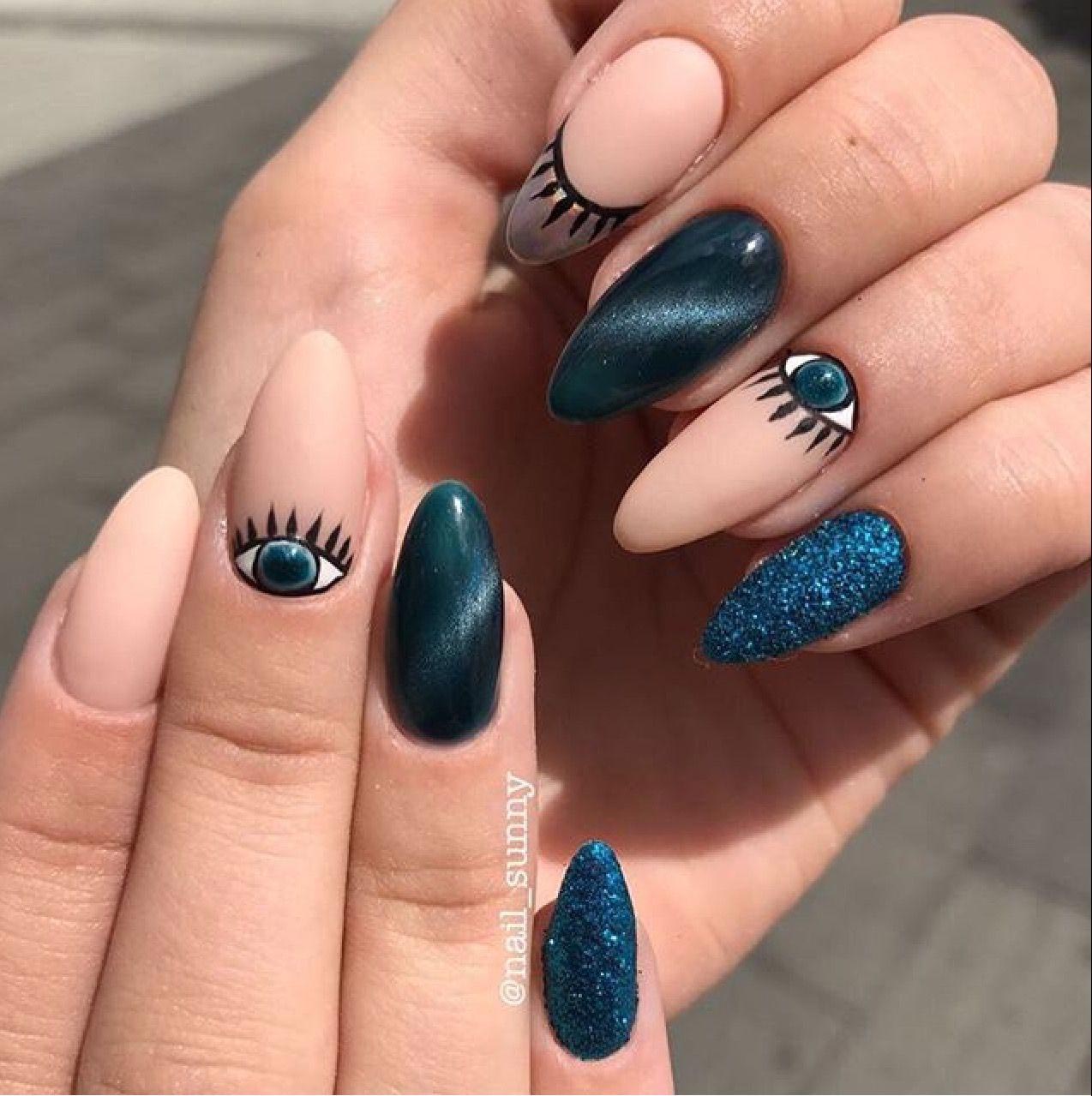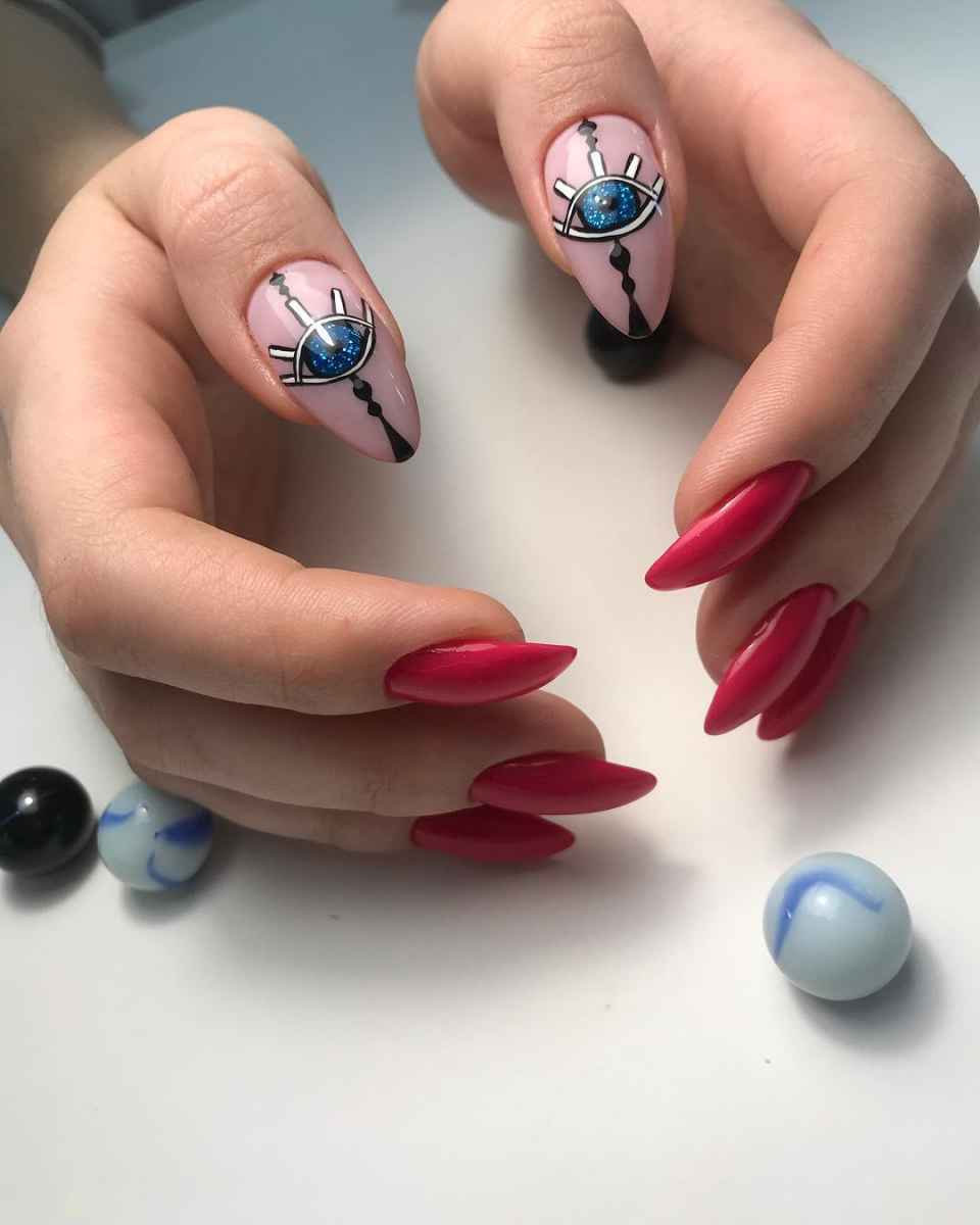 Отдельно стоит сказать об особом исполнении маникюра с глазами. Если вы верите в возможность привлечение удачи и везения с помощью амулетов и оберегов, изобразите на одном или сразу нескольких пальчиках так называемый турецкий глаз или назар. Очень стильно смотрится сочетание такого дизайна с нюдовой базой, френчем или золотыми блестками.