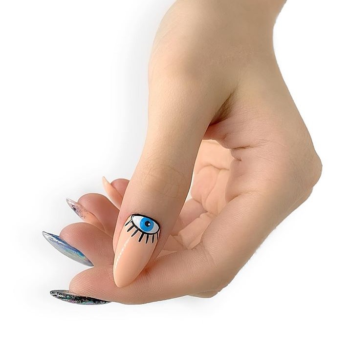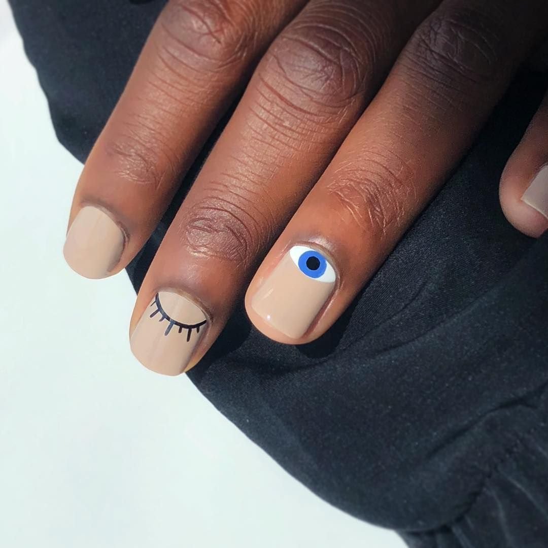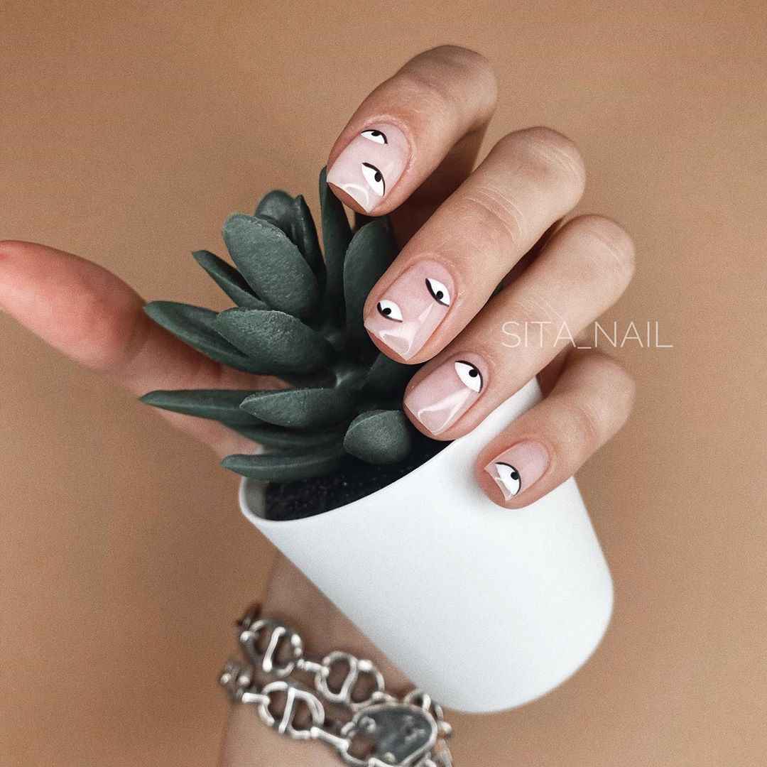 Негативное пространство — название техники звучит сложно и необычно. На самом деле это дизайн, при котором мастер оставляет «голые» участки. Сочетать его с рисунком глаз — отличная идея. Так у вас получится сочетать две самых трендовых в этом сезоне техник и создать удивительно стильный маникюр.