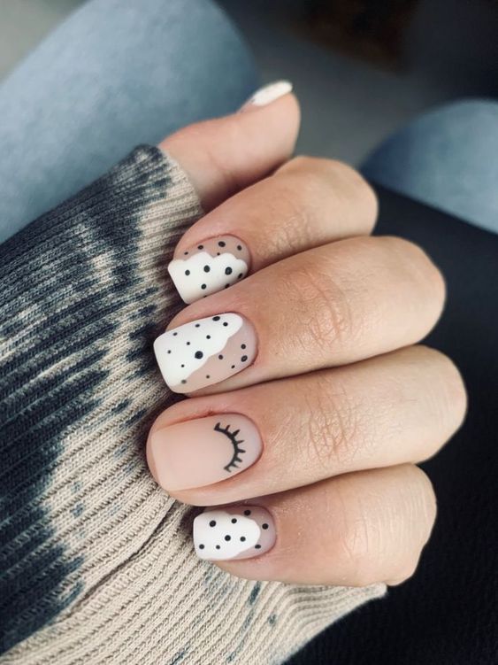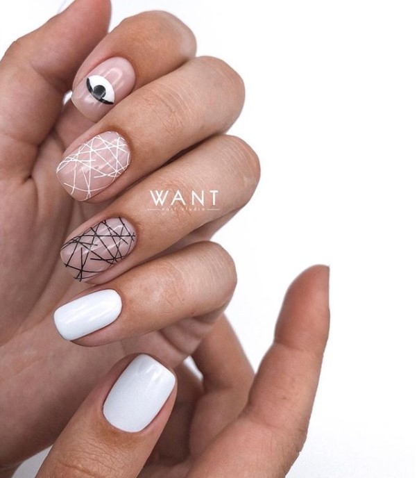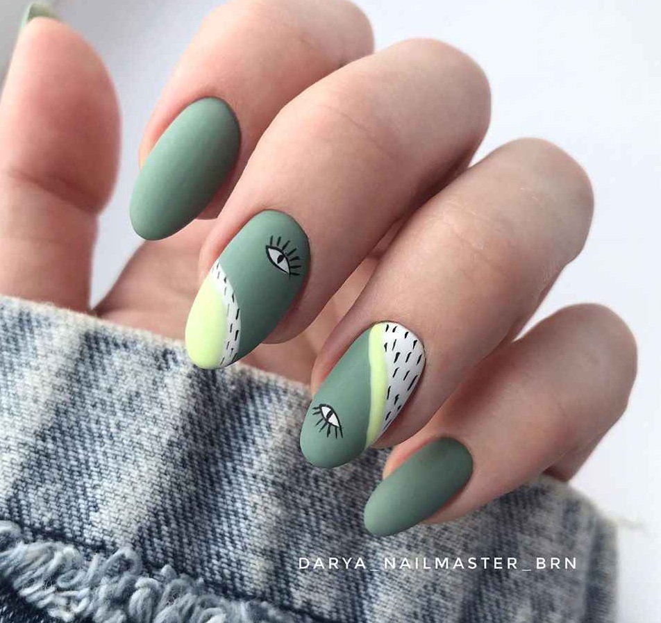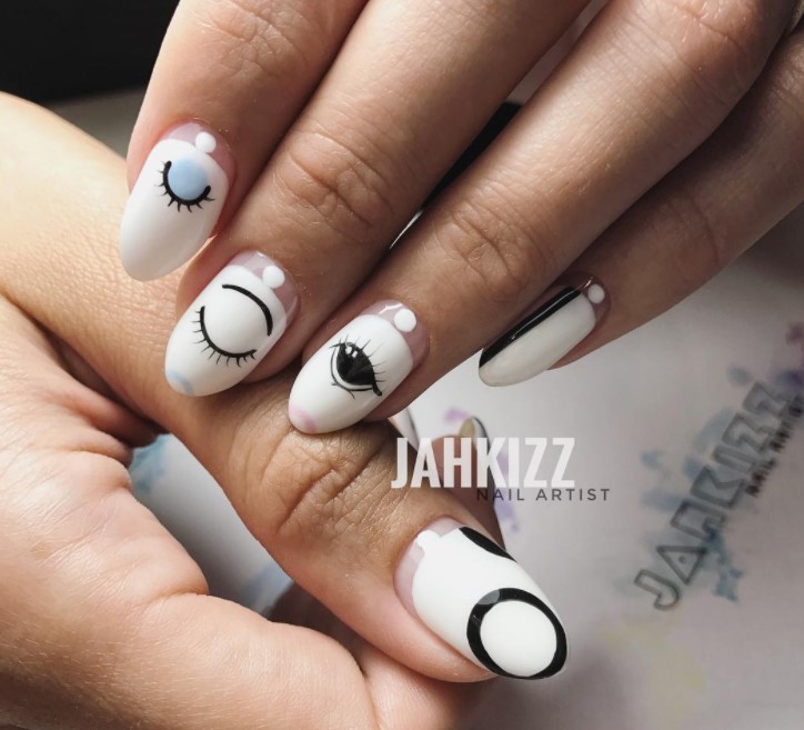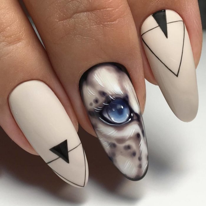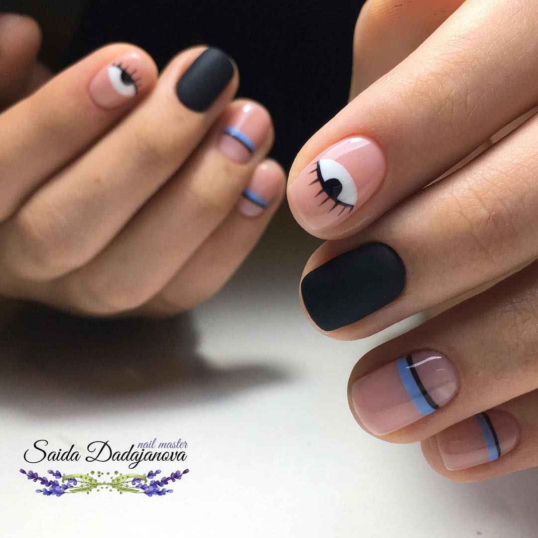 Негативное пространство — название техники звучит сложно и необычно. На самом деле это дизайн, при котором мастер оставляет «голые» участки. Сочетать его с рисунком глаз — отличная идея. Так у вас получится сочетать две самых трендовых в этом сезоне техник и создать удивительно стильный маникюр.