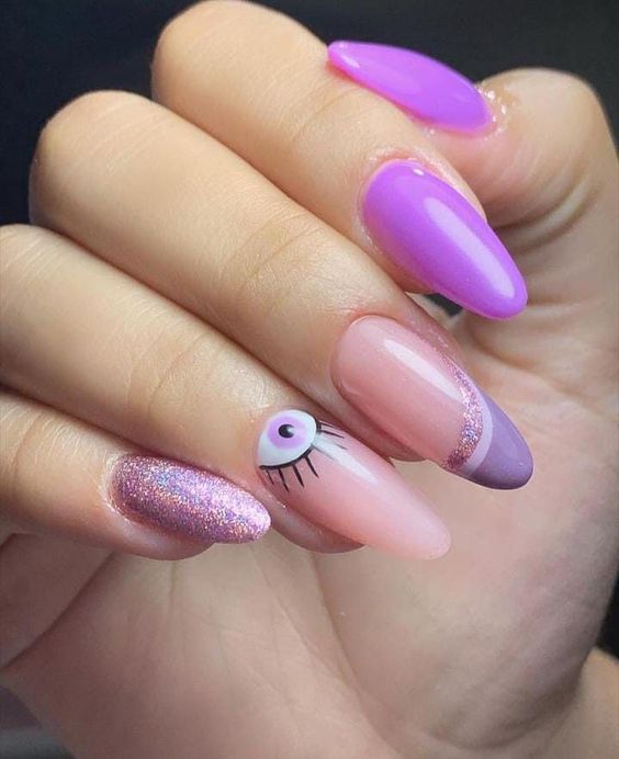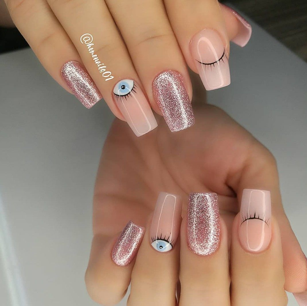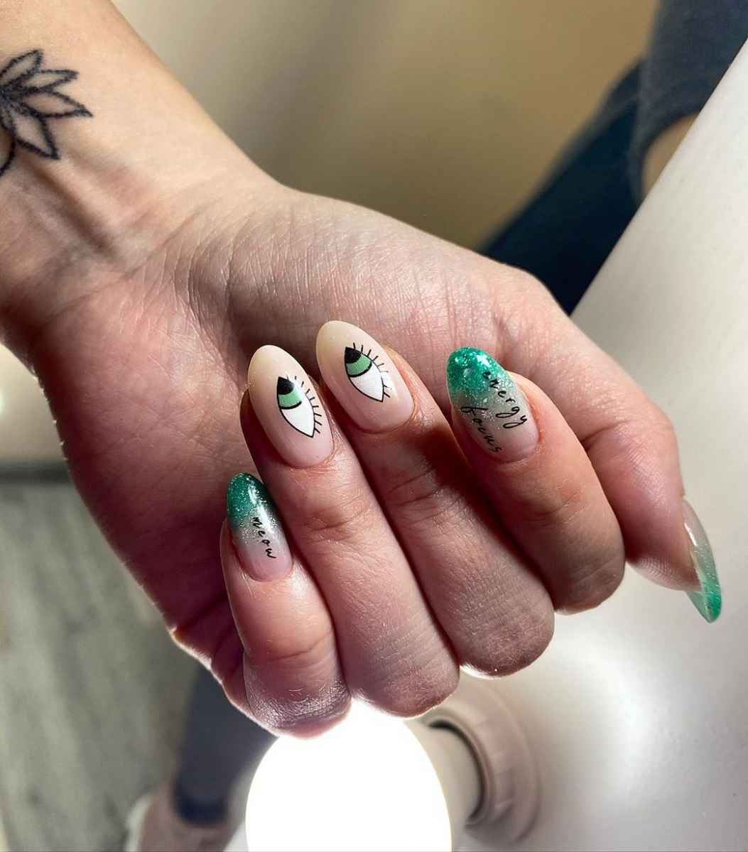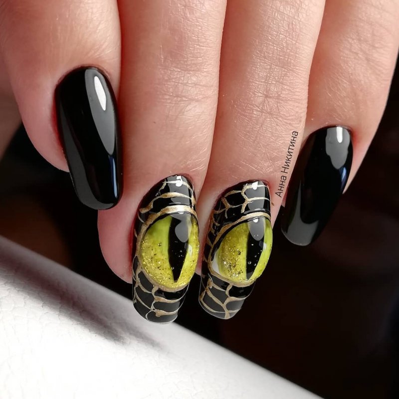 Кстати, неплохая идея сочетать рисунок глаз на лунках ногтей с оформлением части платин блестками или лаком с эффектом кошачьего глаза.