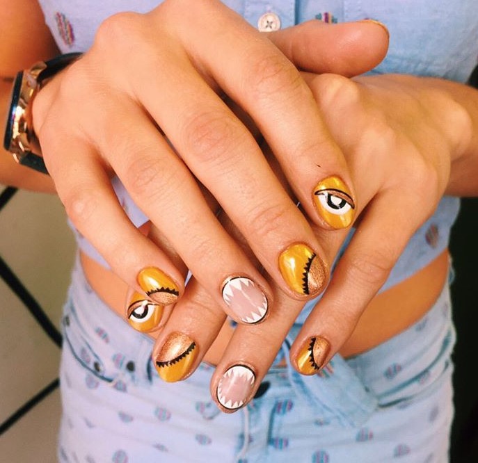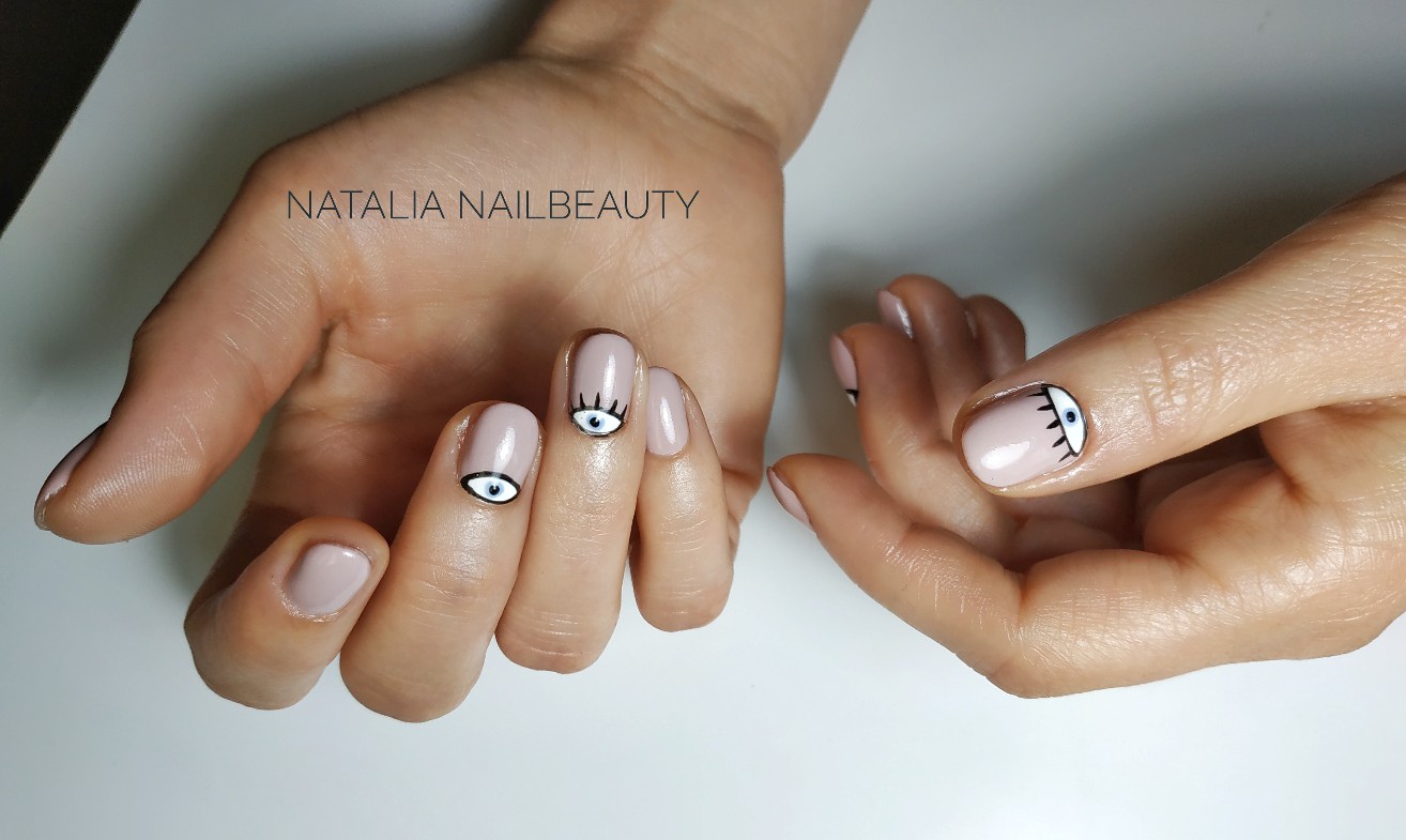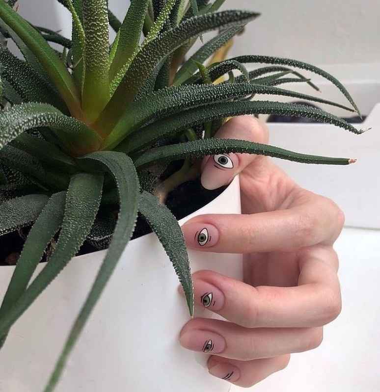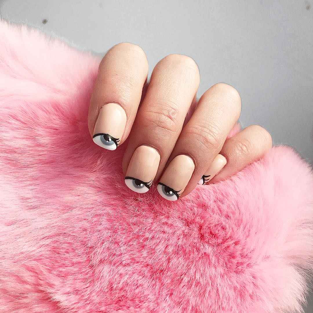 - универсальность. Это довольно адаптивный дизайн. Глаза можно расположить на ногтевых пластинах так, как вам этого хочется. Не обязательно рисовать множество глаз на ногте. Например, достаточно вообразить, что ноготок дамы — это и есть лицо красавицы. Теперь вы можете просто нарисовать невесомую летящую челку, а под ней два красивых распахнутых глаза. Такой вариант подходит под строгий образ, более смелые и необычные решения можно вписать в молодежный и расслабленный;