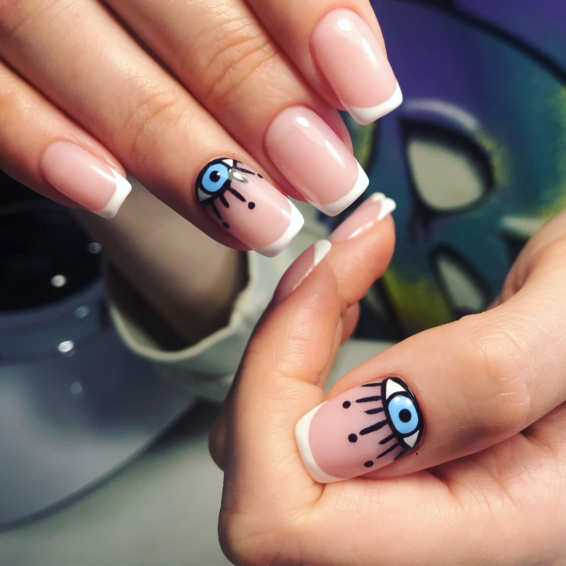 Маникюр с глазами готов. Обязательно продумайте общий дизайн ногтей — будет ли рисунок на одном ноготке или вы украсите глазами сразу несколько пластин. будет ли это лунный маникюр или френч, а может быть вы разместите рисунок глаза там, где вам захочется.