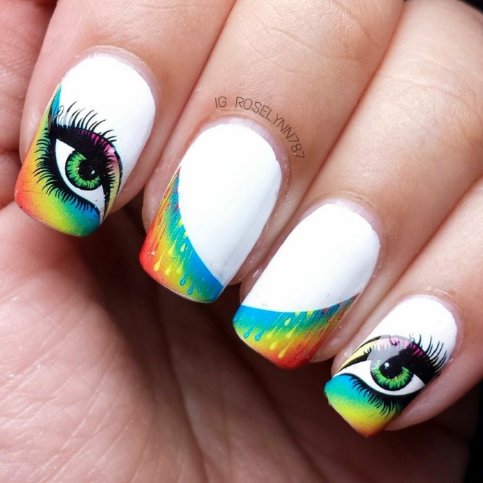 - сочетается с множеством других техник. Если оформить ноготки только в одной технике вам кажется скучным, сочетайте две или три. И обязательно добавьте в дизайн рисунок глаз;