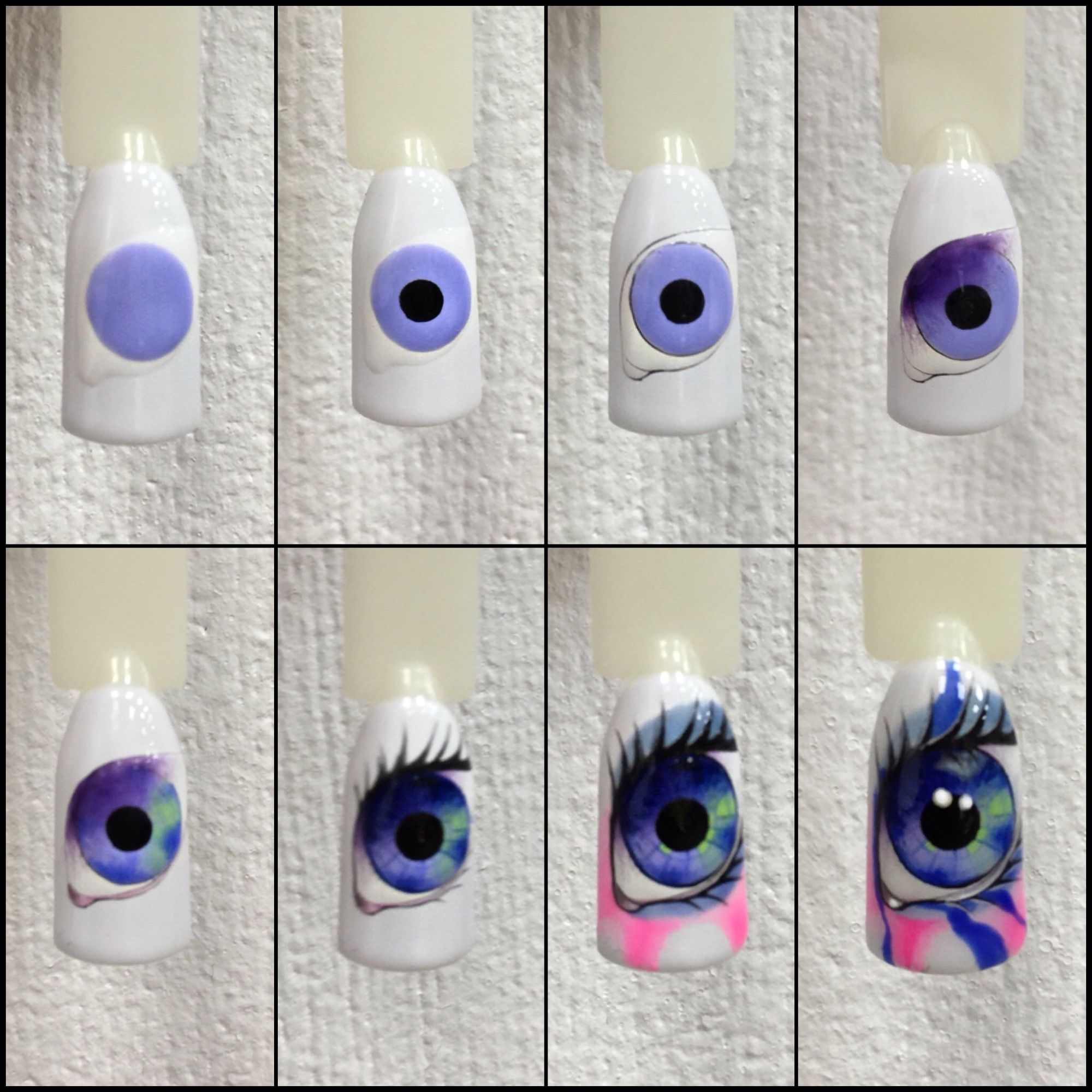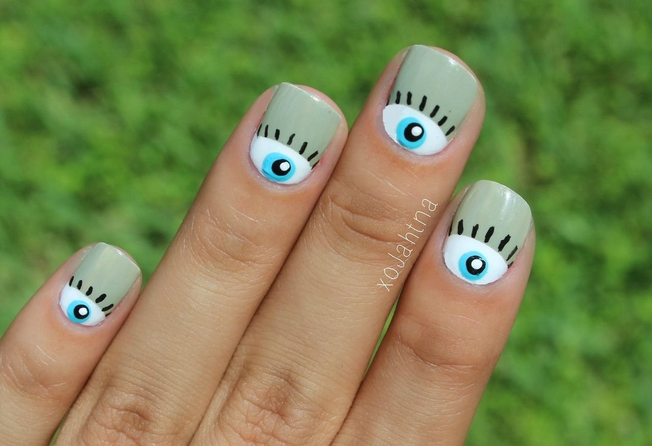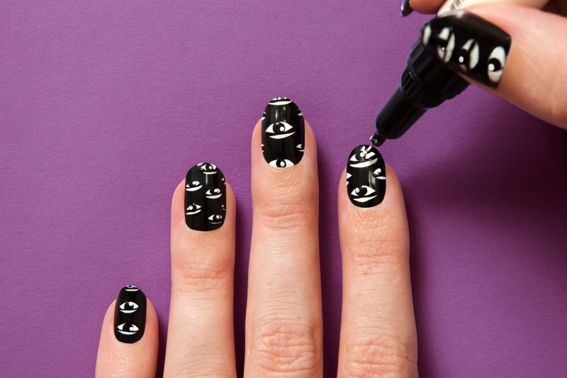 Сделать маникюр с глазами можно не только у мастера в салоне, но и дома самостоятельно. Кстати, глаза можно нарисовать тонкой кисточкой и лаками, использовать слайдеры или стемпинг. Последние два варианта — самые простые для самостоятельного исполнения. Но для этого вам придется заранее приобрести необходимые слайдеры или все, что нужно для техники стемпинга — силиконовый штамп и металлическую пластину с необходимыми рисунками. мы предлагаем попробовать нарисовать глаза на ногтях с помощью кисти и лака.