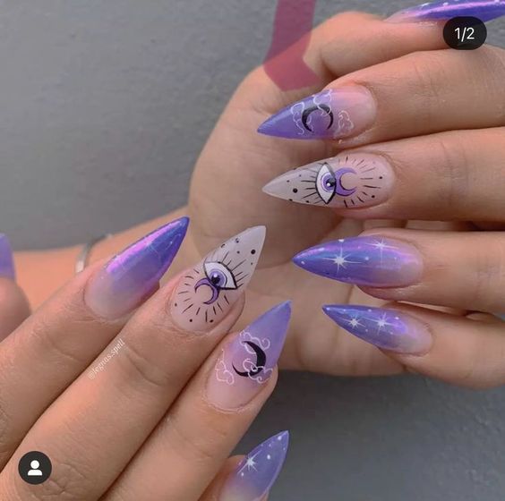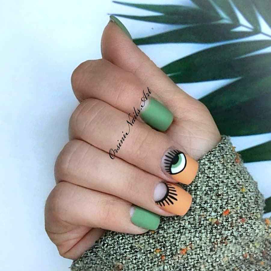 Это одна из любимейших техник современных модниц. Она отлично сочетается с маникюром eye see you. Вы можете использовать микс двух дизайнов или использовать цветовые переливы омбре как базу для красивого рисунка. Очень стильно смотрится матовый градиент, на фоне которого можно разместить не просто глаза, а красивое женское лицо с яркими глазками.