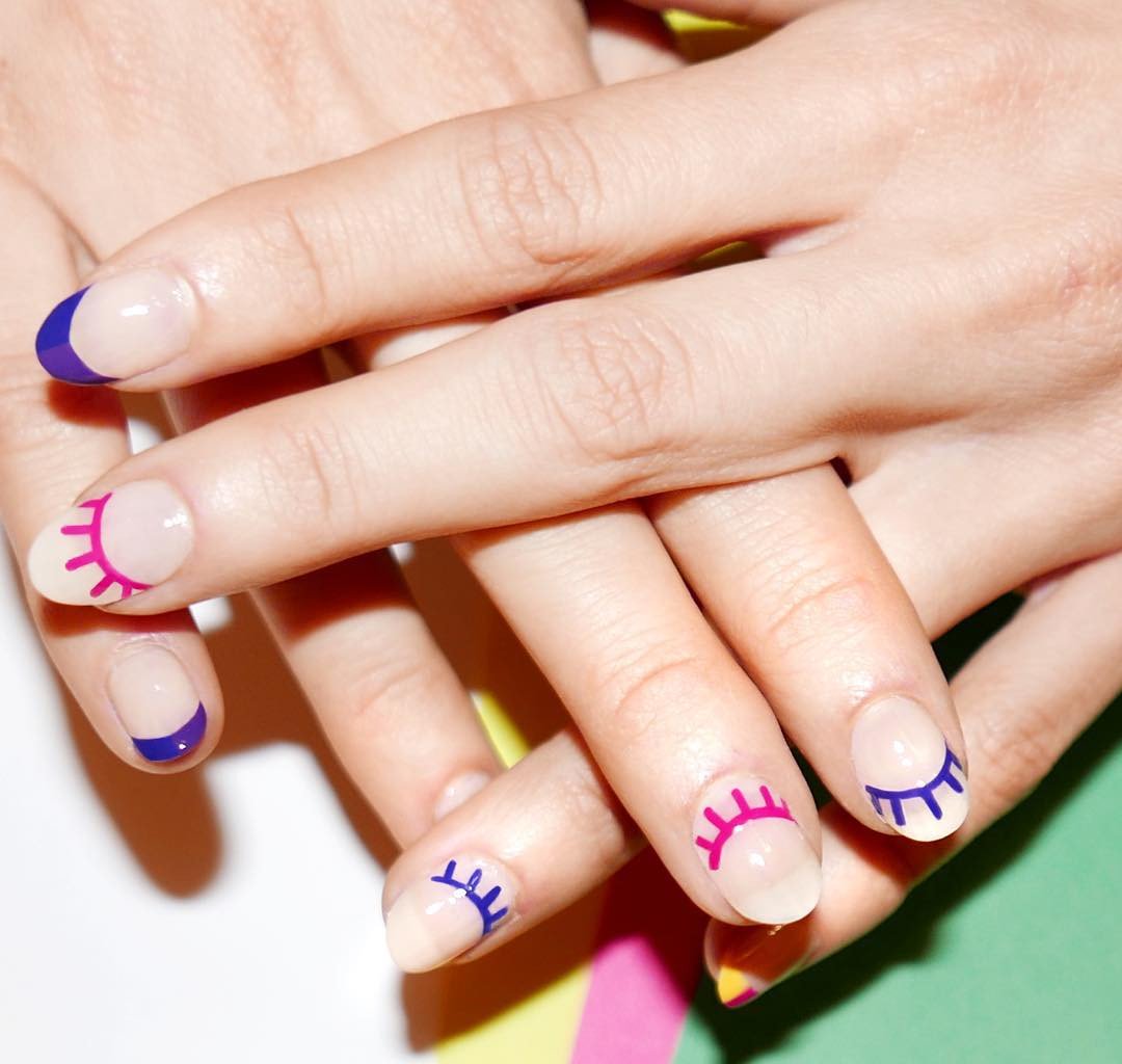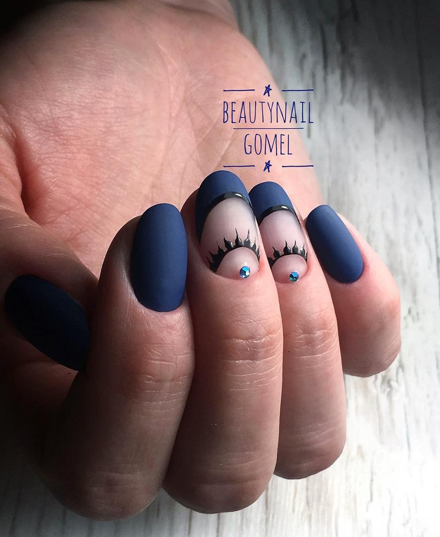 Лунный маникюр появился как антагонист классическому френчу. Но в данном случае он подходит даже больше. Все дело в естественной форме лунулы, которая словно просится, чтобы ее оформили в виде века с ресничками. Сюда же можно добавить немного блеска с помощью страз или блесток. Только обязательно продумайте дизайн — возможно, будет лучше, если таким образом вы оформите всего пару ноготков на руке.