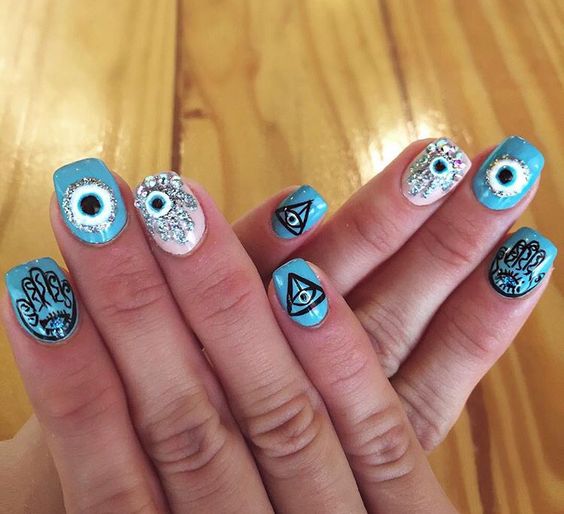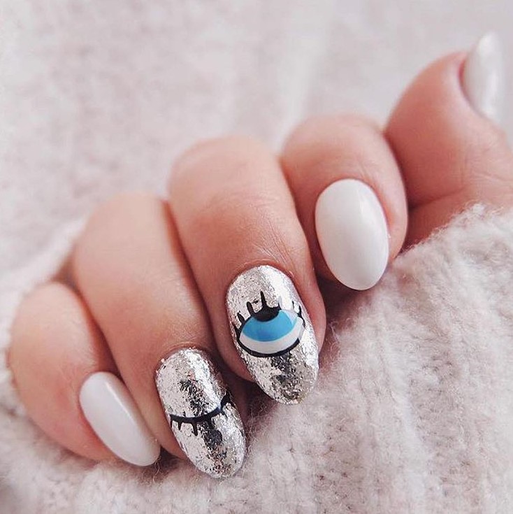 Эффектнее всего смотрится маникюр с глазами, нарисованный не простыми красками или лаками, а дополненный стразами или блестками. Кстати, обратите внимание на вариант, когда рисунок глаза располагается на блестящей базе. Например, серебристой. Но, конечно, оттенок базы важно выбирать, исходя из привычного оттенка украшений, чтобы не возникало цветового диссонанса в образе.