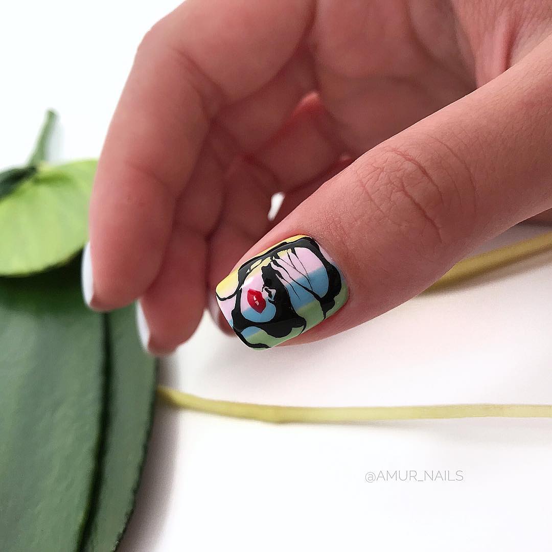 Совет: интересный вариант — оформить край или середину пластины в виде верхнего века с густыми или мультяшными ресничками. Не обязательно добиваться художественного сходства. Реснички могут быть схематичными. Это добавит еще больше стиля в дизайн маникюра.