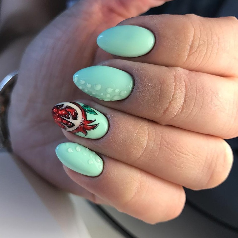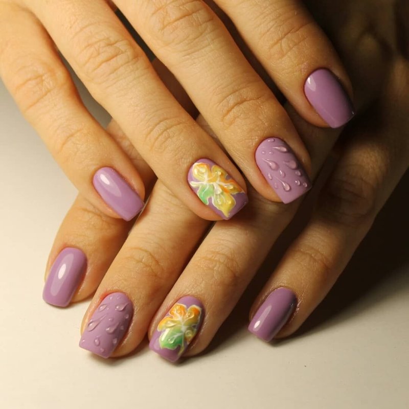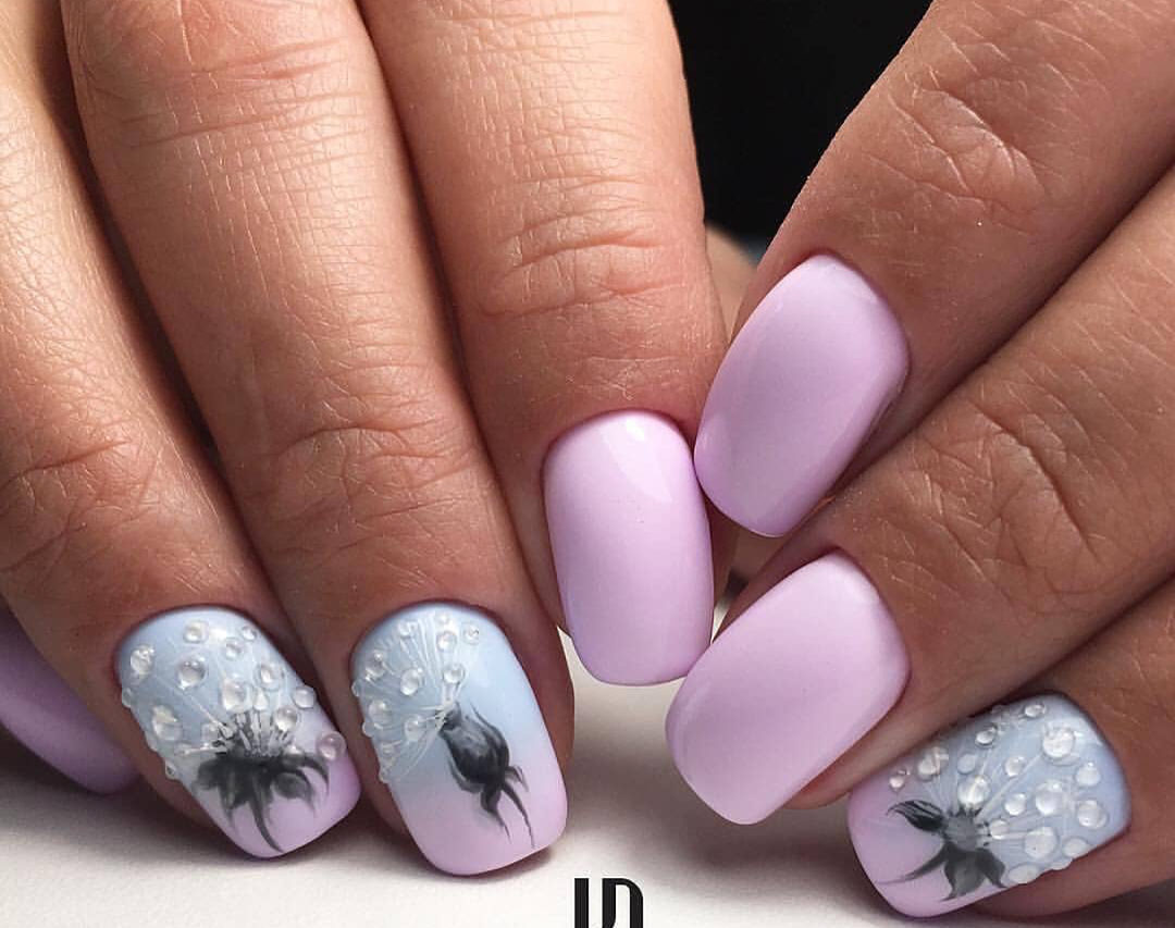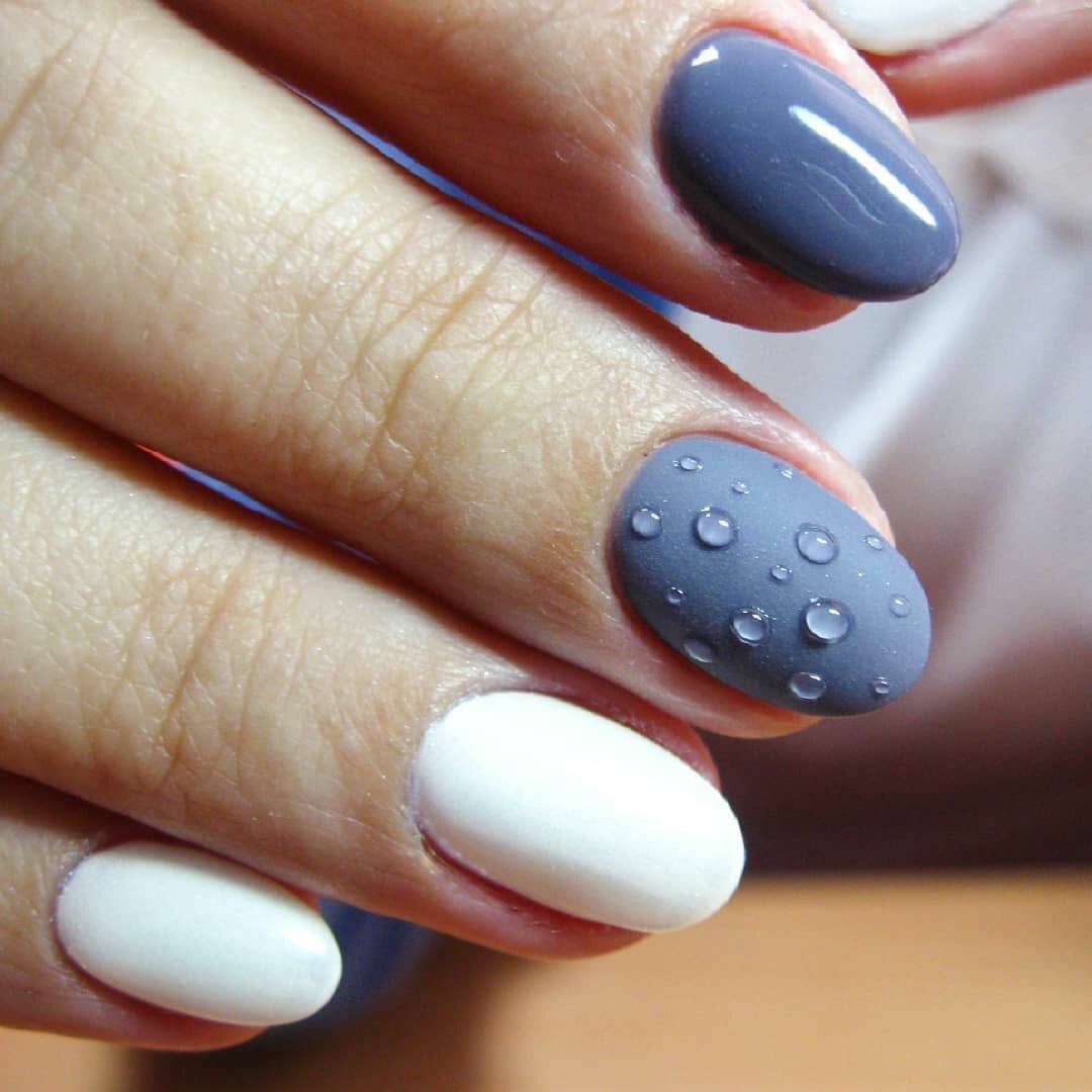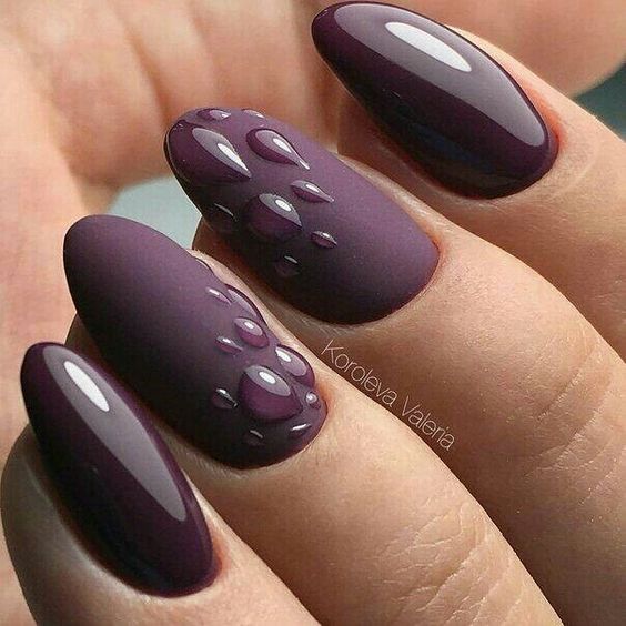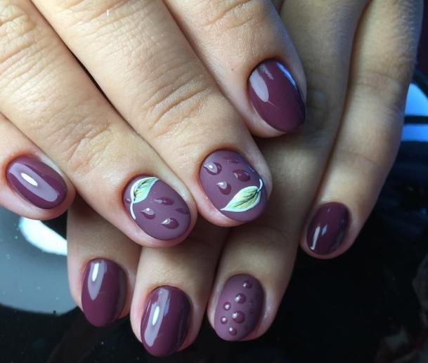 Мастера нейл-арта рекомендуют сделать однотонный матовый маникюр в любимом оттенке, украсить один пальчик на руке растительными или романтическими рисунками и добавить поверх покрытие с капельками воды. Вы сразу увидите, как дизайн заиграет новыми красками.