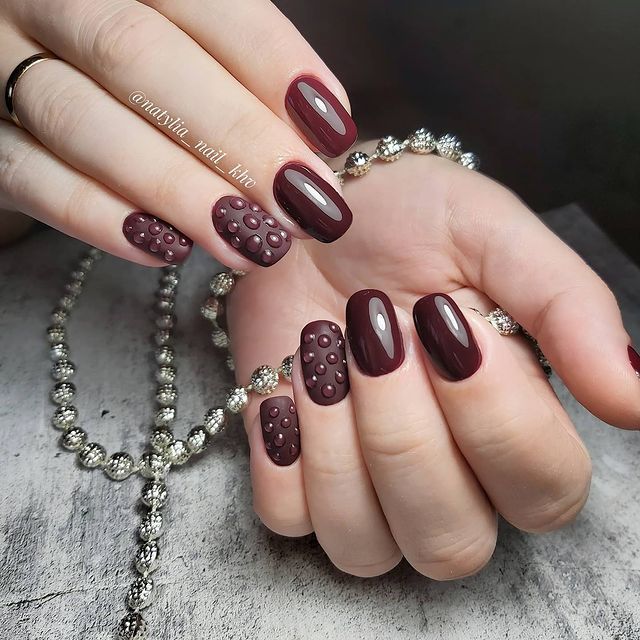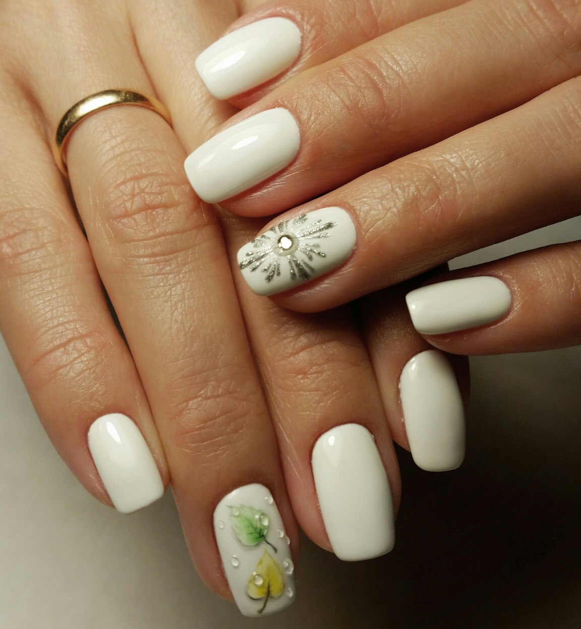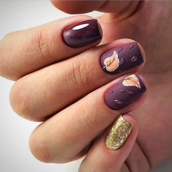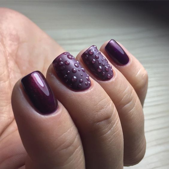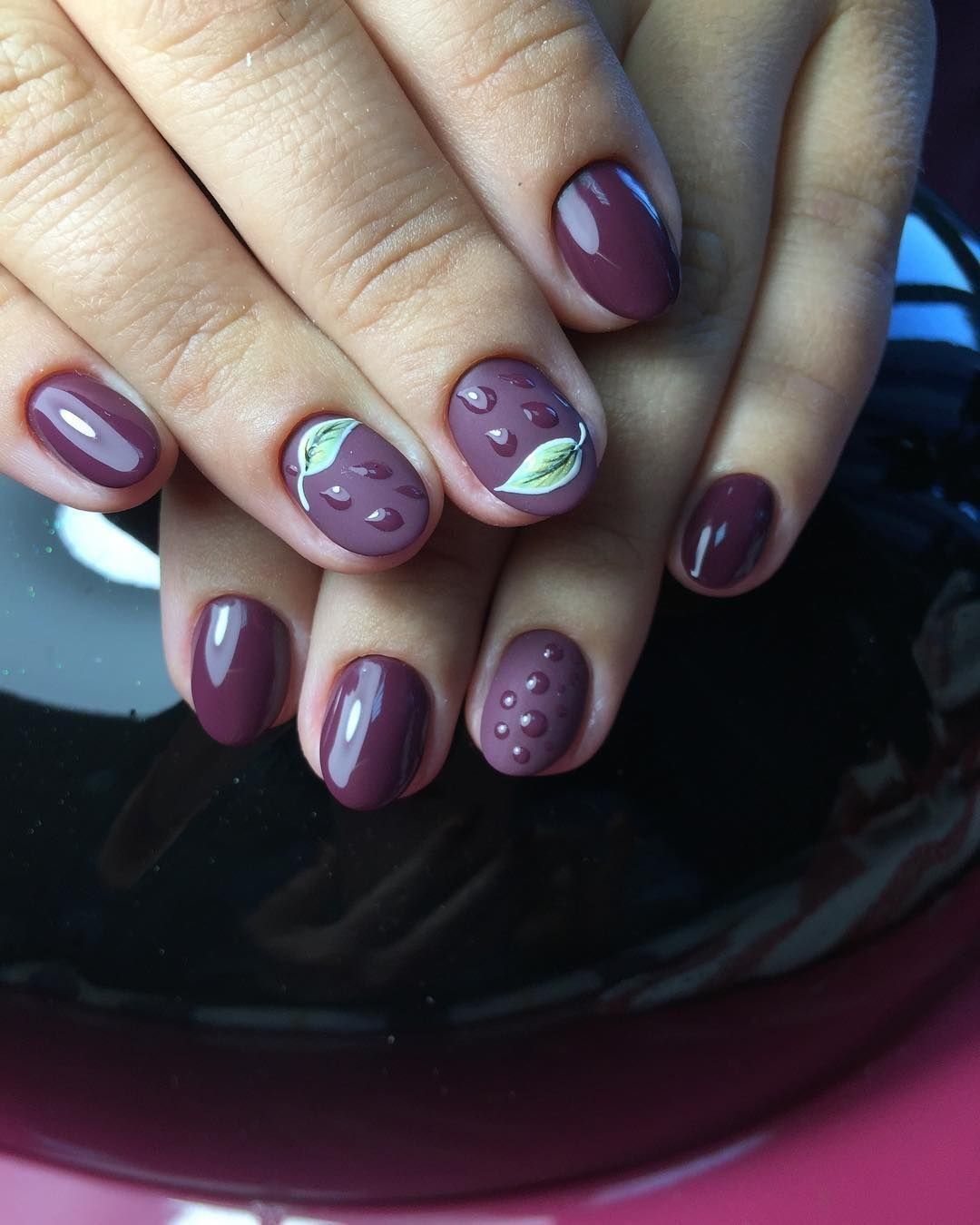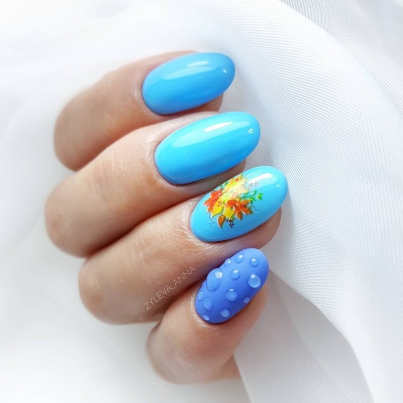 Мастера нейл-арта рекомендуют сделать однотонный матовый маникюр в любимом оттенке, украсить один пальчик на руке растительными или романтическими рисунками и добавить поверх покрытие с капельками воды. Вы сразу увидите, как дизайн заиграет новыми красками.