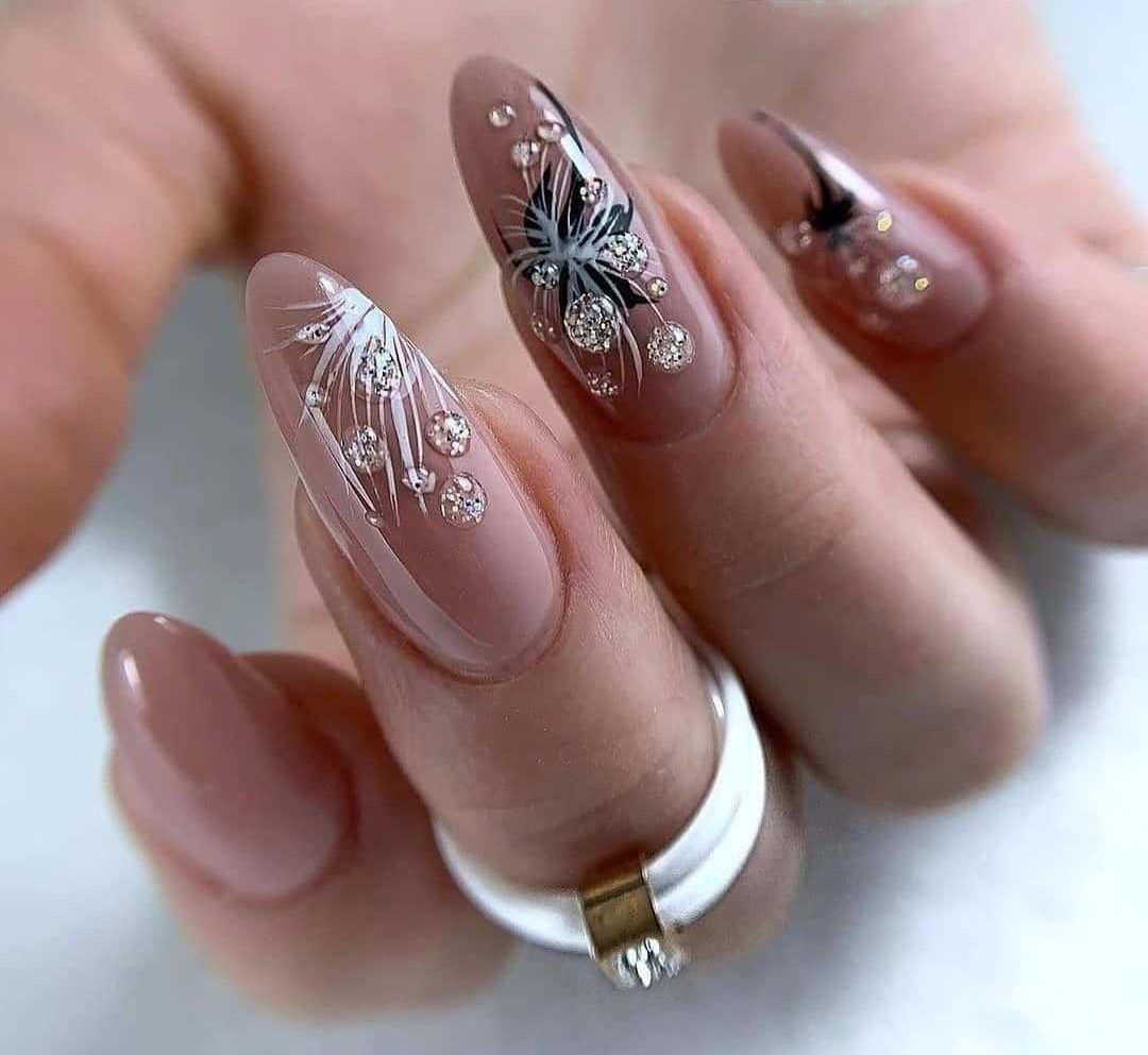 Совет: прозрачные капельки можно использовать для выделения части рисунка, заменив ими слишком активные стразы. Например, части одуванчика или снежинки. Просто нанесите прозрачный топ на части трафарета или рисунка, подождите пока высохнет и дизайн готов. Кстати, чтобы рисунок выглядел более объемным, под топ можно нанести фольгу или блестки.
