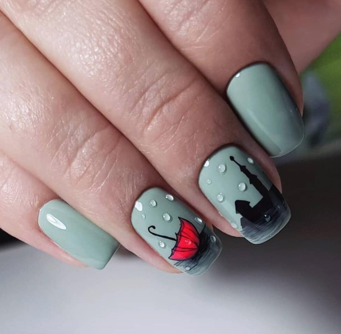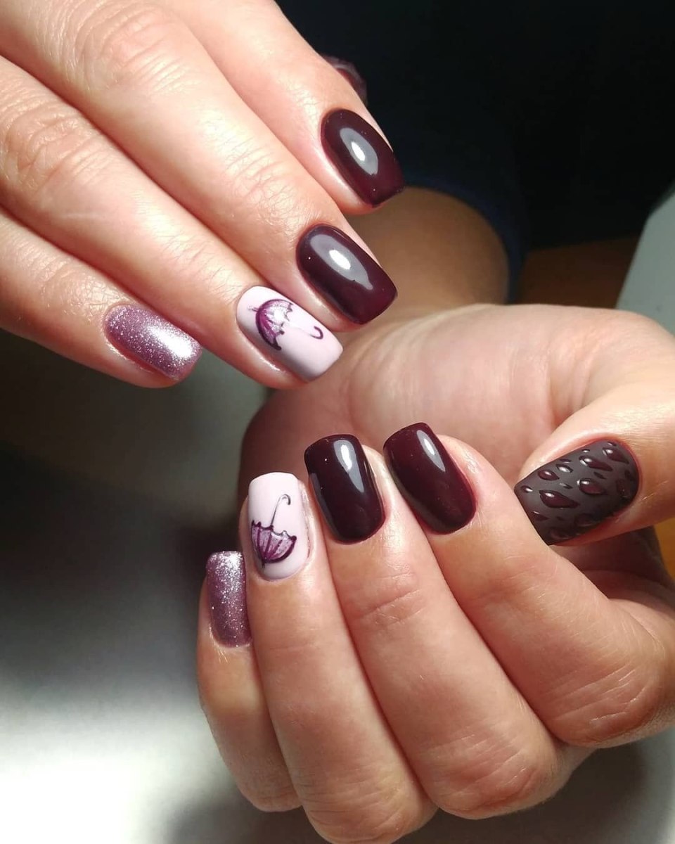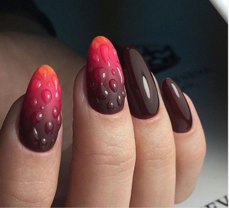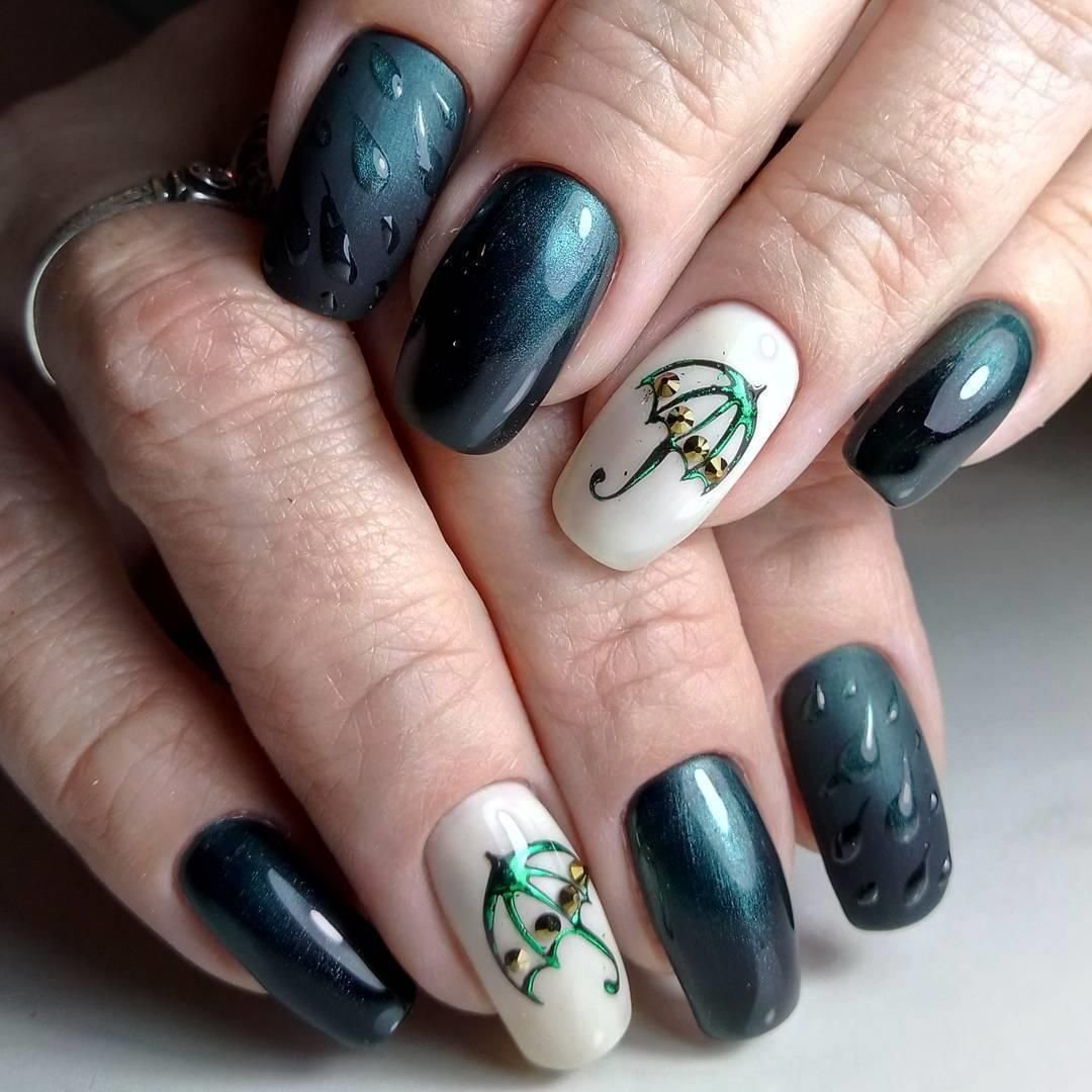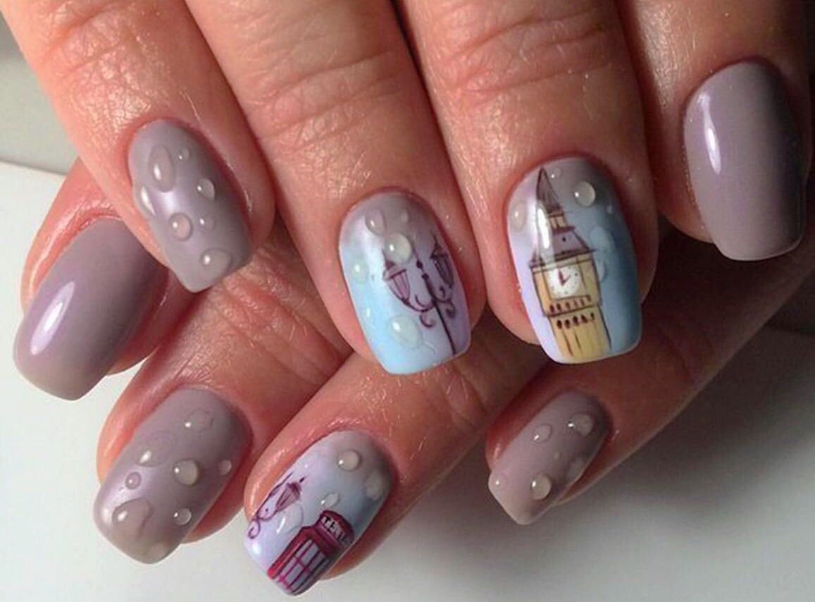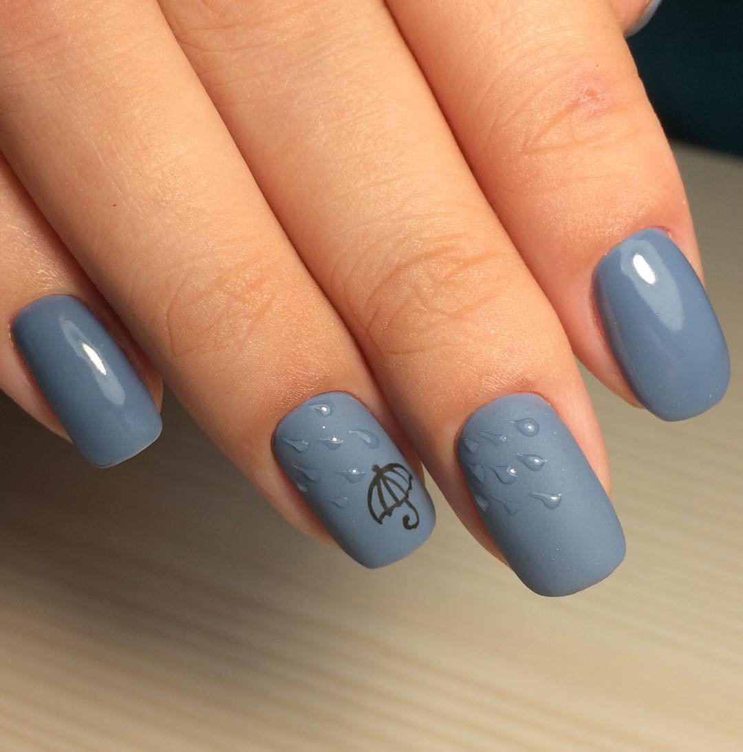 Маникюр с каплями дождя, скорее всего, появился именно как дополнение к рисункам на ногтях. Можно ли представить осенний маникюр с зонтиком или оранжевыми листьями без стекающих водных потоков? Конечно, нет. Капли добавляют декора натуральности. Создается эффект словно вы смотрите через окно на улицу. А для летнего маникюра капельки помогают создать эффект свежести.