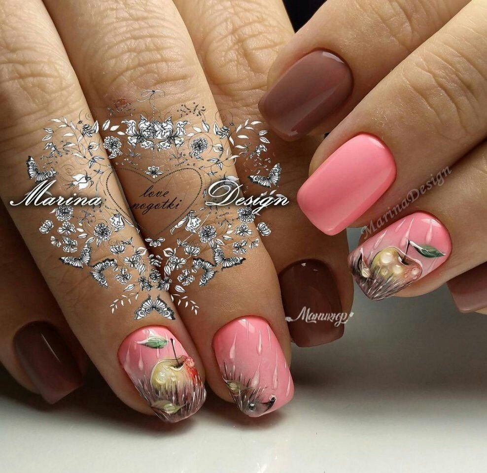 Какие рисунки выбрать для маникюра с брызгами? Любые! Это могут быть зонтики, растительные мотивы, фрукты и ягоды, романтичные виды.