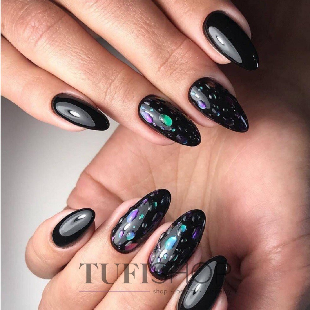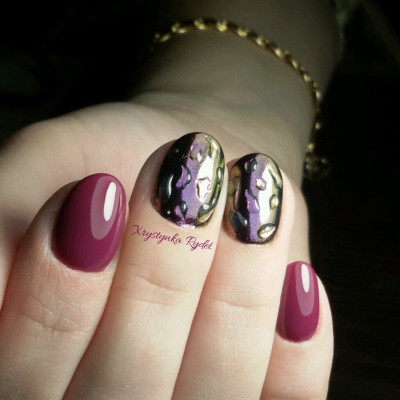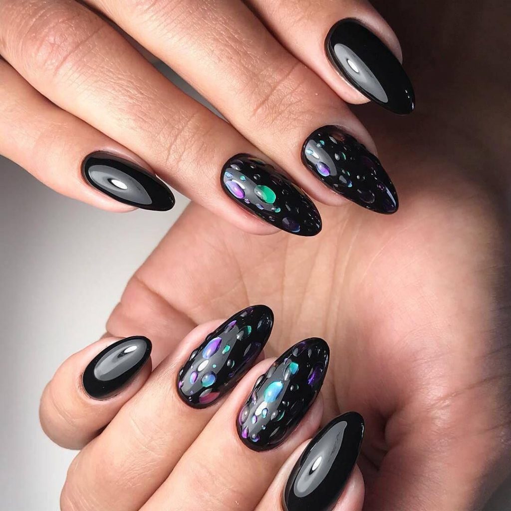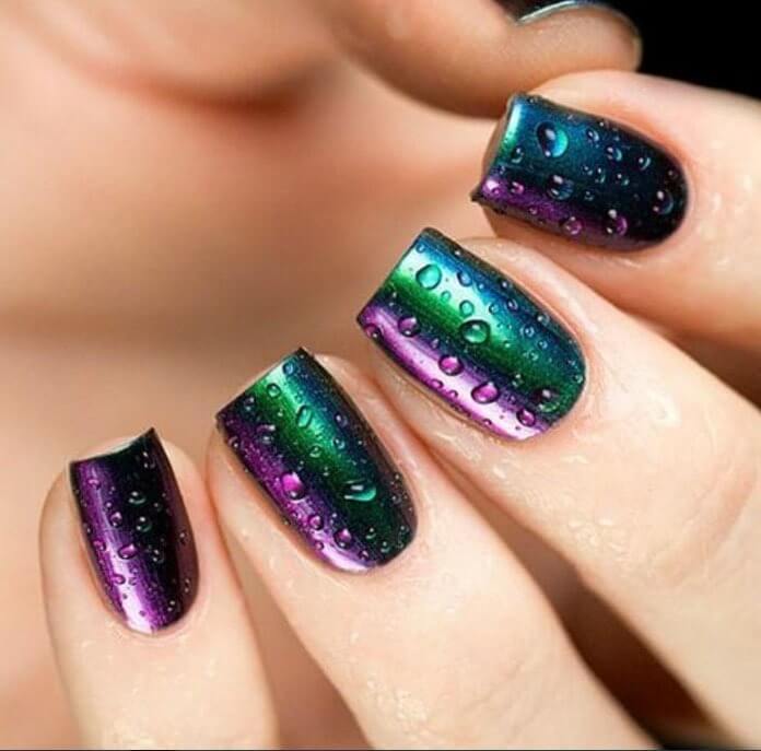 Еще один очень активный вариант дизайна ногтей, который плохо уживается с рисунками, стразами и другими подобными вариантами декора. А вот капли на голографической или металлической поверхности смотрятся эффектно и загадочно. Мастера рекомендуют оформлять таким образом один или два ногтя на руке, чтобы избежать излишества и чрезмерности.