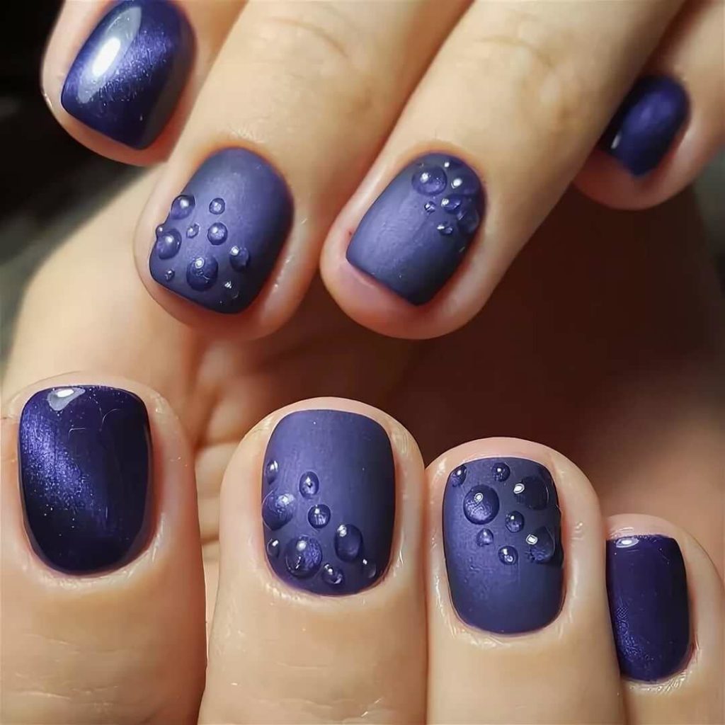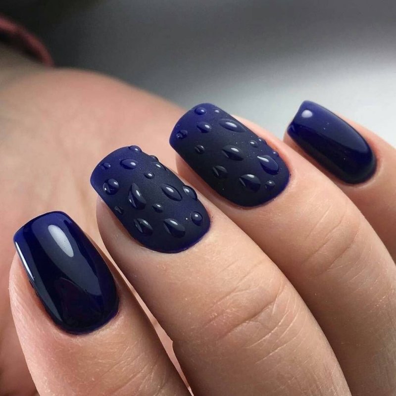 Блестящая глянцевая основа для водяных капель — смотрится эффектно и стильно. Интереснее смотрится вариант с матовой базой, когда капельки словно стекают с бархатной поверхности. Лучше выбирать темные лаки для такого декора, чтобы яркий блеск капелек был сразу заметен.