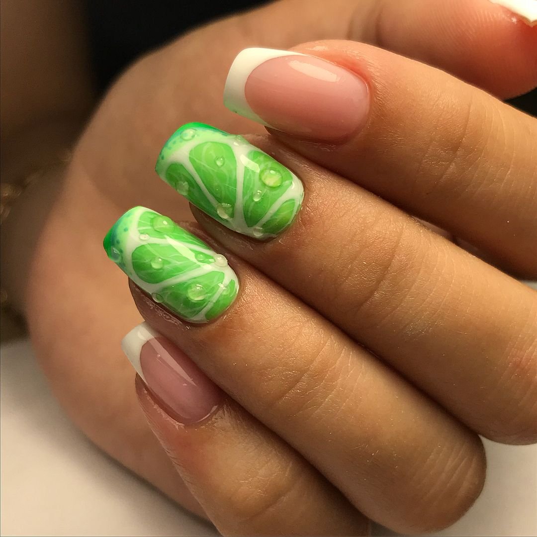 Вы заметили, что практически не одна подборка не обходится без французского маникюра? Это неудивительно. Ведь именно современная вариация френча адаптируется под большинство техник и удачно сочетается с любыми видами декора. Как сочетать капли воды и френч? Все просто, выбирайте цветные варианты французского дизайна, сочетайте его с однотонным покрытием ногтей и добавляйте немного влаги. Ваш идеальный маникюр готов.