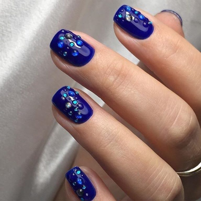 Капельки — один из самых простых способов украшения пластины небольшой длины. Один из самых эффектных вариантов — матовое темное покрытие и яркие брызги воды на ногтях. Но стоит учесть, что чем короче длина, тем мельче должны быть капельки. В противном случае они будут смотреться громоздко и отвлекать на себя внимание. А маникюр будем выглядеть вычурно и искусственно.