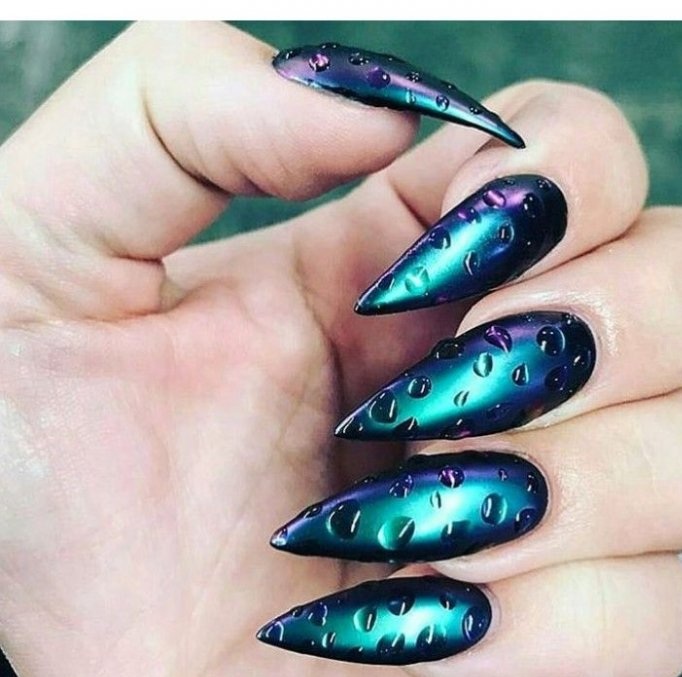 А вот на длинных ногтях такой дизайн можно использовать практически без ограничений. Здесь можно дать волю фантазии и разместить капельки разного размера и формы. На большой длине брызги воды можно комбинировать с довольно активными видами покрытия — кошачьим глазом, втиркой или хамелеон. Удивительно, но капли воды делают такое покрытие более спокойным и благородным.