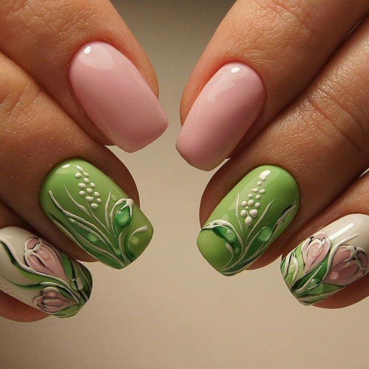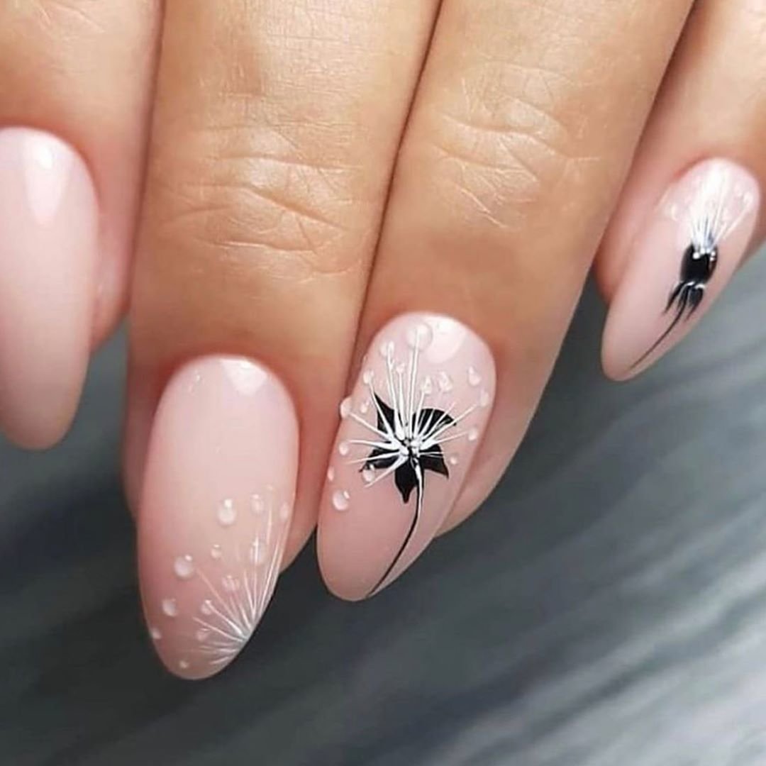 Скоро наступит весна, поэтому наиболее актуальными вариантами рисунков будут растительные мотивы — цветы, листья, веточки. Они отлично сочетаются с капельками воды, которые придают маникюру естественность и необычность.