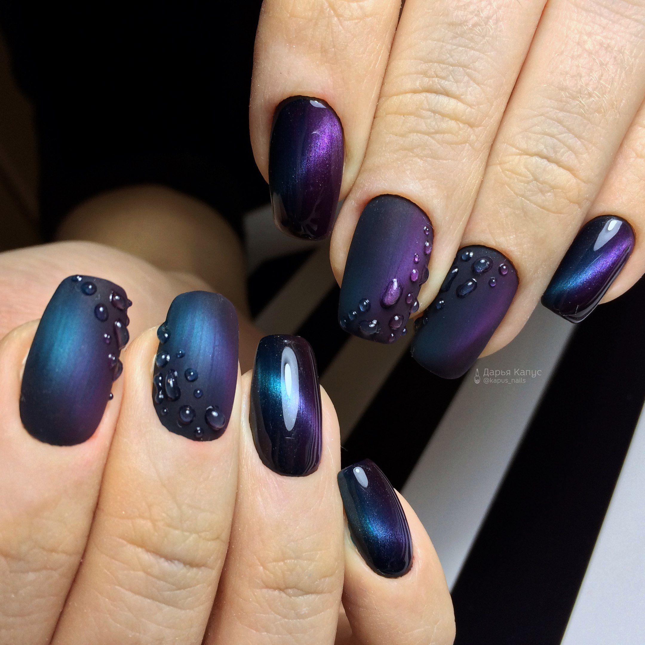 Магнитные лаки быстро завоевали любовь модниц по всему миру. И это неудивительно, ведь с помощью магазинного средства теперь можно создавать уникальные глубокие дизайны ногтей. И ходить для этого в салон необязательно. Хотите немного разнообразить покрытие? Добавьте капель и оно станет необычным и очень стильным. Это хорошая идея, ведь техника кошачий глаз — довольно капризна и плохо уживается с другими вариантами дизайна. А вот с брызгами воды прекрасно.