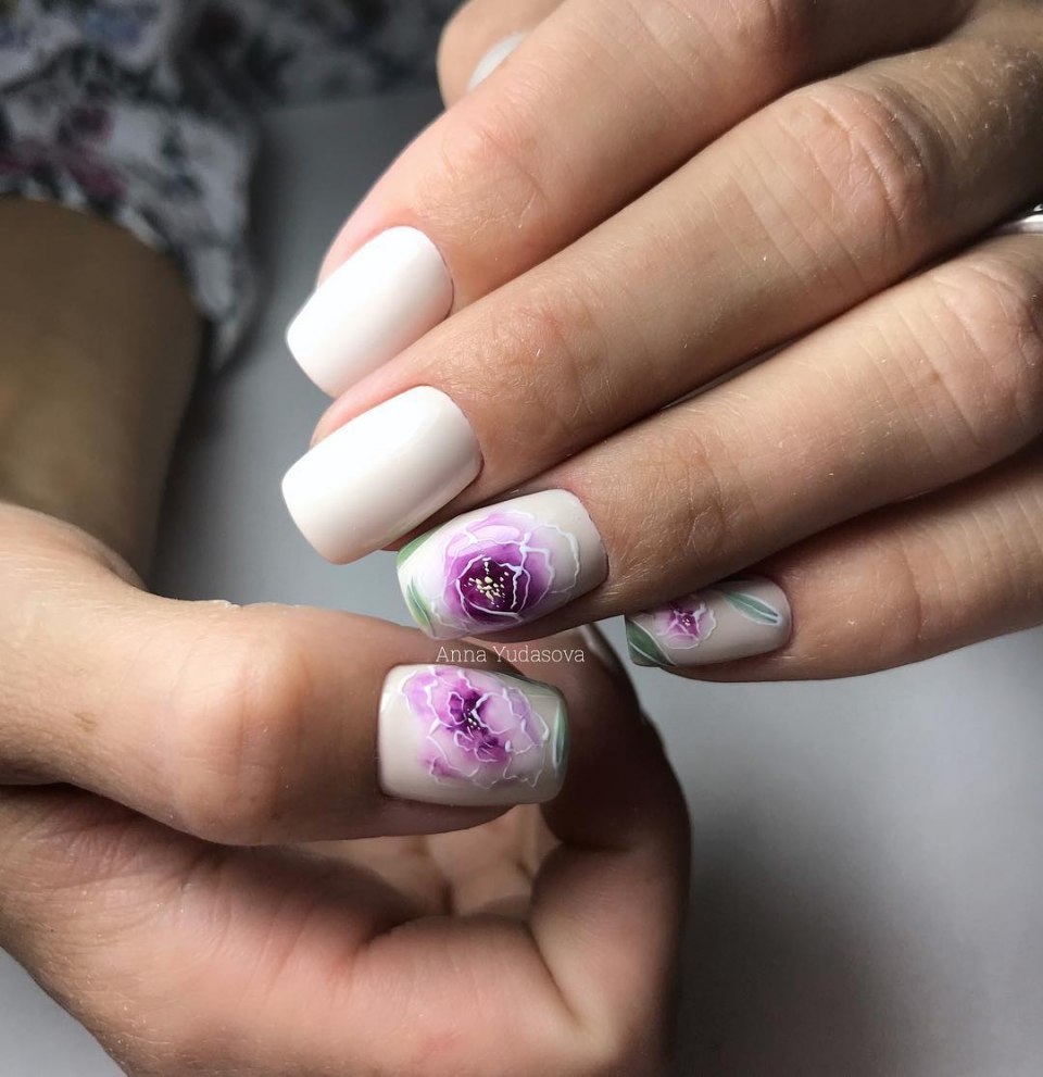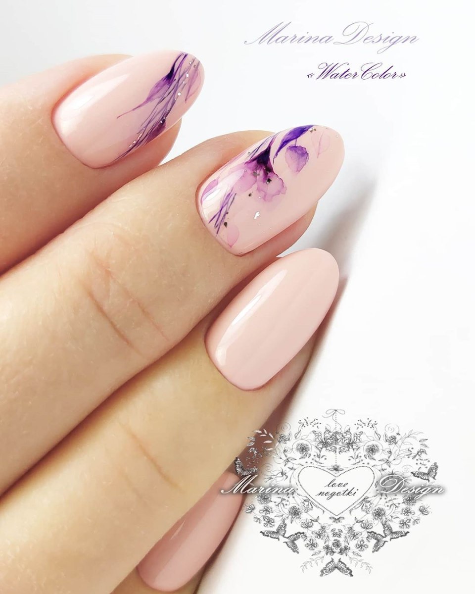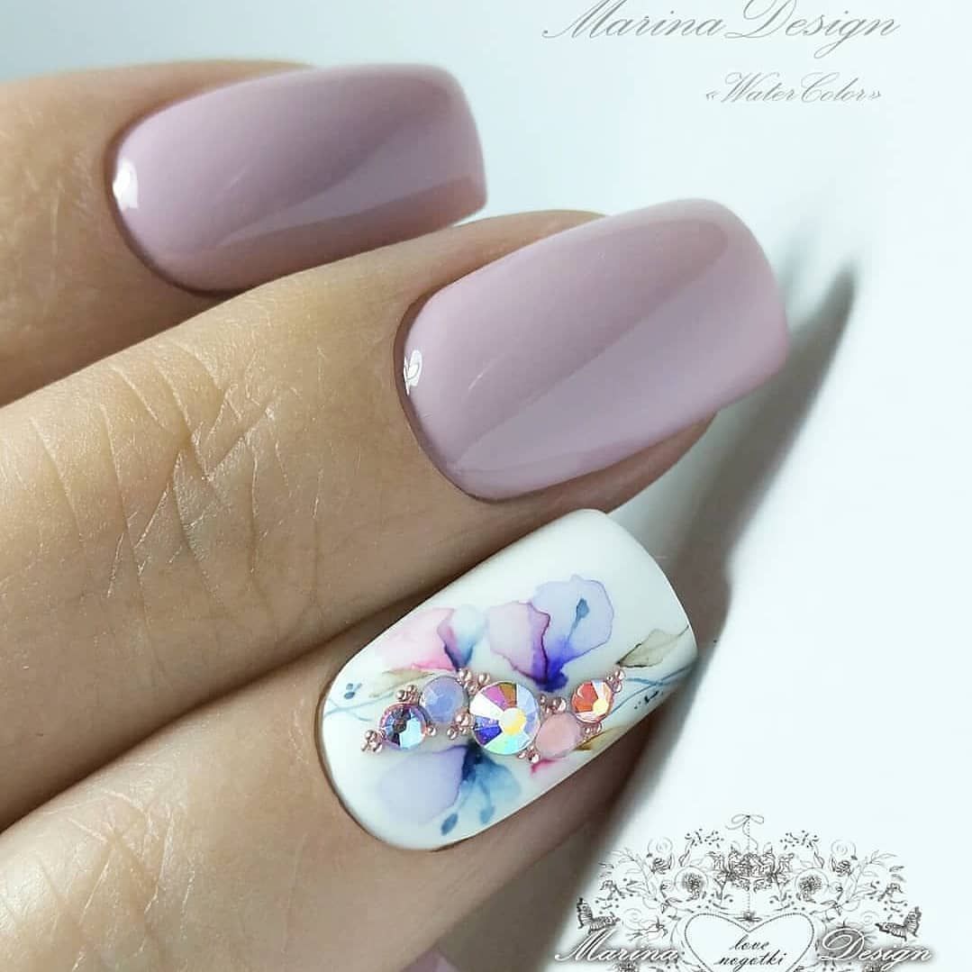 Маникюр с молочной базой и акварельными рисунками — это стильный и нежный вариант дизайна ногтей. Молочная база создает эффект естественного и здорового цвета ногтей, при этом является идеальным фоном для акварельных рисунков. Последние создаются с помощью разбавленной краски и кисточки, которая позволяет создавать нежные переходы и оттенки на ногтях. Результатом такого маникюра будет уникальный и оригинальный дизайн, который привлечет внимание и подчеркнет вашу индивидуальность.