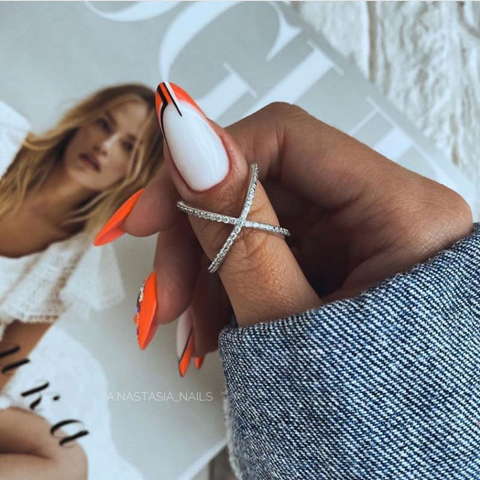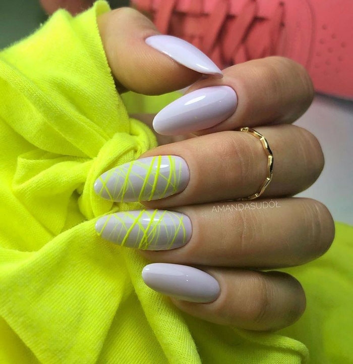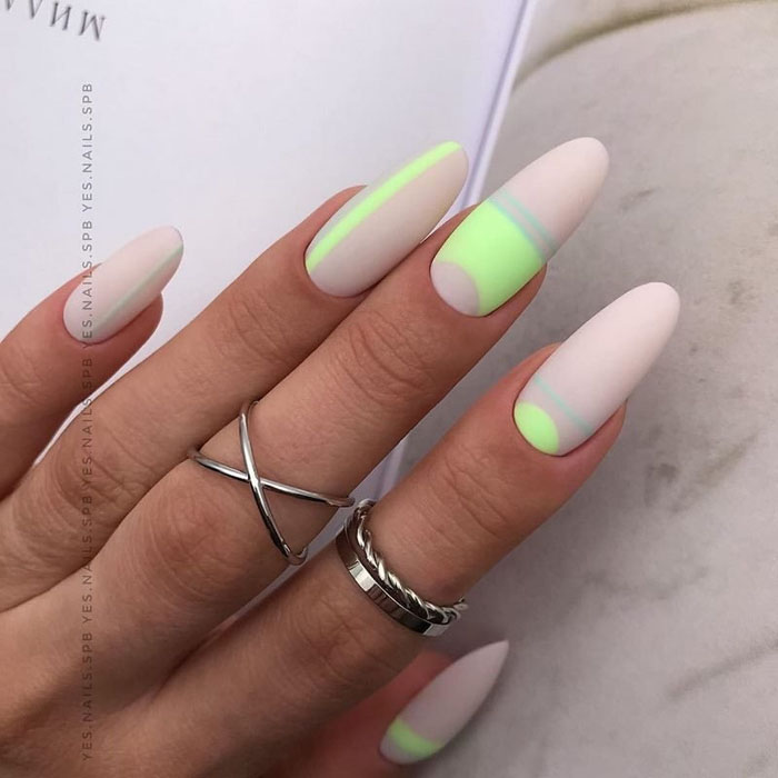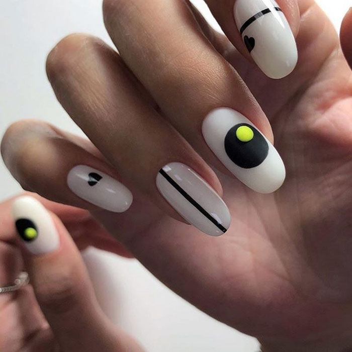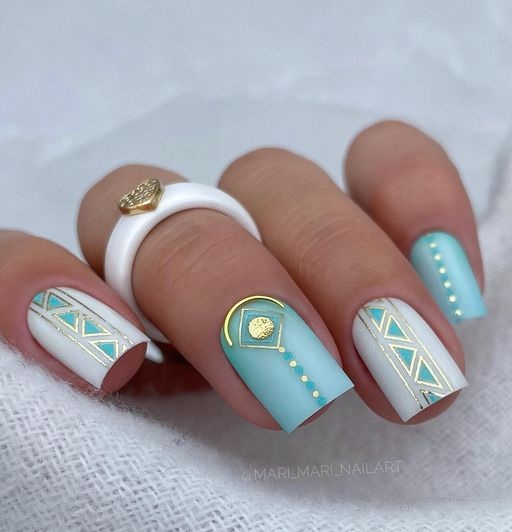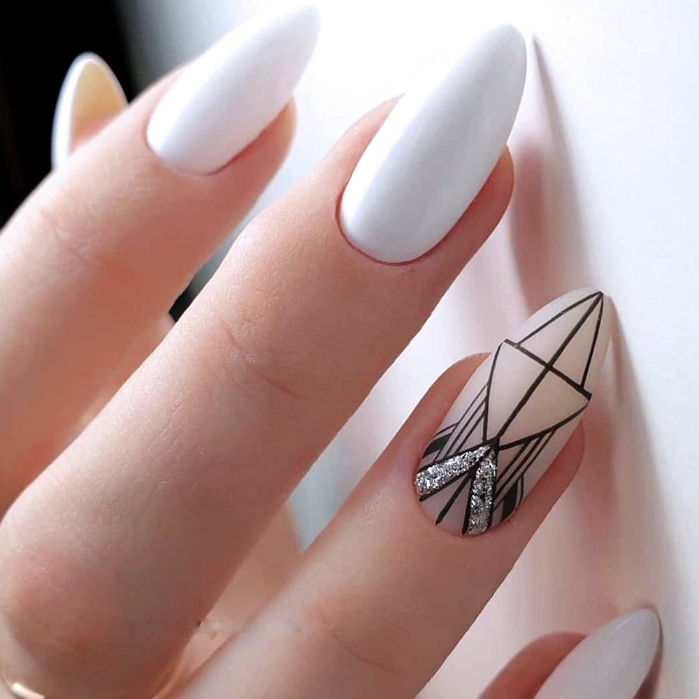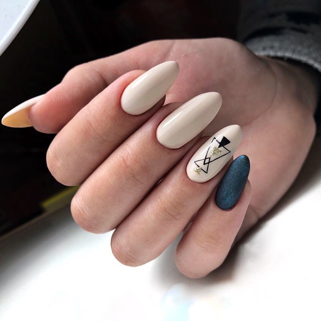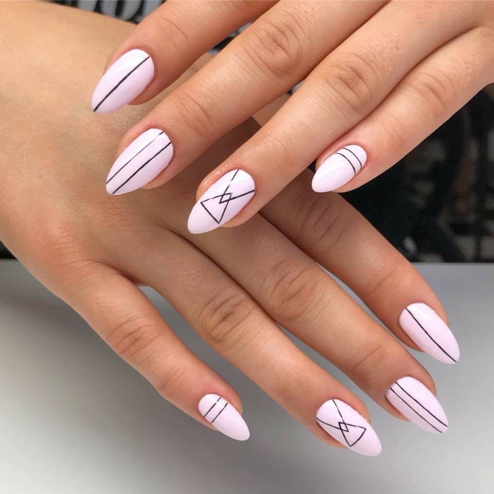 Такой маникюр можно выполнить с помощью различных техник и приемов. Например, можно использовать наклейки с геометрическими узорами или нанести рисунки с помощью гель-лака и тонких кистей. Варианты геометрических рисунков могут быть самыми разнообразными – это могут быть треугольники, полосы, ромбы, квадраты и т.д.