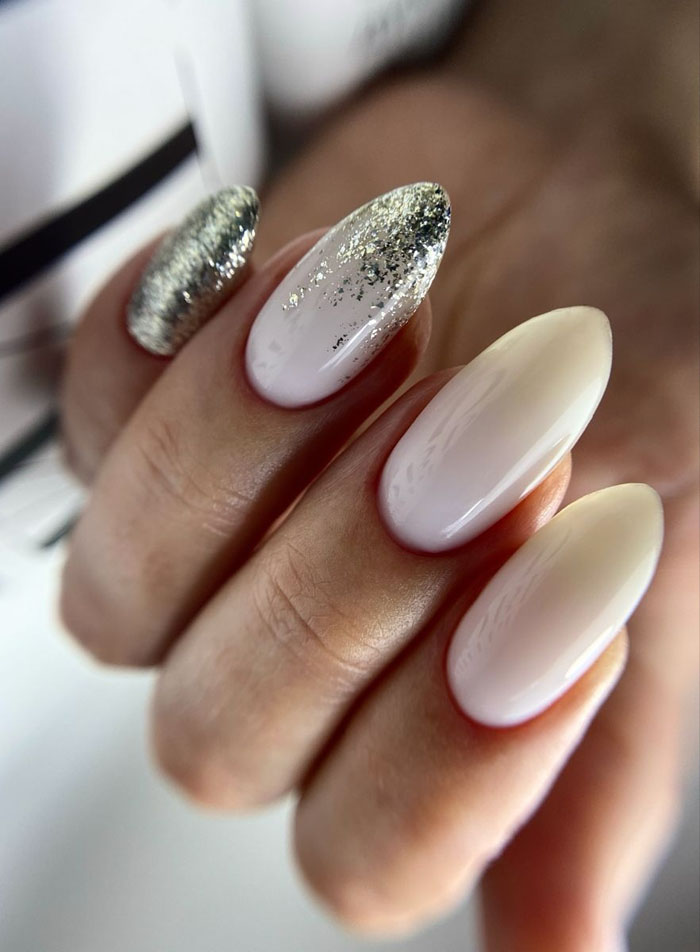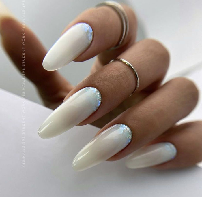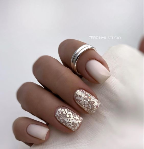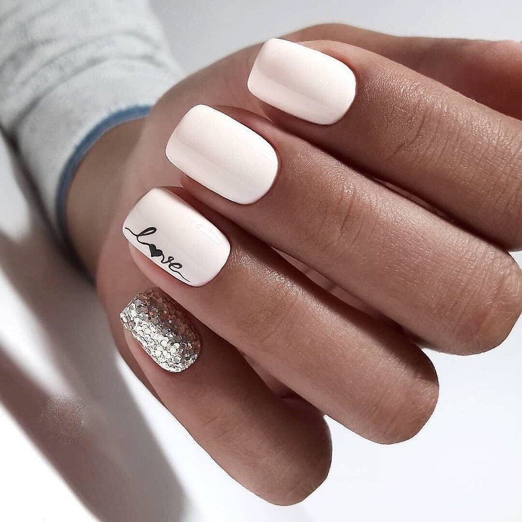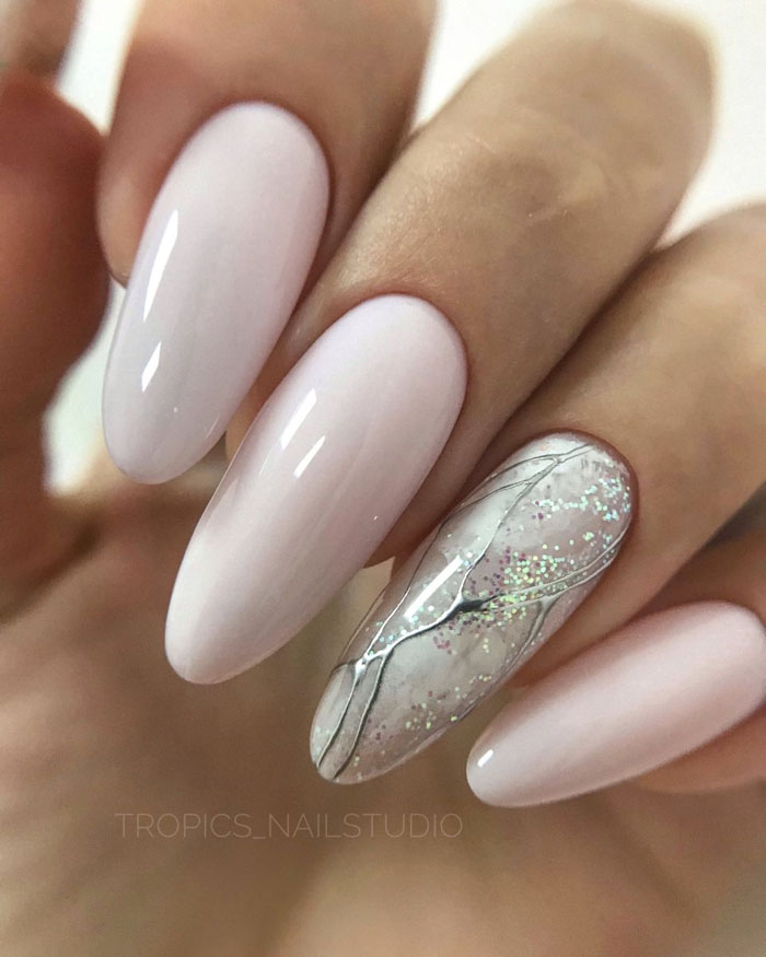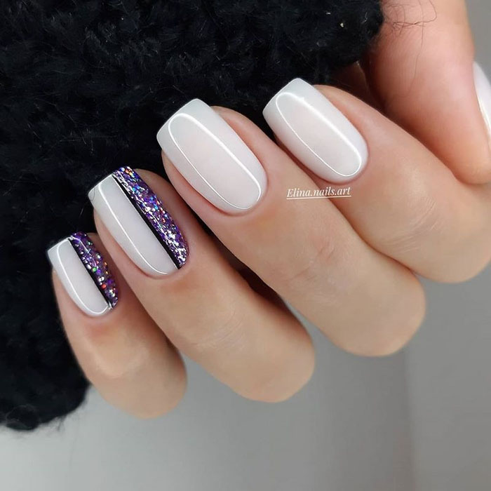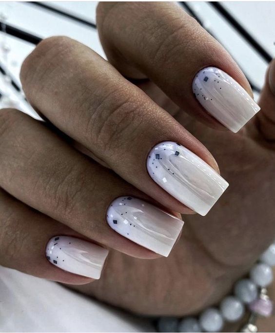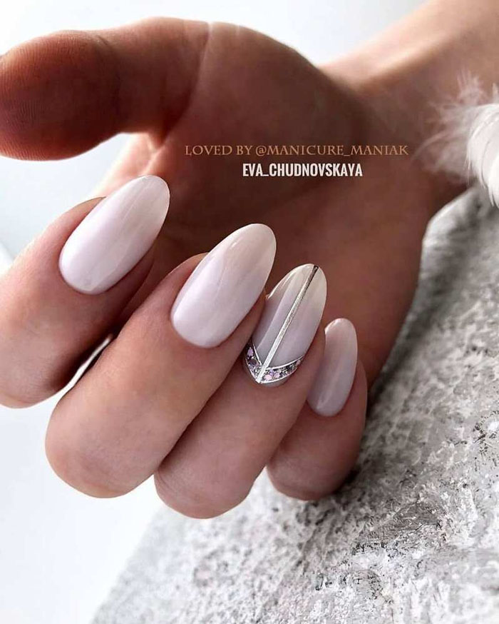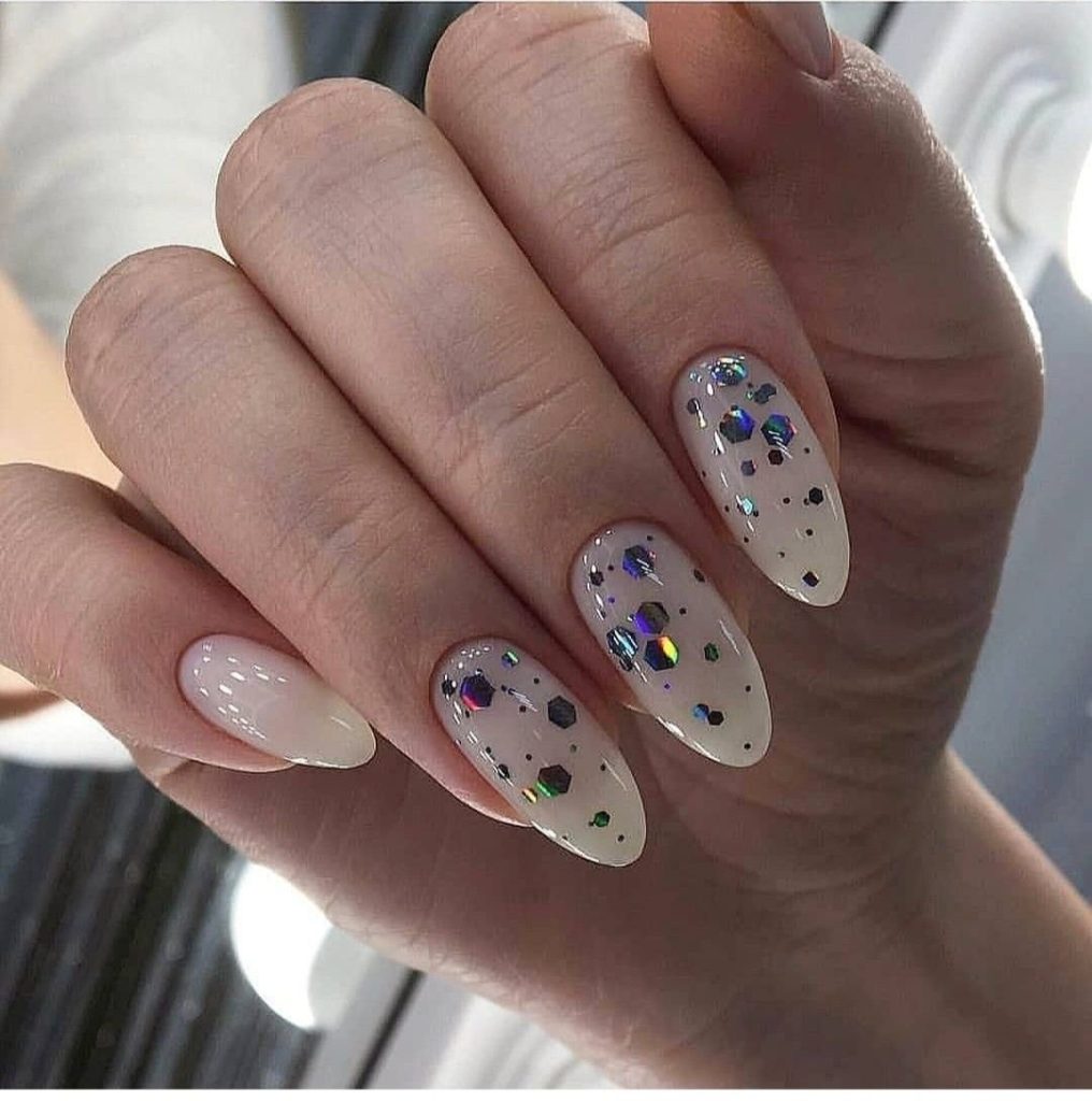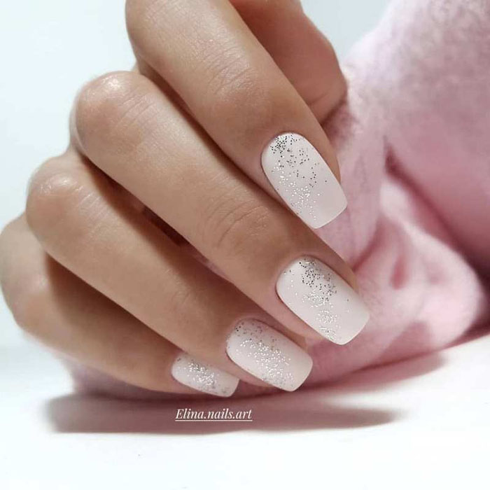 Молочная база с блестками — простой. но интересный и стильный вариант маникюра. Вот несколько интересных идей такого дизайна: