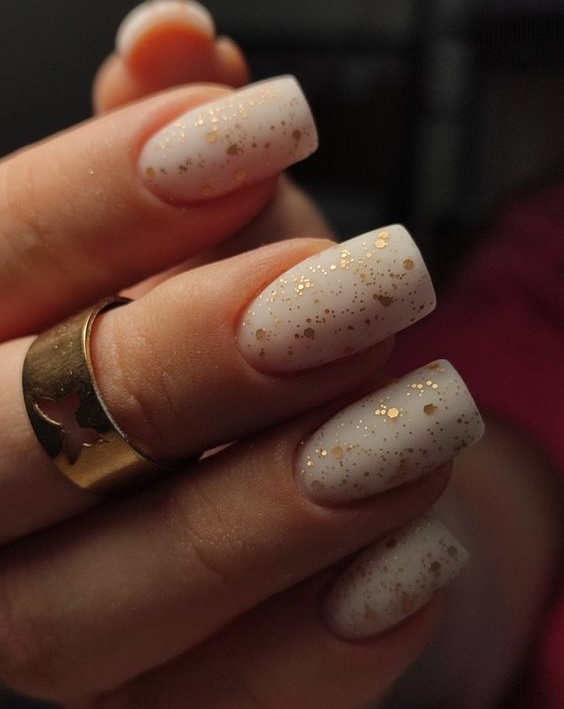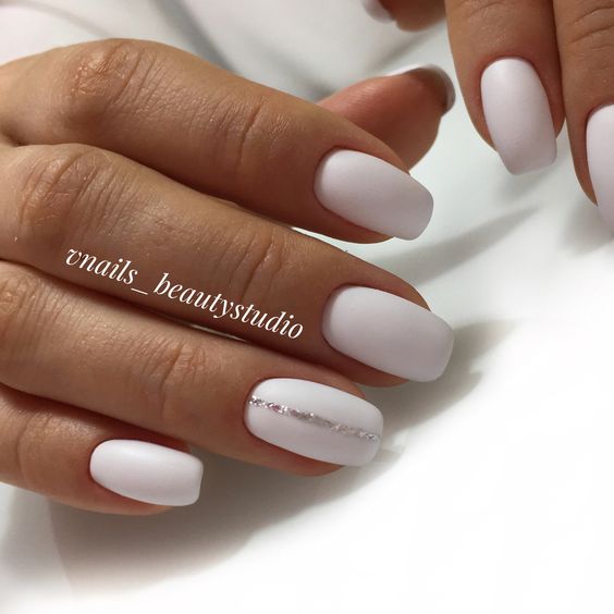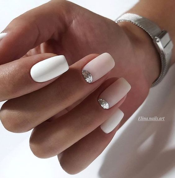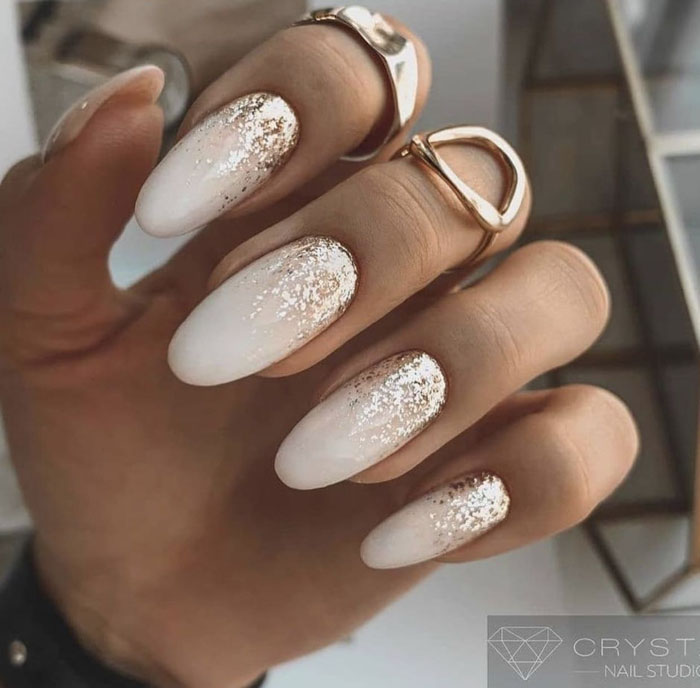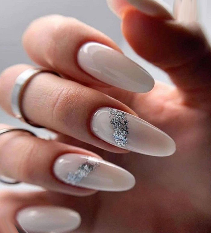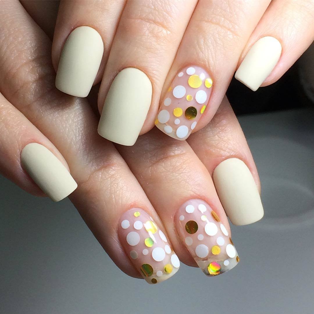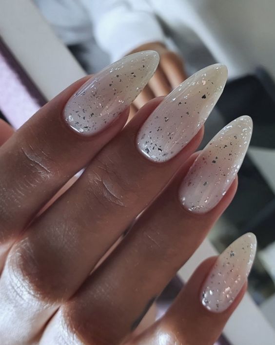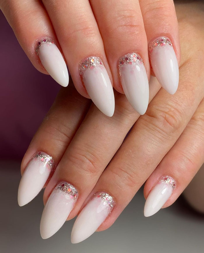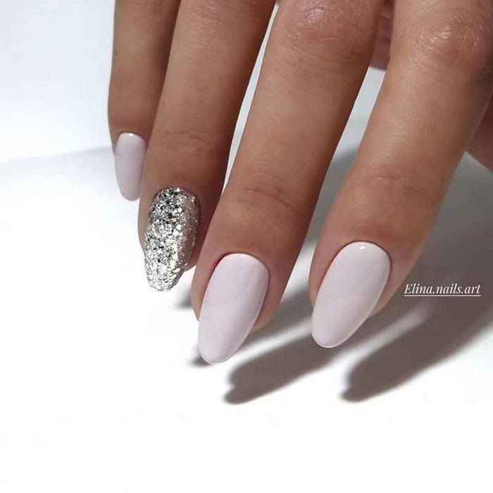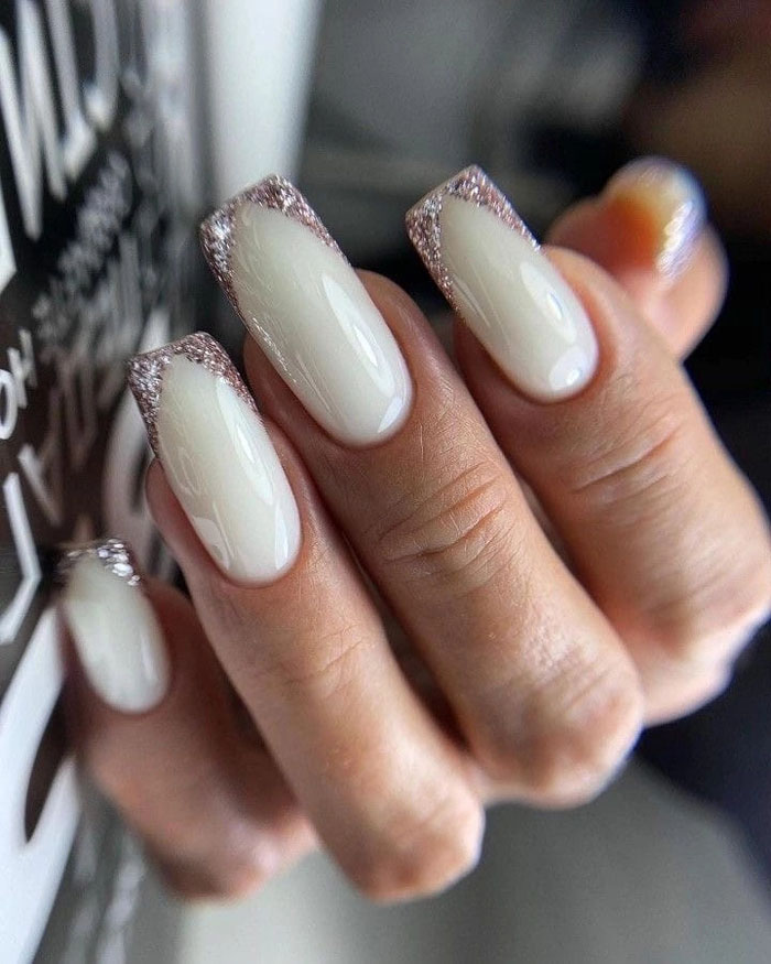 Молочная база с блестками — простой. но интересный и стильный вариант маникюра. Вот несколько интересных идей такого дизайна: