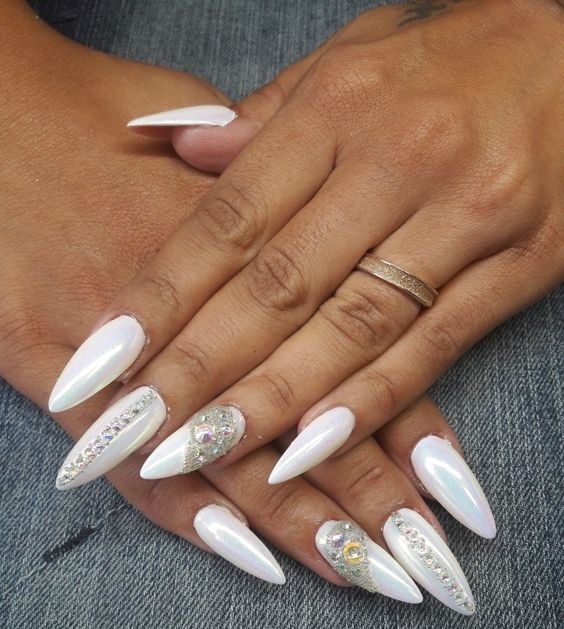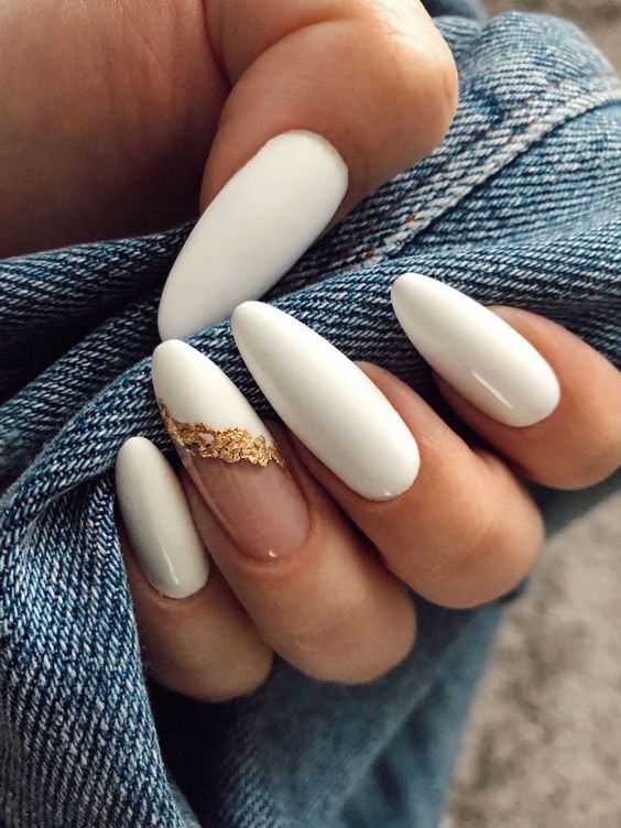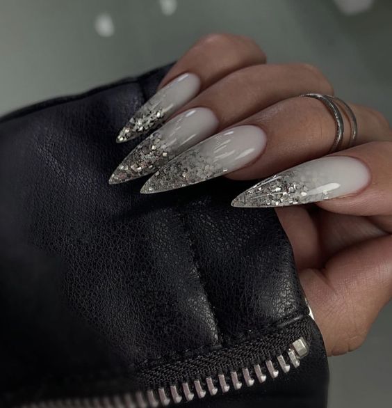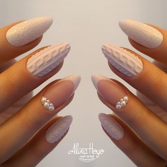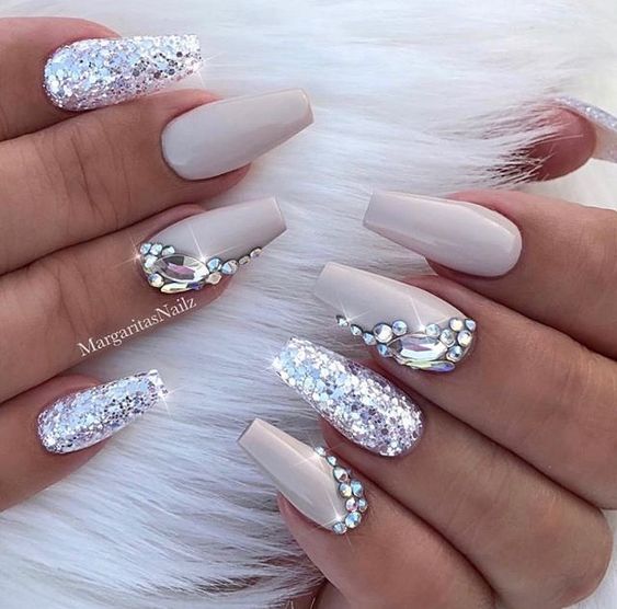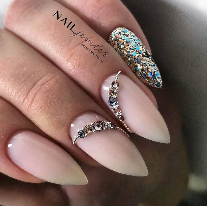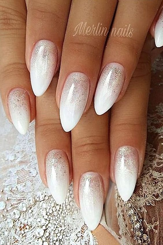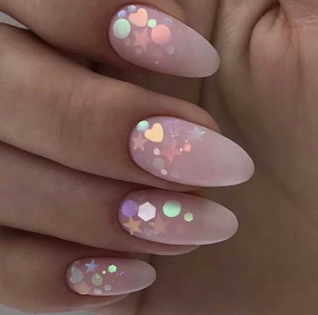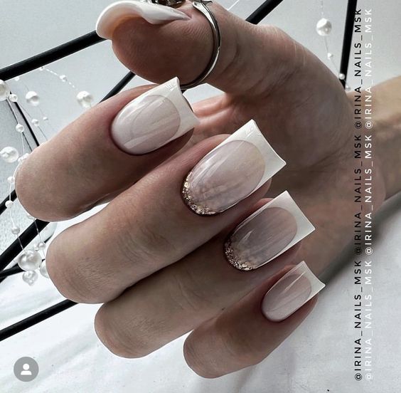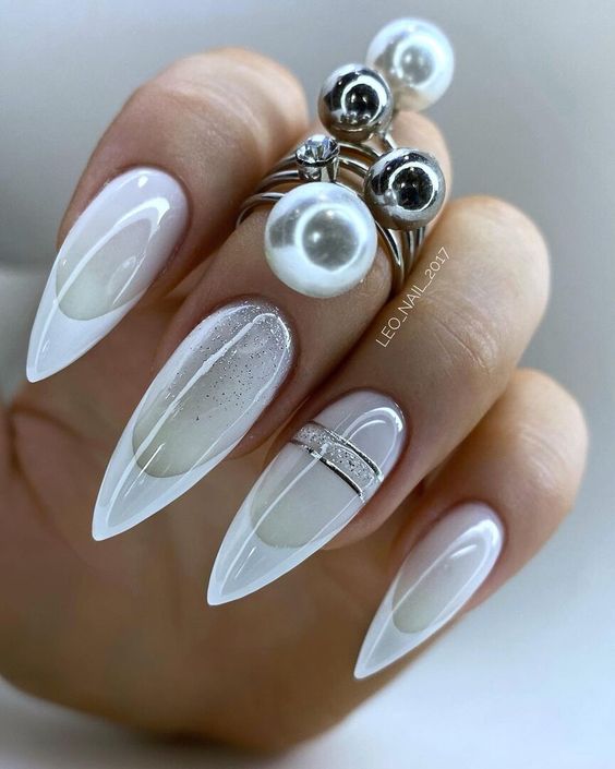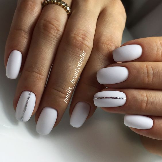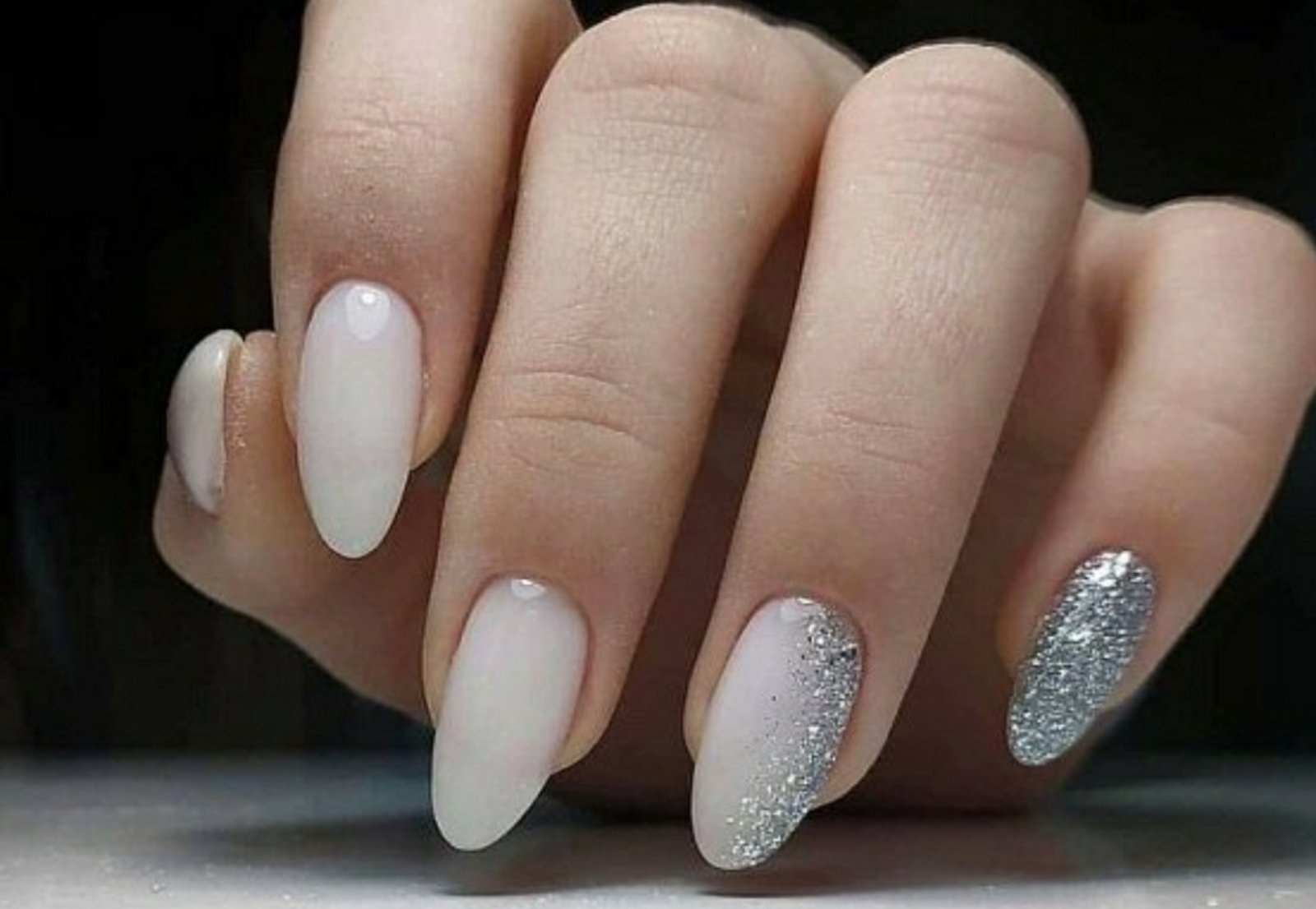 Молочная база с блестками — простой. но интересный и стильный вариант маникюра. Вот несколько интересных идей такого дизайна: