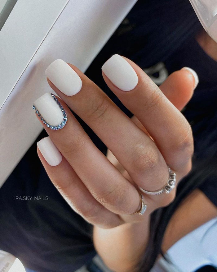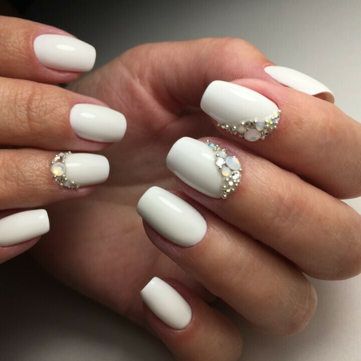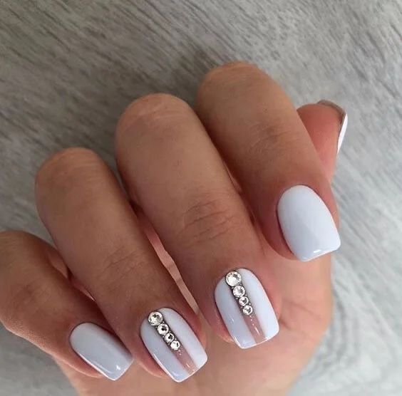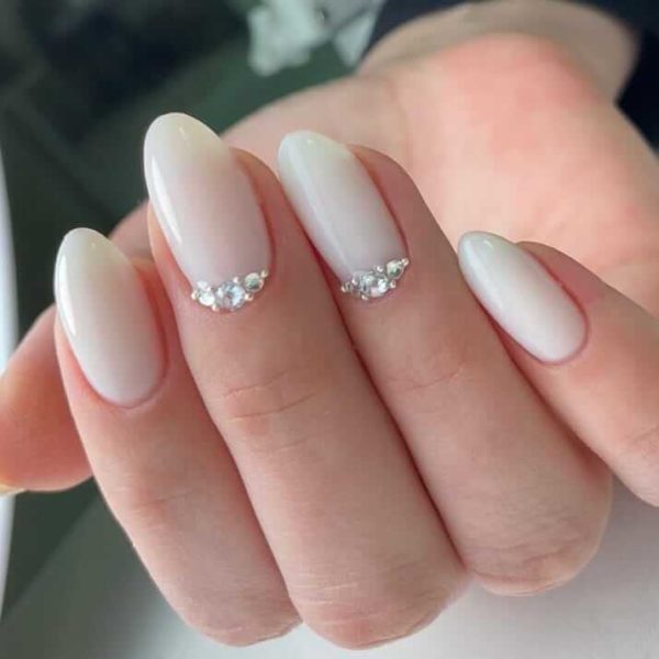 Маникюр с молочной базой и стразами — это стильный и нежный дизайн ногтей. Он включает нанесение молочного оттенка на ногти в качестве основы и декорирование их разноцветными стразами. Такой дизайн придает ногтям элегантность и светящийся эффект, а стразы добавляют игривости и искринок в образ.